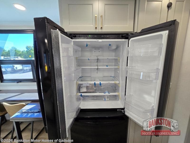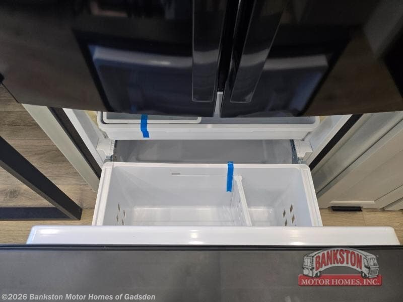 You can't imagine how much this toy hauler has to offer! The garage/outdoor kitchen/office space will allow you to utilize the garage how you need it, plus there is an adjustable tie-down system, as well as a loft for storage and a twin bed to sleep more campers! The garage patio with a 1,500 lb. capacity is another feature you are sure to love, especially with its own awning to keep you protected from the elements. Head to the kitchen to prepare meals with a 24" GE oven with a four burner range, a GE microwave with an air fryer, plus a spacious GE Energy Star 19 cu. ft. refrigerator. The island with two stools will let others visit with you while you cook, and there are even dog bowls to easily feed Frodo. You'll find the convertible dining table/L-desk will be accommodating since it can be use to dine at, and to get some work done. You may just find yourselves spending most of your time on the L-sofa in front of the entertainment center with a TV, fireplace and storage. A full bath is up front by the bedroom, and here you'll find a 30" x 42" shower and and pull-out linen storage with a trash bin to keep towels ready to use. After a day outdoors you'll love nothing more than coming back to your own bedroom with a king bed slide out, TV, a walk-in closet, and many more storage spaces. And we haven't even touched on the exterior features, like the 3-way pass-through storage, three power awnings, an air compressor to fill up tires, and the list goes on and on! This is a pre-production preview, all features and layout placement subject to change.