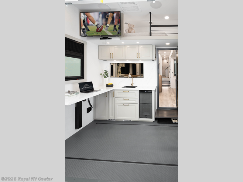 With any Model G toy hauler fifth wheel by Brinkley you will enjoy luxurious amenities, tons of storage space, and innovative features that have been developed and tested in the real world. Durable construction includes an industry leading PDI process, an industry best insulation package, and reinforced and walkable slide roofs. Some of the exterior features you'll find are a 3-way pass-through with a multi-functional flip-up bulkhead wall, under I-beam storage, a MAX-Vision reverse lighting system, and a low-maintenance roof to name a few. A Rockford Fosgate audio system comes standard, along with a Full app-based coach control system (iOS & Android) that lets you control your fifth wheel's functions right from your mobile device. You will find the solar system with a designated storage area to be ultra convenient, plus there is a FlexPower 5500 with a dual fuel inverter generator for all your power needs. Head inside to find a residential interior with Brinkley's CraftSense wood trim construction, floating entrance steps, integrated window screens and insulated blackout blinds, and residential solid surface countertops plus backsplash. You will also enjoy the neon shower lighting and recessed medicine cabinets in the bath, plus motion activated LED bed lights and dual bedside outlets in the bedroom. Choose a Model G toy hauler fifth wheel to experience all the luxury it has to offer!