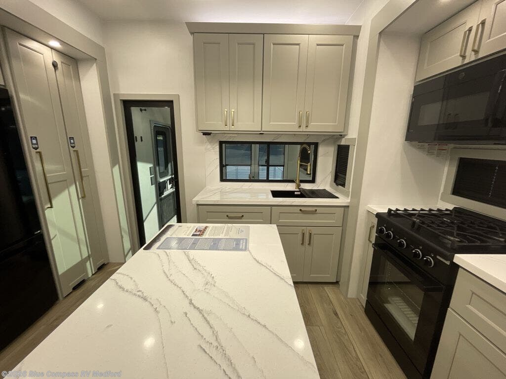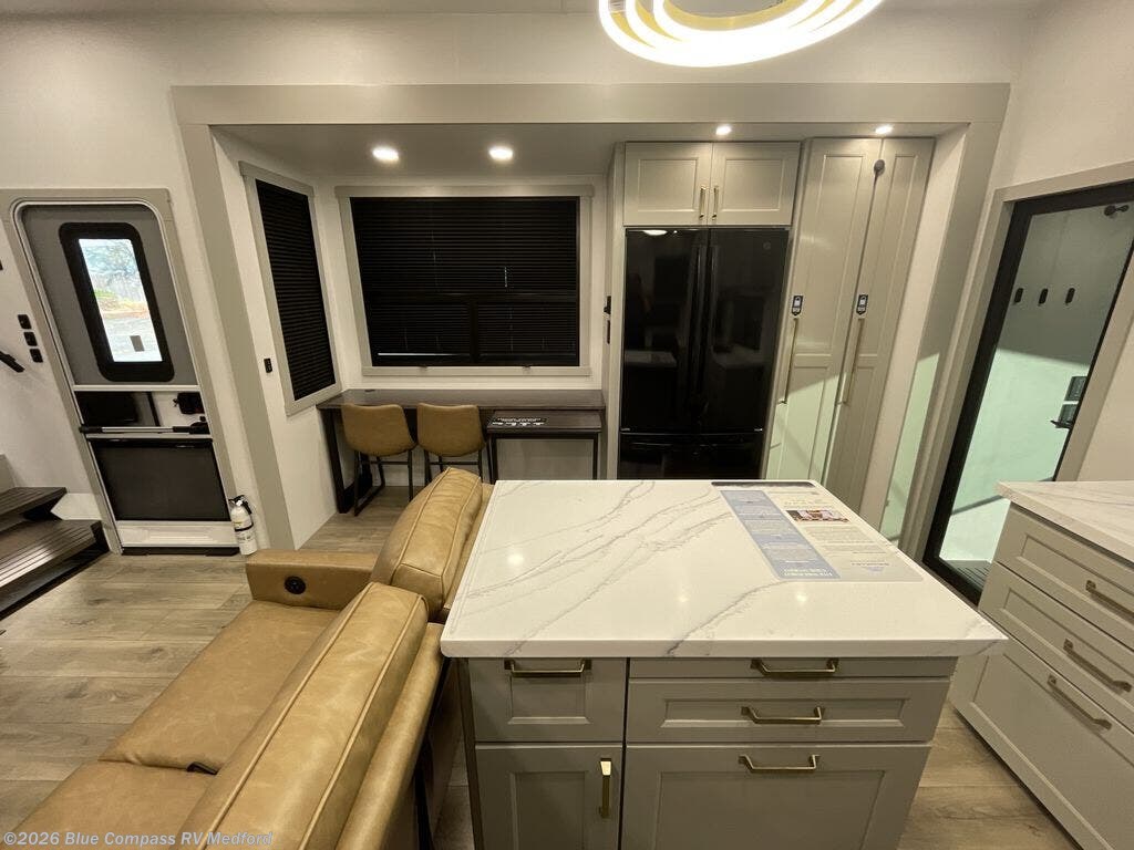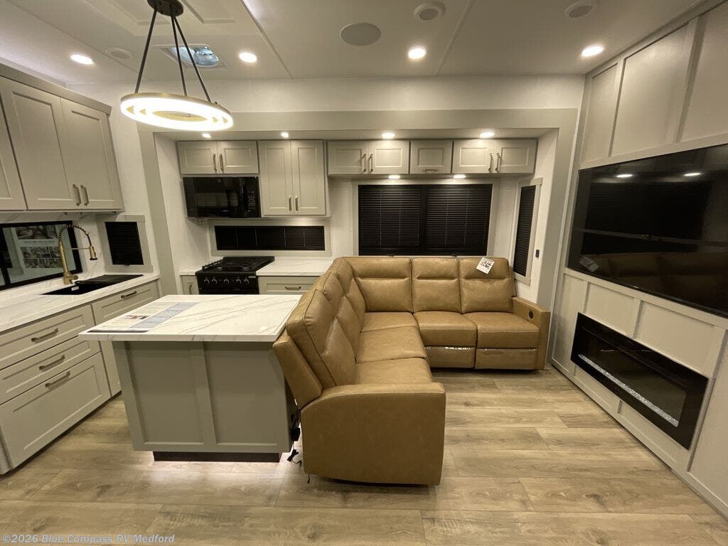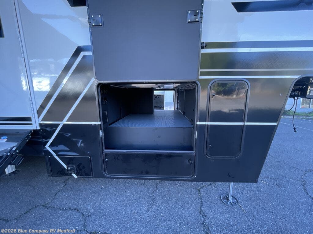 You can't imagine how much this toy hauler has to offer! The garage/outdoor kitchen/office space will allow you to utilize the garage how you need it, plus there is an adjustable tie-down system, as well as a loft for storage and a twin bed to sleep more campers! The garage patio with a 1,500 lb. capacity is another feature you are sure to love, especially with its own awning to keep you protected from the elements. Head to the kitchen to prepare meals with a 24" GE oven with a four burner range, a GE microwave with an air fryer, plus a spacious GE Energy Star 19 cu. ft. refrigerator. The island with two stools will let others visit with you while you cook, and there are even dog bowls to easily feed Frodo. You'll find the convertible dining table/L-desk will be accommodating since it can be use to dine at, and to get some work done. You may just find yourselves spending most of your time on the L-sofa in front of the entertainment center with a TV, fireplace and storage. A full bath is up front by the bedroom, and here you'll find a 30" x 42" shower and and pull-out linen storage with a trash bin to keep towels ready to use. After a day outdoors you'll love nothing more than coming back to your own bedroom with a king bed slide out, TV, a walk-in closet, and many more storage spaces. And we haven't even touched on the exterior features, like the 3-way pass-through storage, three power awnings, an air compressor to fill up tires, and the list goes on and on! This is a pre-production preview, all features and layout placement subject to change.