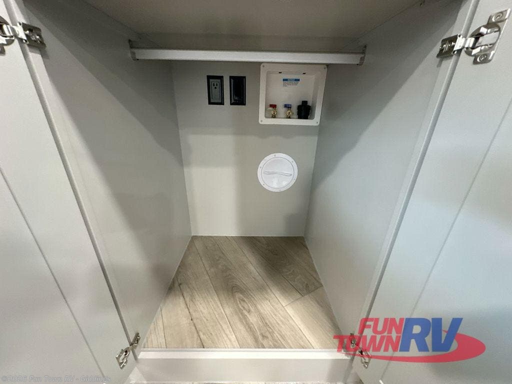 You can't imagine how much this toy hauler has to offer! The garage/outdoor kitchen/office space will allow you to utilize the garage how you need it, plus there is an adjustable tie-down system, as well as a loft for storage and a twin bed to sleep more campers! The garage patio with a 1,500 lb. capacity is another feature you are sure to love, especially with its own awning to keep you protected from the elements. Head to the kitchen to prepare meals with a 24" GE oven with a four burner range, a GE microwave with an air fryer, plus a spacious GE Energy Star 19 cu. ft. refrigerator. The island with two stools will let others visit with you while you cook, and there are even dog bowls to easily feed Frodo. You'll find the convertible dining table/L-desk will be accommodating since it can be use to dine at, and to get some work done. You may just find yourselves spending most of your time on the L-sofa in front of the entertainment center with a TV, fireplace and storage. A full bath is up front by the bedroom, and here you'll find a 30" x 42" shower and and pull-out linen storage with a trash bin to keep towels ready to use. After a day outdoors you'll love nothing more than coming back to your own bedroom with a king bed slide out, TV, a walk-in closet, and many more storage spaces. And we haven't even touched on the exterior features, like the 3-way pass-through storage, three power awnings, an air compressor to fill up tires, and the list goes on and on! This is a pre-production preview, all features and layout placement subject to change.