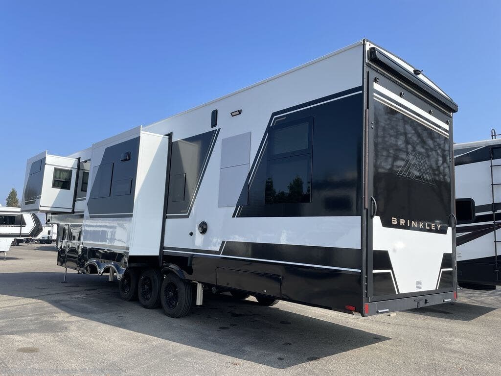 With any Model G toy hauler fifth wheel by Brinkley you will enjoy luxurious amenities, tons of storage space, and innovative features that have been developed and tested in the real world. Durable construction includes an industry leading PDI process, an industry best insulation package, and reinforced and walkable slide roofs. Some of the exterior features you'll find are a 3-way pass-through with a multi-functional flip-up bulkhead wall, under I-beam storage, a MAX-Vision reverse lighting system, and a low-maintenance roof to name a few. A Rockford Fosgate audio system comes standard, along with a Full app-based coach control system (iOS & Android) that lets you control your fifth wheel's functions right from your mobile device. You will find the solar system with a designated storage area to be ultra convenient, plus there is a FlexPower 5500 with a dual fuel inverter generator for all your power needs. Head inside to find a residential interior with Brinkley's CraftSense wood trim construction, floating entrance steps, integrated window screens and insulated blackout blinds, and residential solid surface countertops plus backsplash. You will also enjoy the neon shower lighting and recessed medicine cabinets in the bath, plus motion activated LED bed lights and dual bedside outlets in the bedroom. Choose a Model G toy hauler fifth wheel to experience all the luxury it has to offer!