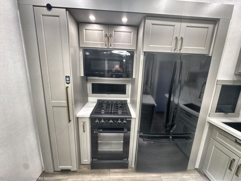 Prepare to be amazed by all the features packed into this toy hauler! There are triple slides that will provide your crew with more space, a separate garage that can sleep five with the loft included, plus a bath and a half for added convenience. The chef of your group will love the middle kitchen with a waterfall island that converts to a counter peninsula, a pull-out pantry, a GE Energy Star 19 cu. ft. refrigerator with ice and filtered water, and much more. In the combined kitchen and living space you'll find a spacious sofa with heat and massage, a fireplace, a TV, plus convenient dog bowls and shoe storage. After your toys are unloaded from the garage, you can relax on the independent dual sofas with a Fold-N-Stow table in between. You will find the front private bedroom with a king bed slide out will provide a great night's rest, and you'll also find a walk-in closet, under-bed storage, and a sliding dresser top with hidden storage for special belongings.