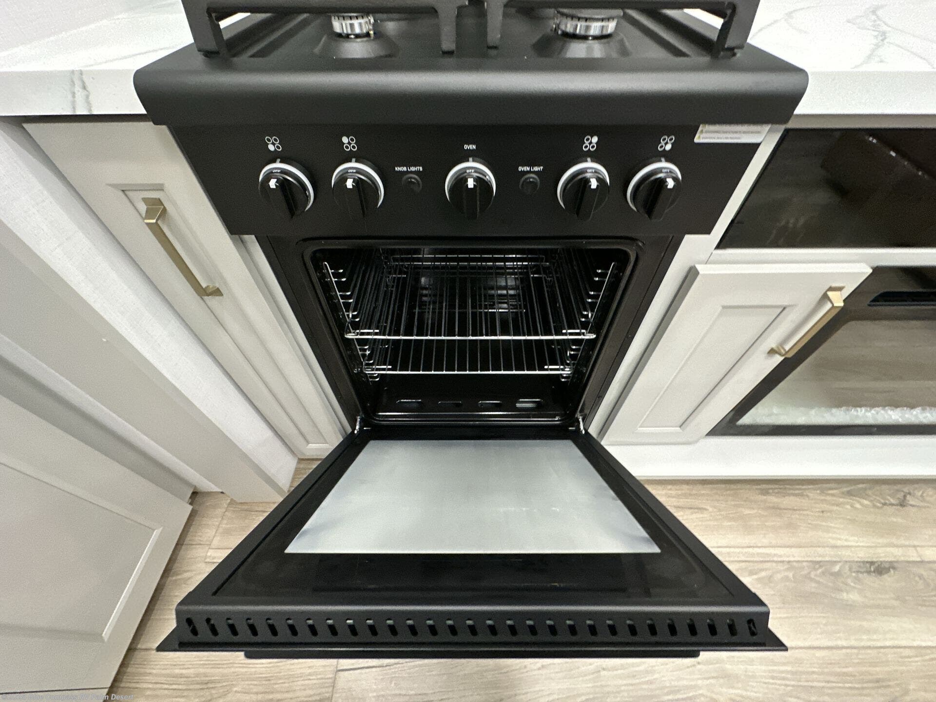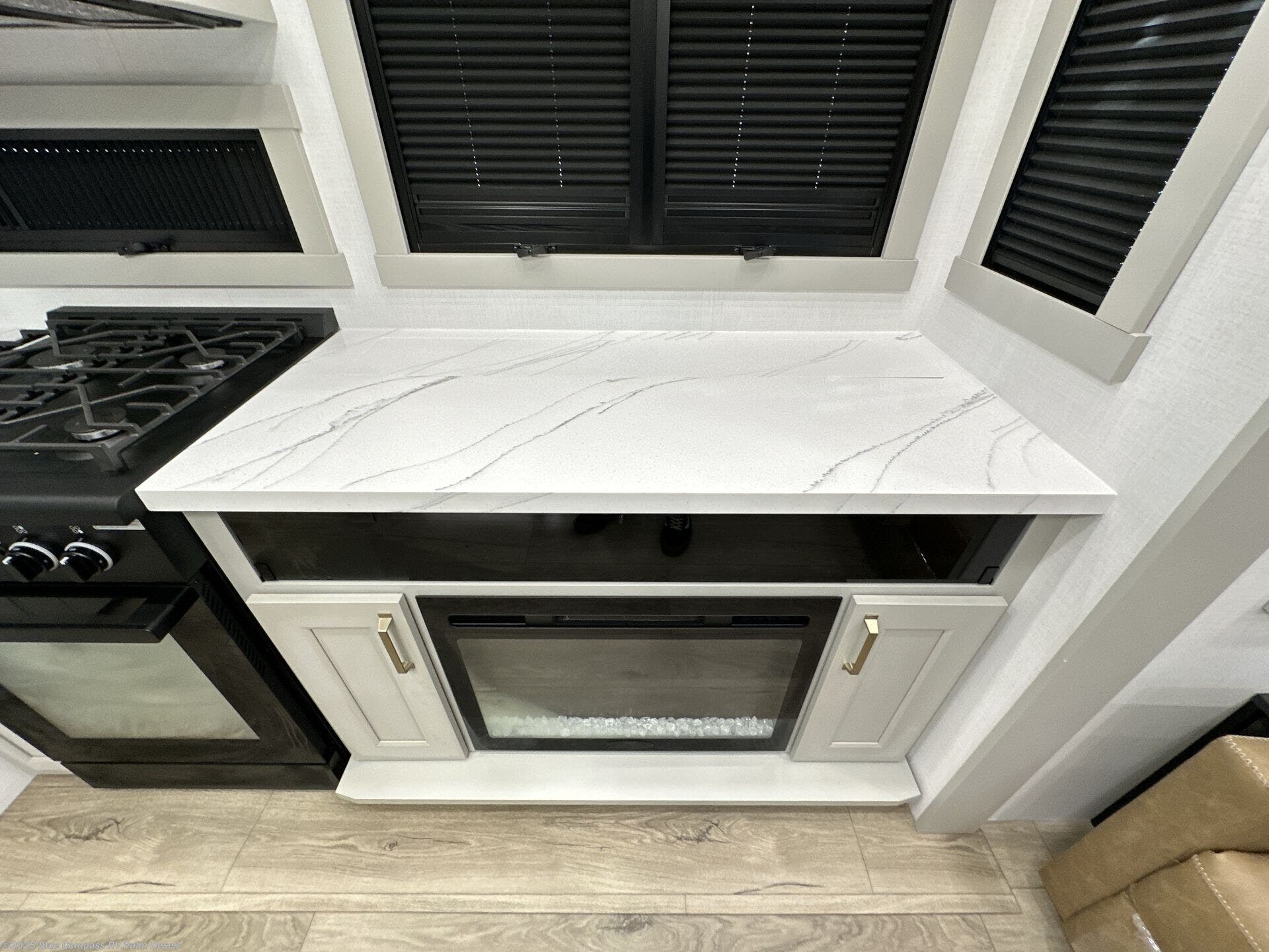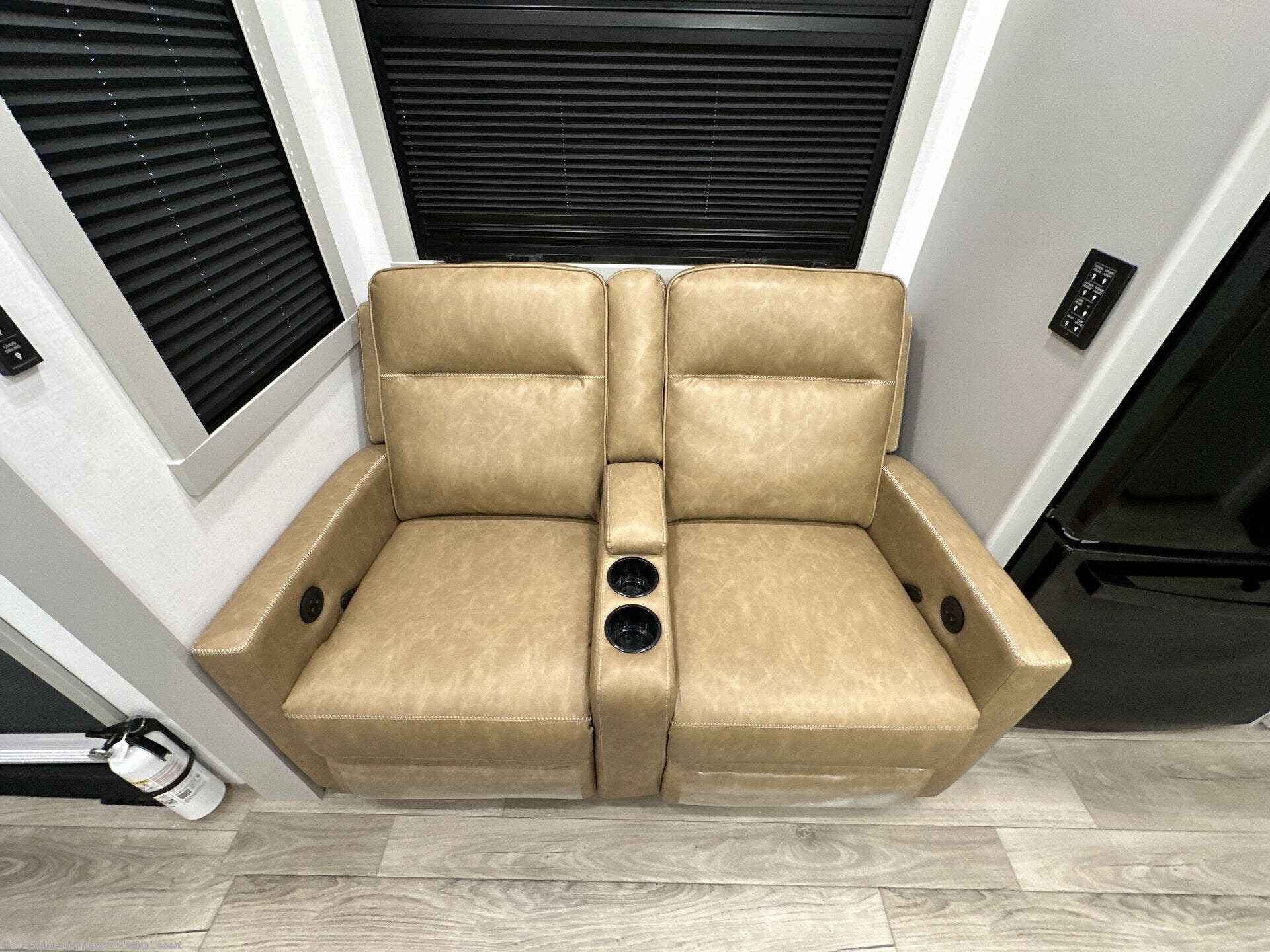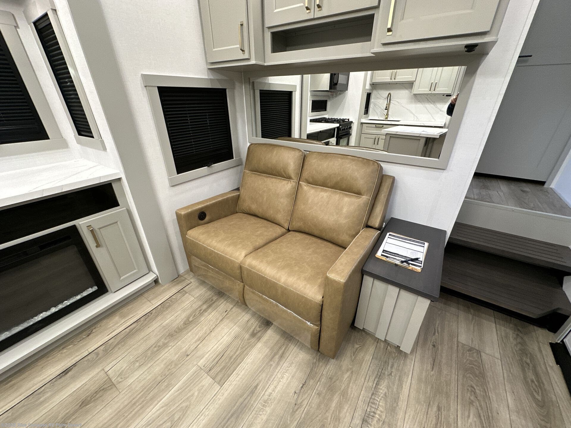 Load up your favorite riding toys and head for the trails in this spacious toy hauler! Once the bikes are out, you can relax on the independent dual sofas with a Fold-N Stow Table between or utilize the drop-down bed for a rest. The garage also includes a max-space half bath with fold-away walls and a sink plus a loft/storage for extra sleeping or storage space! Head to the combined kitchen and living area that features dual 2x recliners with heat and massage, dual opposing slides, plus a televator TV and fireplace. The chef of your group will appreciate the waterfall island that converts to a peninsula for more prep space, along with a spice rack and a pull-down utensil tray and knife rack! The spacious full bath includes a residential shower, a space saver door, a solid surface countertop and many more comforts. Last but not least, the front private bedroom will be your own oasis each night that features a king bed slide out, underbed storage drawers and motion lights, a dresser with hidden storage, plus a walk-in closet with cordless vacuum prep.