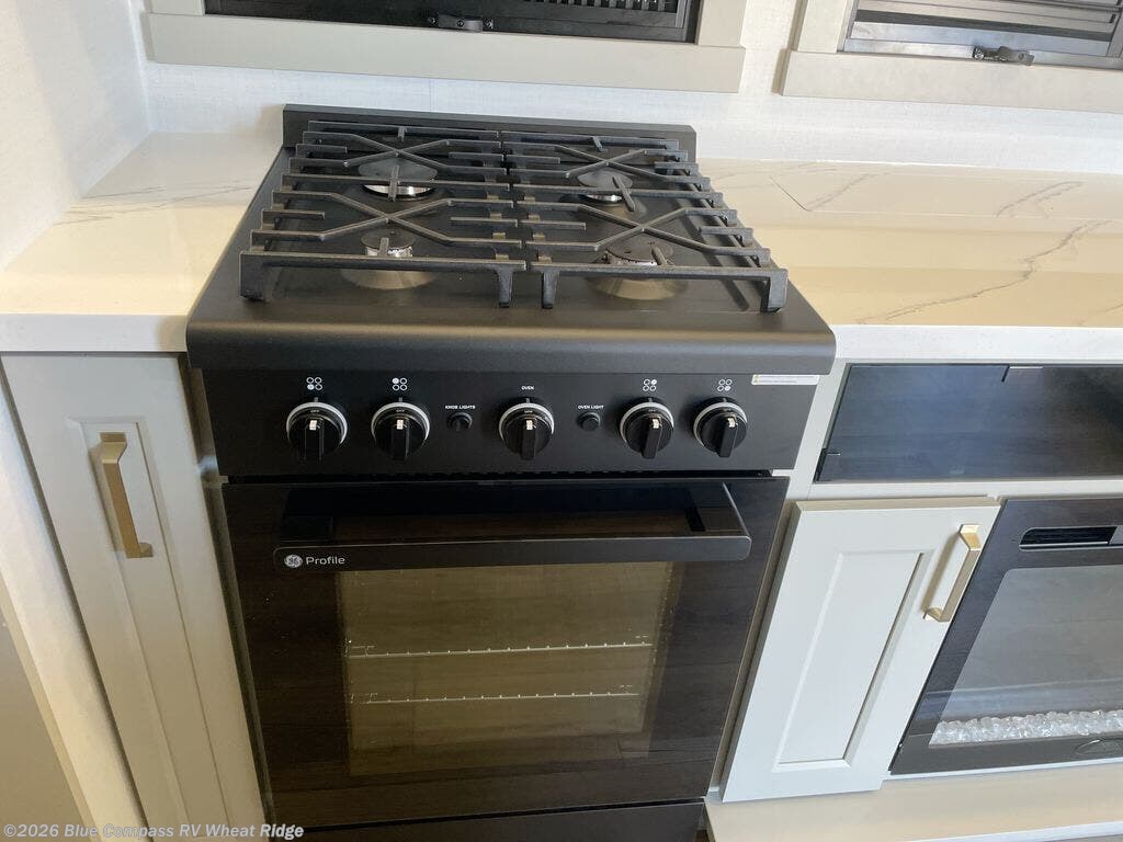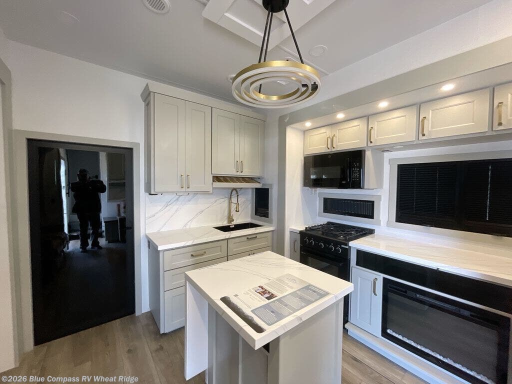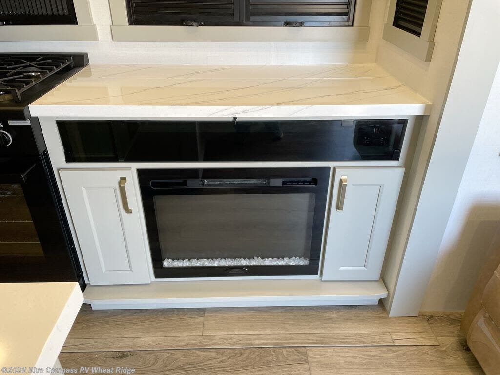 You can't imagine how much this toy hauler has to offer! The garage/outdoor kitchen/office space will allow you to utilize the garage how you need it, plus there is an adjustable tie-down system, as well as a loft for storage and a twin bed to sleep more campers! The garage patio with a 1,500 lb. capacity is another feature you are sure to love, especially with its own awning to keep you protected from the elements. Head to the kitchen to prepare meals with a 24" GE oven with a four burner range, a GE microwave with an air fryer, plus a spacious GE Energy Star 19 cu. ft. refrigerator. The island with two stools will let others visit with you while you cook, and there are even dog bowls to easily feed Frodo. You'll find the convertible dining table/L-desk will be accommodating since it can be use to dine at, and to get some work done. You may just find yourselves spending most of your time on the L-sofa in front of the entertainment center with a TV, fireplace and storage. A full bath is up front by the bedroom, and here you'll find a 30" x 42" shower and pull-out linen storage with a trash bin to keep towels ready to use. After a day outdoors you'll love nothing more than coming back to your own bedroom with a king bed slide out, TV, a walk-in closet, and many more storage spaces. And we haven't even touched on the exterior features, like the 3-way pass-through storage, three power awnings, an air compressor to fill up tires, and the list goes on and on!