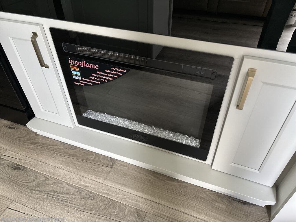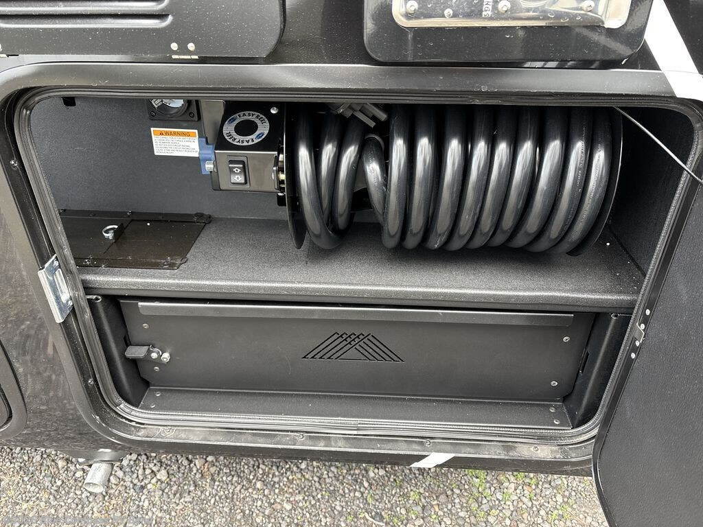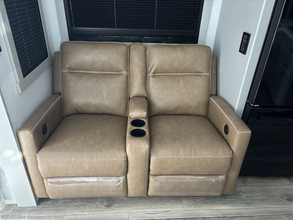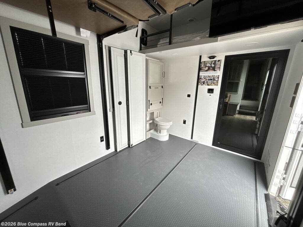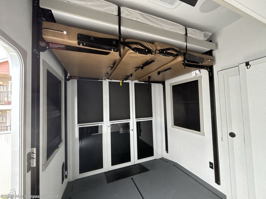 Load up your favorite riding toys and head for the trails in this spacious toy hauler! Once the bikes are out, you can relax on the independent dual sofas with a Fold-N Stow Table between or utilize the drop-down bed for a rest. The garage also includes a max-space half bath with fold-away walls and a sink plus a loft/storage for extra sleeping or storage space! Head to the combined kitchen and living area that features dual 2x recliners with heat and massage, dual opposing slides, plus a televator TV and fireplace. The chef of your group will appreciate the waterfall island that converts to a peninsula for more prep space, along with a spice rack and a pull-down utensil tray and knife rack! The spacious full bath includes a residential shower, a space saver door, a solid surface countertop and many more comforts. Last but not least, the front private bedroom will be your own oasis each night that features a king bed slide out, underbed storage drawers and motion lights, a dresser with hidden storage, plus a walk-in closet with cordless vacuum prep.