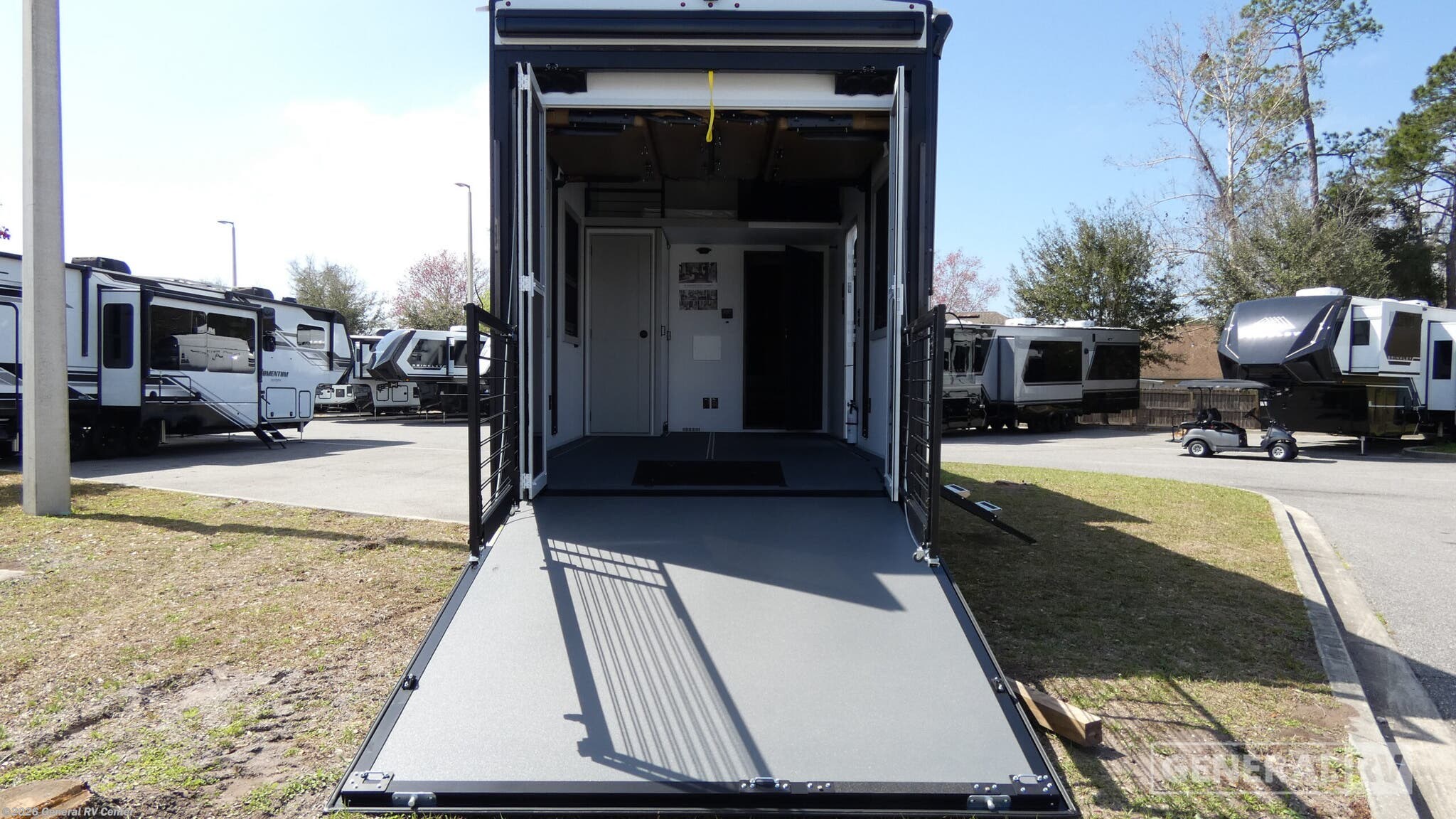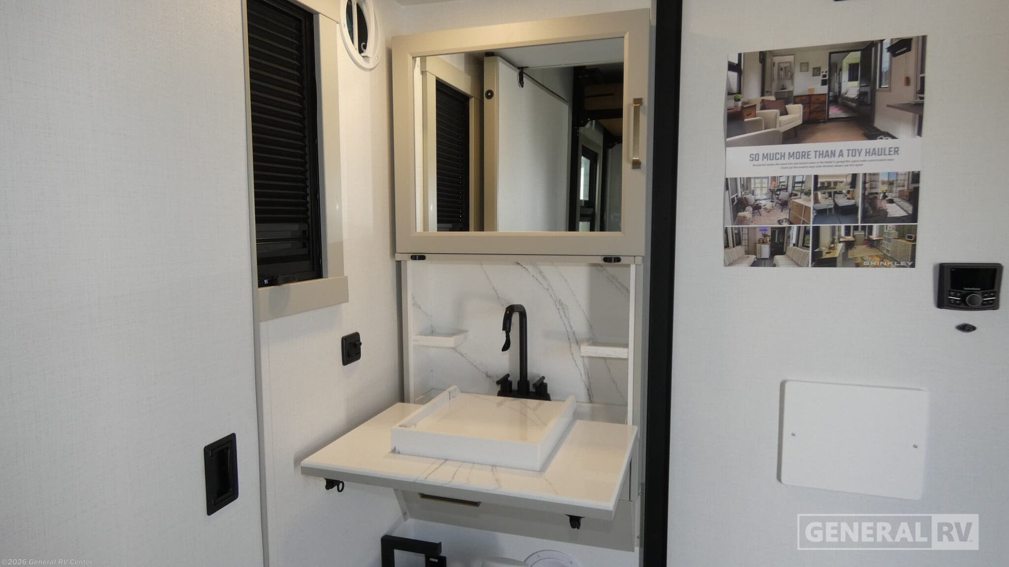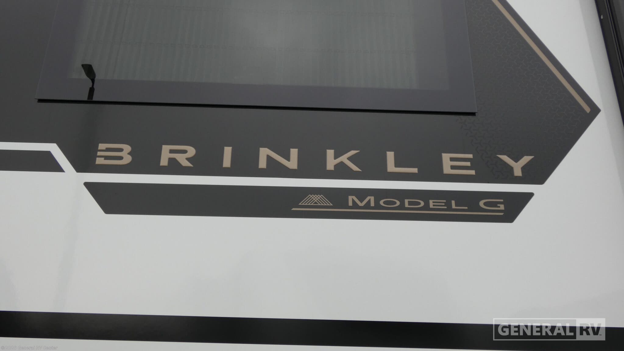 **Brinkley Model G toy hauler 3950 highlights:** * 14' Garage with Loft * L-Shaped Sofa * 19 Cu. Ft. Refrigerator * King Bed Slide Out * Walk-In Bedroom Closet * Bath and a Half This toy hauler may just be the one you've been looking for! The garage/flex space with fold-away half bath walls will allow you to utilize the garage how you need it, plus there is an adjustable tie-down system, independent dual sofas, plus a loft for storage and a twin bed to sleep more campers! The garage patio with a 1,500 lb. capacity is another feature you are sure to love, especially with its own awning to keep you protected from the elements. Head to the kitchen to prepare meals with a 24" GE oven with a four burner range, a GE microwave with an air fryer, plus a spacious GE Energy Star 19 cu. ft. refrigerator. The island with two stools will let others visit with you while you cook, and there are even hidden dog bowls. You'll find the convertible dining table/L-desk will be accommodating since it can be use to dine at, and to get some work done. You may just find yourselves spending most of your time on the L-sofa in front of the TV and fireplace. A full bath is up front by the bedroom, and here you'll find neon shower lighting, a residential shower system, and pull-out linen storage to keep towels ready to use. After a day outdoors you'll love nothing more than coming back to your own bedroom with a king bed slide out, TV, a walk-in closet, and many more storage spaces. And we haven't even touched on the exterior features, like the 3-way pass-through storage, three power awnings, an air compressor to fill up tires, and the list goes on and on! With any Model G toy hauler fifth wheel by Brinkley you will enjoy luxurious amenities, tons of storage space, and innovative features that have been developed and tested in the real world. Durable construction includes an industry leading PDI process, an industry best insulation package, and reinforced and walkable slide roofs. Some of the exterior features you'll find are a 3-way pass-through with a multi-functional flip-up bulkhead wall, under I-beam storage, a MAX-Vision reverse lighting system, and a low-maintenance roof to name a few. A Rockford Fosgate audio system comes standard, along with a OneControl app system that lets you control your fifth wheel's functions right from your mobile device. You will find the solar system with a designated storage area to be ultra convenient, plus there is a FlexPower 5500 with a dual fuel inverter generator for all your power needs. Head inside to find a residential interior with Brinkley's CraftSense wood trim construction, floating entrance steps, integrated window screens and insulated blackout blinds, and residential solid surface countertops plus backsplash. You will also enjoy the neon shower lighting and recessed medicine cabinets in the bath, plus motion activated LED bed lights and dual bedside outlets in the bedroom. Choose a Model G toy hauler fifth wheel to experience all the luxury it has to offer!
