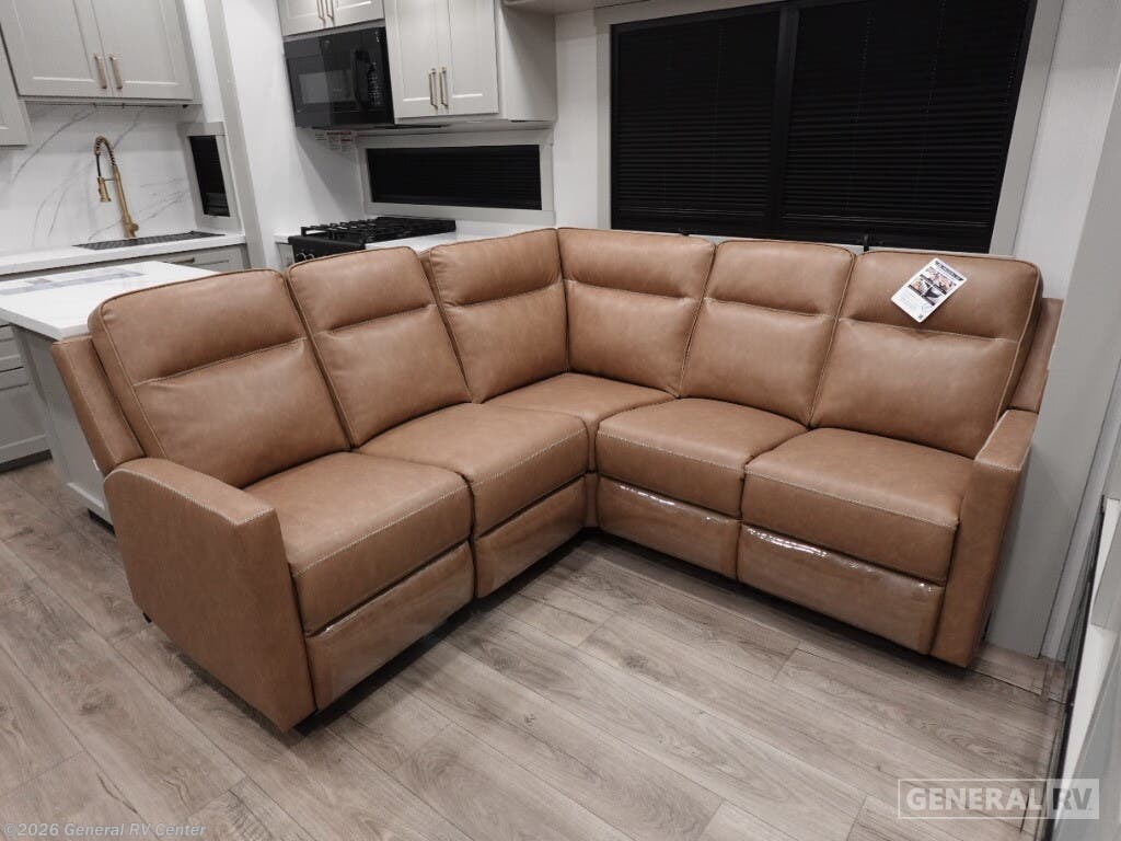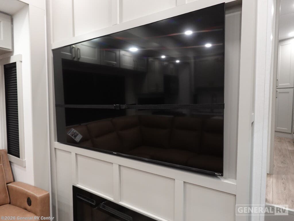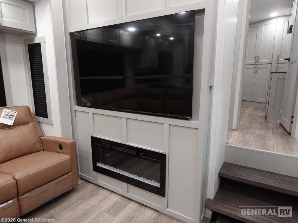 Step into the future of RV living with the 2025 Brinkley Model G 3950. This luxurious fifth wheel is designed for those who crave adventure without sacrificing comfort. With its spacious layout, it comfortably sleeps up to nine people, thanks to a king bed, a queen bed, and a convertible option, making it perfect for family getaways or trips with friends. The center kitchen is a culinary enthusiast's dream, equipped with a full-size electric refrigerator and a four-burner cooktop, complemented by convection cooking. Whether you're hosting a dinner or enjoying a quiet night in, the stylish center living area with its cozy fireplace sets the perfect ambiance. The Model G 3950 is not just about luxury; it's also about convenience and functionality. The front bedroom offers a serene retreat with ample storage, while the center bath with a plastic/glass shower ensures you have all the comforts of home. With a washer and dryer included, long trips are a breeze. Three powered retractable awnings provide ample outdoor space for relaxation, and the 14' 6" garage with dovetail storage is ideal for your adventure gear. With impressive water capacities and robust construction, this RV is ready to take you wherever your heart desires. For more details or to experience this marvel in person, visit your nearest General RV dealership.