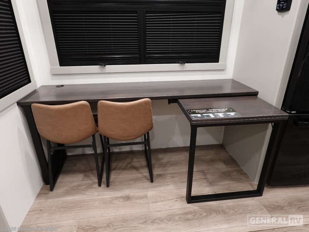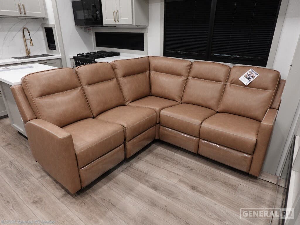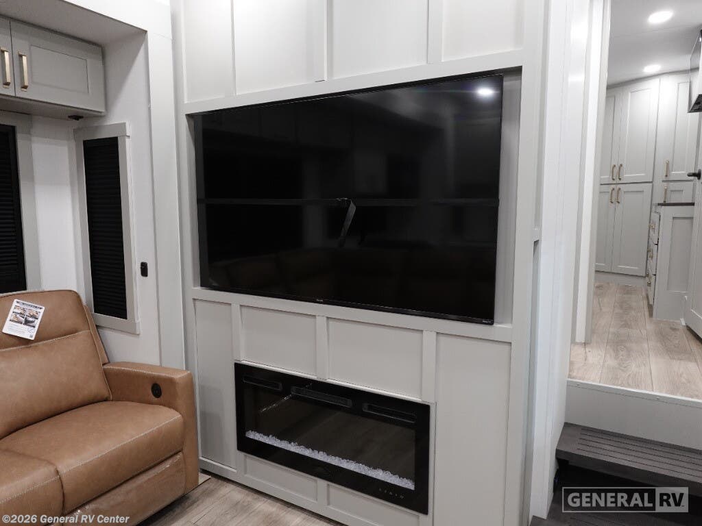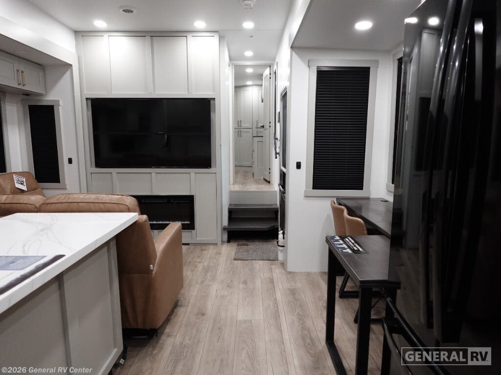 Step into the future of RV living with the 2025 Brinkley Model G 3950. This luxurious fifth wheel is designed for those who crave adventure without sacrificing comfort. With its spacious layout, it comfortably sleeps up to nine people, thanks to a king bed, a queen bed, and a convertible option, making it perfect for family getaways or trips with friends. The center kitchen is a culinary enthusiast's dream, equipped with a full-size electric refrigerator and a four-burner cooktop, complemented by convection cooking. Whether you're hosting a dinner or enjoying a quiet night in, the stylish center living area with its cozy fireplace sets the perfect ambiance. The Model G 3950 is not just about luxury; it's also about convenience and functionality. The front bedroom offers a serene retreat with ample storage, while the center bath with a plastic/glass shower ensures you have all the comforts of home. With a washer and dryer included, long trips are a breeze. Three powered retractable awnings provide ample outdoor space for relaxation, and the 14' 6" garage with dovetail storage is ideal for your adventure gear. With impressive water capacities and robust construction, this RV is ready to take you wherever your heart desires. For more details or to experience this marvel in person, visit your nearest General RV dealership.