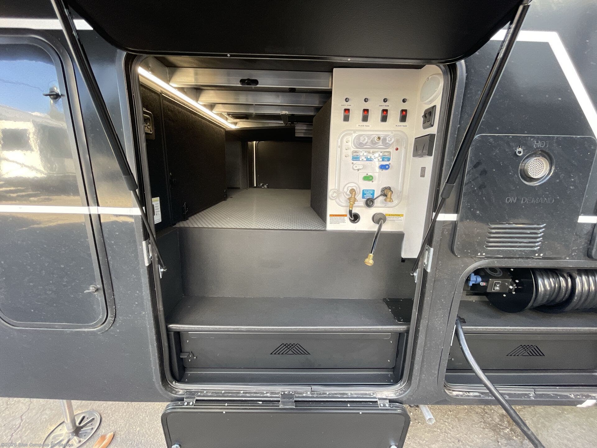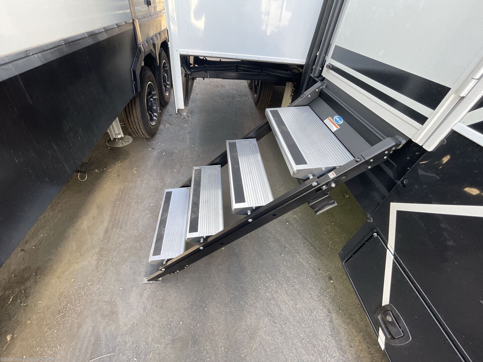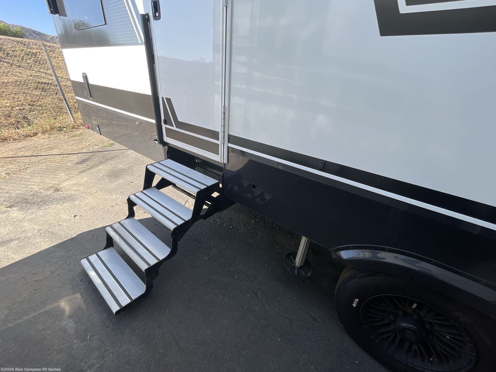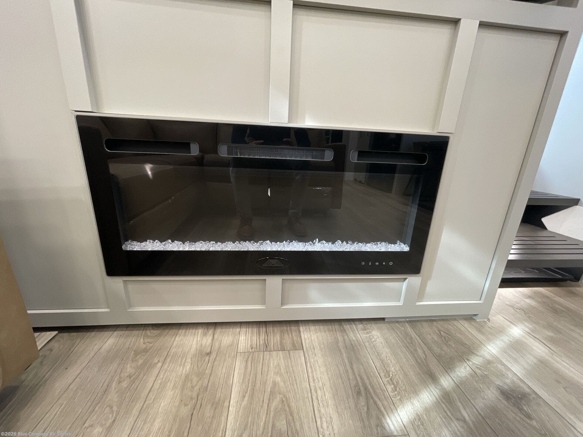 This toy hauler may just be the one you've been looking for! The garage/flex space with fold-away half bath walls will allow you to utilize the garage how you need it, plus there is an adjustable tie-down system, independent dual sofas, plus a loft for storage and a twin bed to sleep more campers! The garage patio with a 1,500 lb. capacity is another feature you are sure to love, especially with its own awning to keep you protected from the elements. Head to the kitchen to prepare meals with a 24" GE oven with a four-burner range, a GE microwave with an air fryer, plus a spacious GE Energy Star 19 cu. ft. refrigerator. The island with two stools will let others visit with you while you cook, and there are even hidden dog bowls. You'll find the convertible dining table/L-desk will be accommodating since it can be used to dine at, and to get some work done. You may just find yourselves spending most of your time on the L-sofa in front of the TV and fireplace. A full bath is up front by the bedroom, and here you'll find neon shower lighting, a residential shower system, and pull-out linen storage to keep towels ready to use. After a day outdoors you'll love nothing more than coming back to your own bedroom with a king bed slide out, TV, a walk-in closet, and many more storage spaces. And we haven't even touched on the exterior features, like the 3-way pass-through storage, four power awnings, an air compressor to fill up tires, and the list goes on and on!