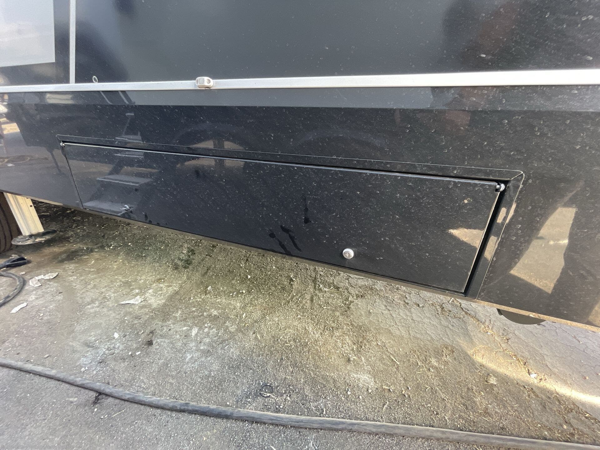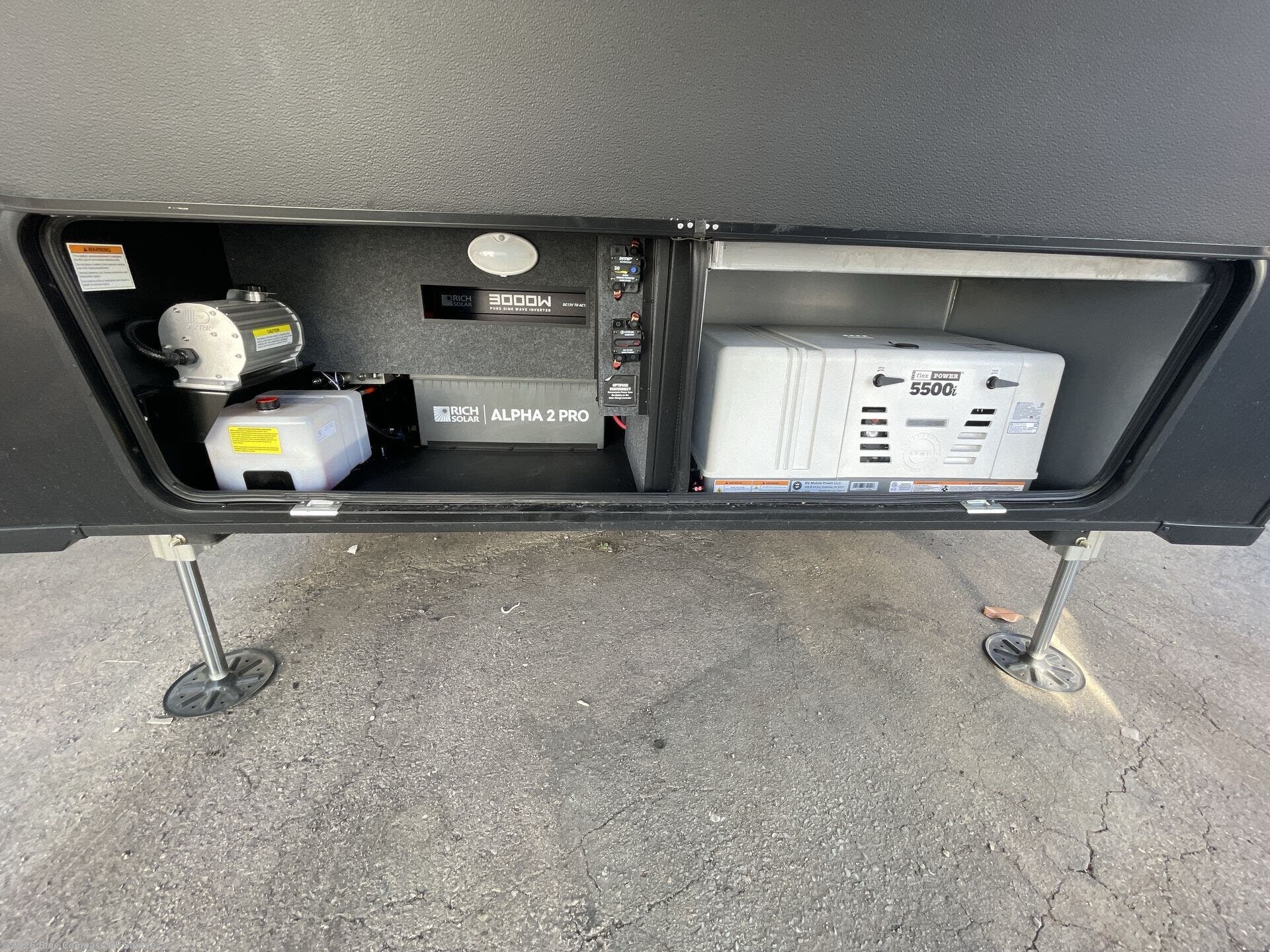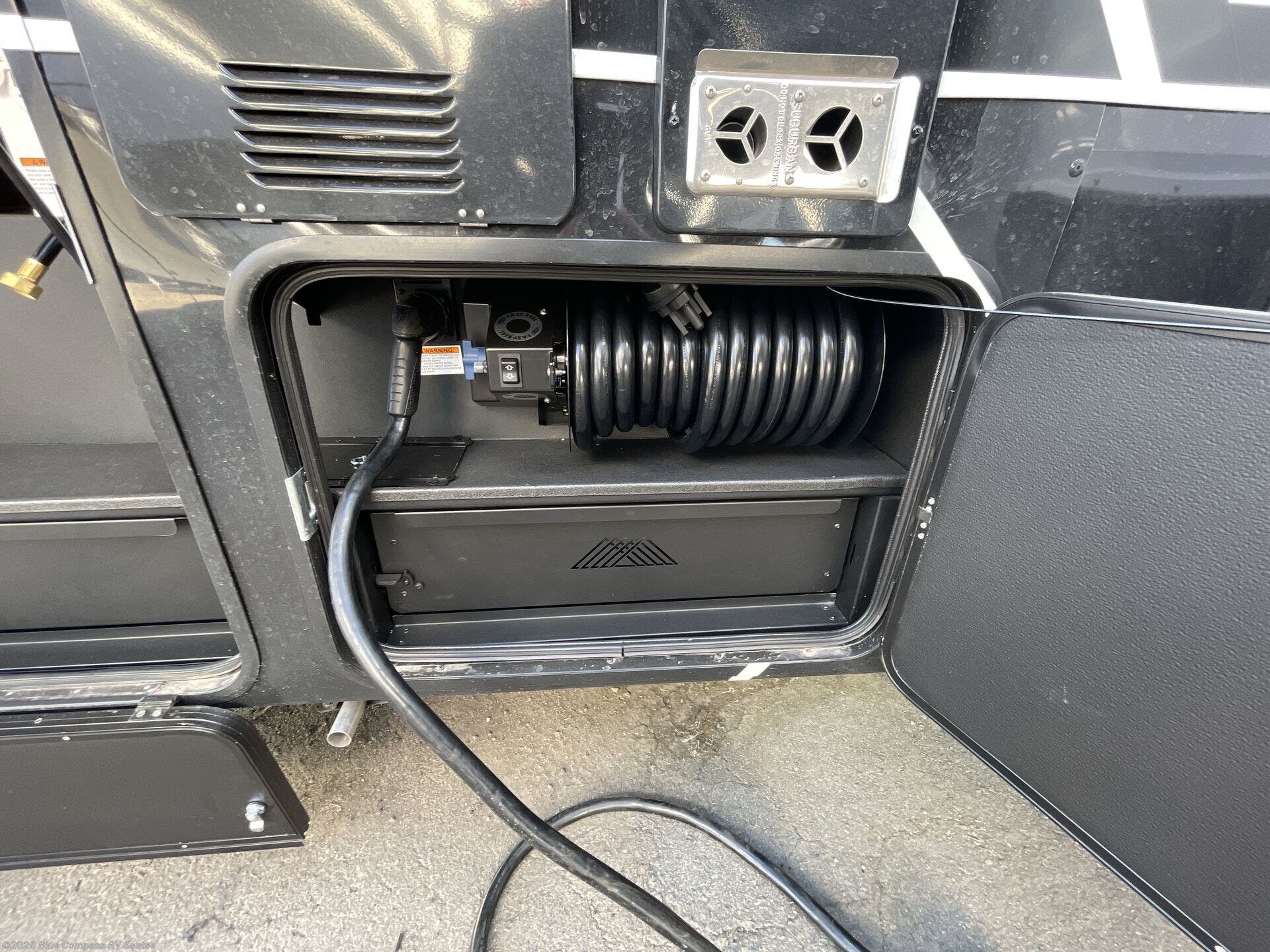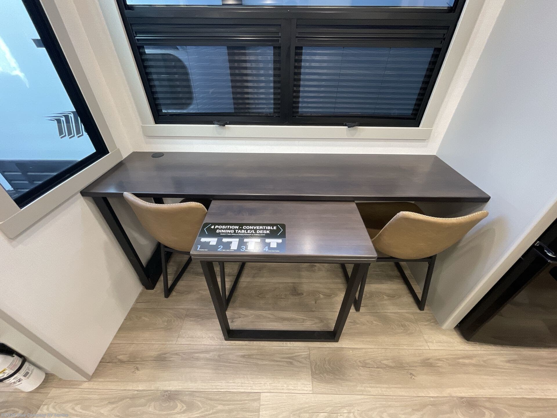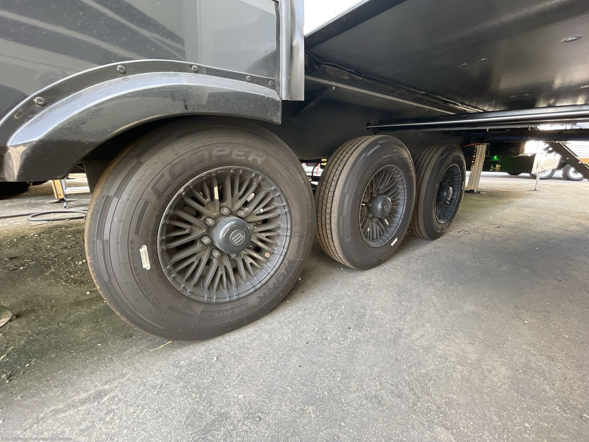 This toy hauler may just be the one you've been looking for! The garage/flex space with fold-away half bath walls will allow you to utilize the garage how you need it, plus there is an adjustable tie-down system, independent dual sofas, plus a loft for storage and a twin bed to sleep more campers! The garage patio with a 1,500 lb. capacity is another feature you are sure to love, especially with its own awning to keep you protected from the elements. Head to the kitchen to prepare meals with a 24" GE oven with a four-burner range, a GE microwave with an air fryer, plus a spacious GE Energy Star 19 cu. ft. refrigerator. The island with two stools will let others visit with you while you cook, and there are even hidden dog bowls. You'll find the convertible dining table/L-desk will be accommodating since it can be used to dine at, and to get some work done. You may just find yourselves spending most of your time on the L-sofa in front of the TV and fireplace. A full bath is up front by the bedroom, and here you'll find neon shower lighting, a residential shower system, and pull-out linen storage to keep towels ready to use. After a day outdoors you'll love nothing more than coming back to your own bedroom with a king bed slide out, TV, a walk-in closet, and many more storage spaces. And we haven't even touched on the exterior features, like the 3-way pass-through storage, four power awnings, an air compressor to fill up tires, and the list goes on and on!