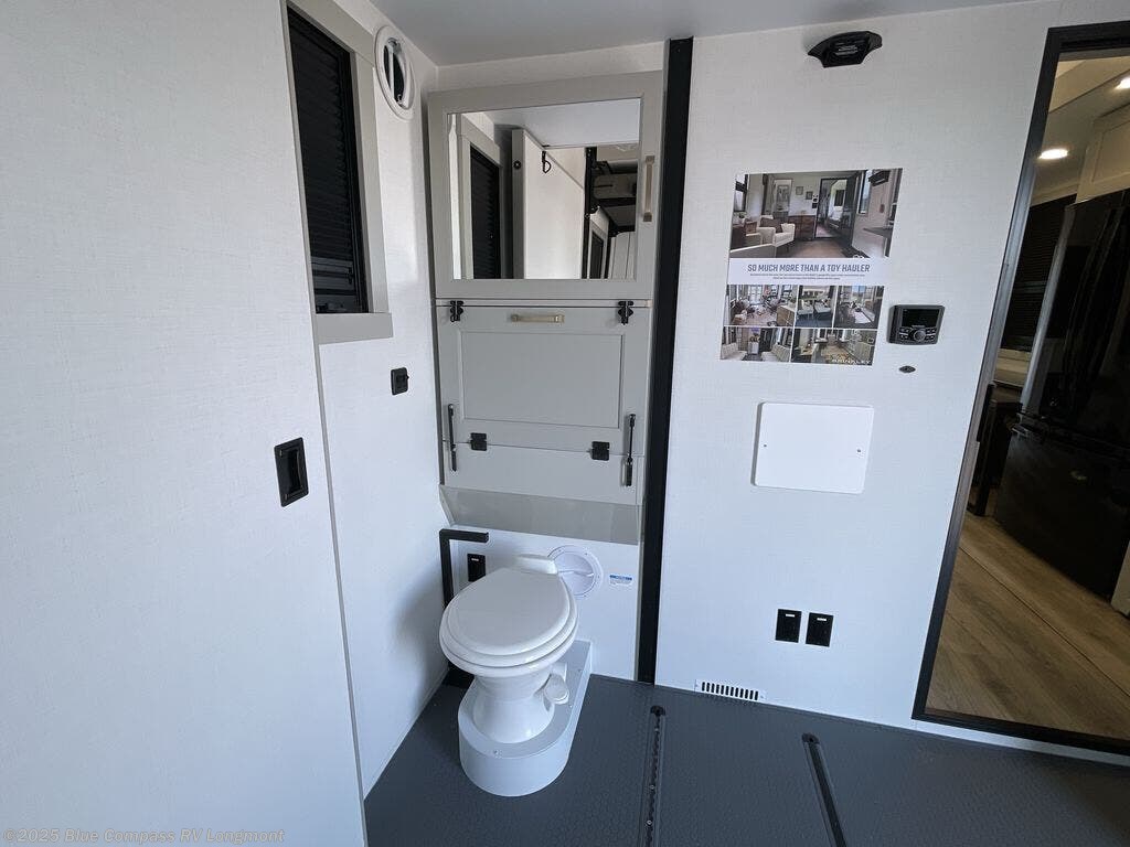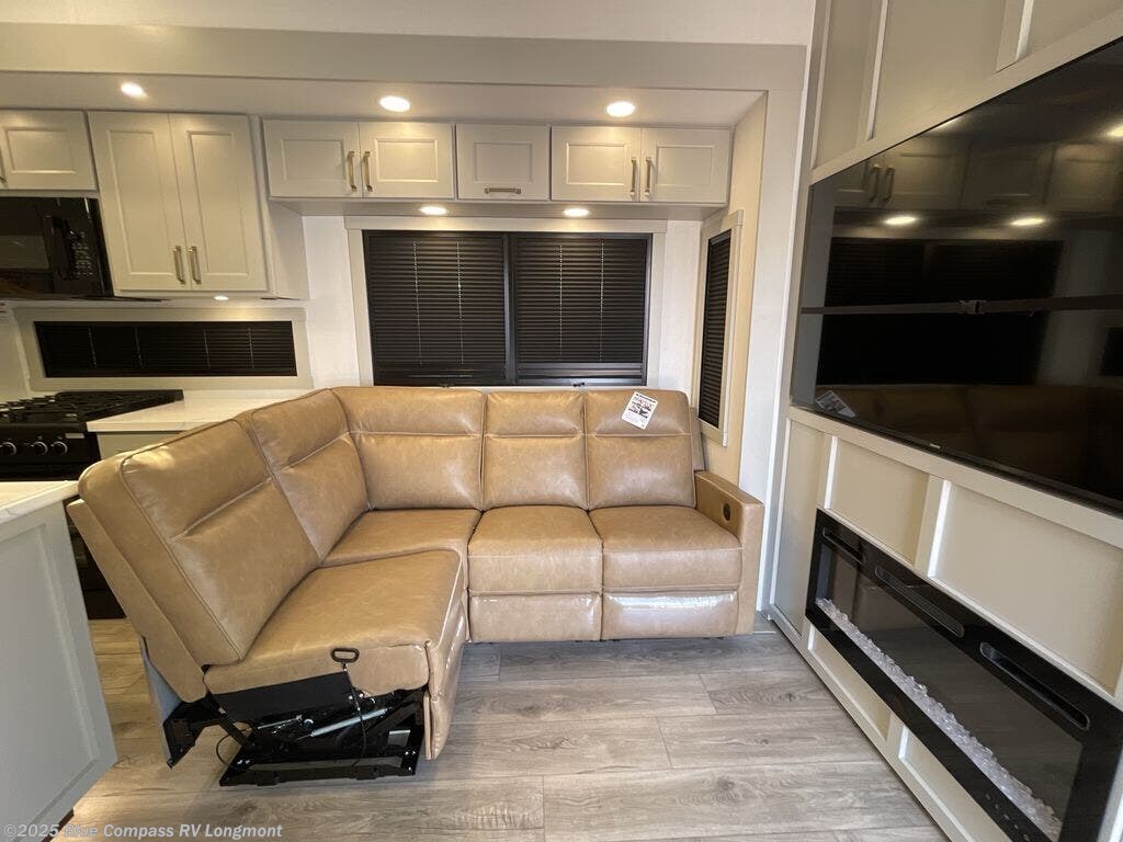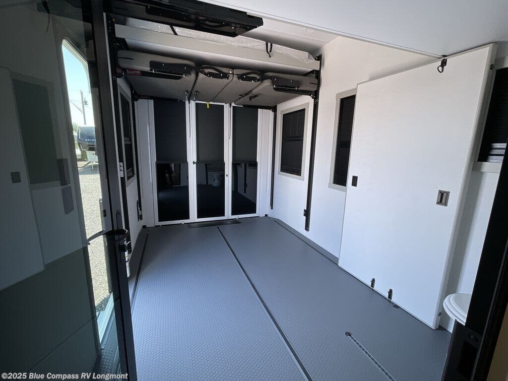 This toy hauler may just be the one you've been looking for! The garage/flex space with fold-away half bath walls will allow you to utilize the garage how you need it, plus there is an adjustable tie-down system, independent dual sofas, plus a loft for storage and a twin bed to sleep more campers! The garage patio with a 1,500 lb. capacity is another feature you are sure to love, especially with its own awning to keep you protected from the elements. Head to the kitchen to prepare meals with a 24" GE oven with a four burner range, a GE microwave with an air fryer, plus a spacious GE Energy Star 19 cu. ft. refrigerator. The island with two stools will let others visit with you while you cook, and there are even hidden dog bowls. You'll find the convertible dining table/L-desk will be accommodating since it can be use to dine at, and to get some work done. You may just find yourselves spending most of your time on the L-sofa in front of the TV and fireplace. A full bath is up front by the bedroom, and here you'll find neon shower lighting, a residential shower system, and pull-out linen storage to keep towels ready to use. After a day outdoors you'll love nothing more than coming back to your own bedroom with a king bed slide out, TV, a walk-in closet, and many more storage spaces. And we haven't even touched on the exterior features, like the 3-way pass-through storage, three power awnings, an air compressor to fill up tires, and the list goes on and on!