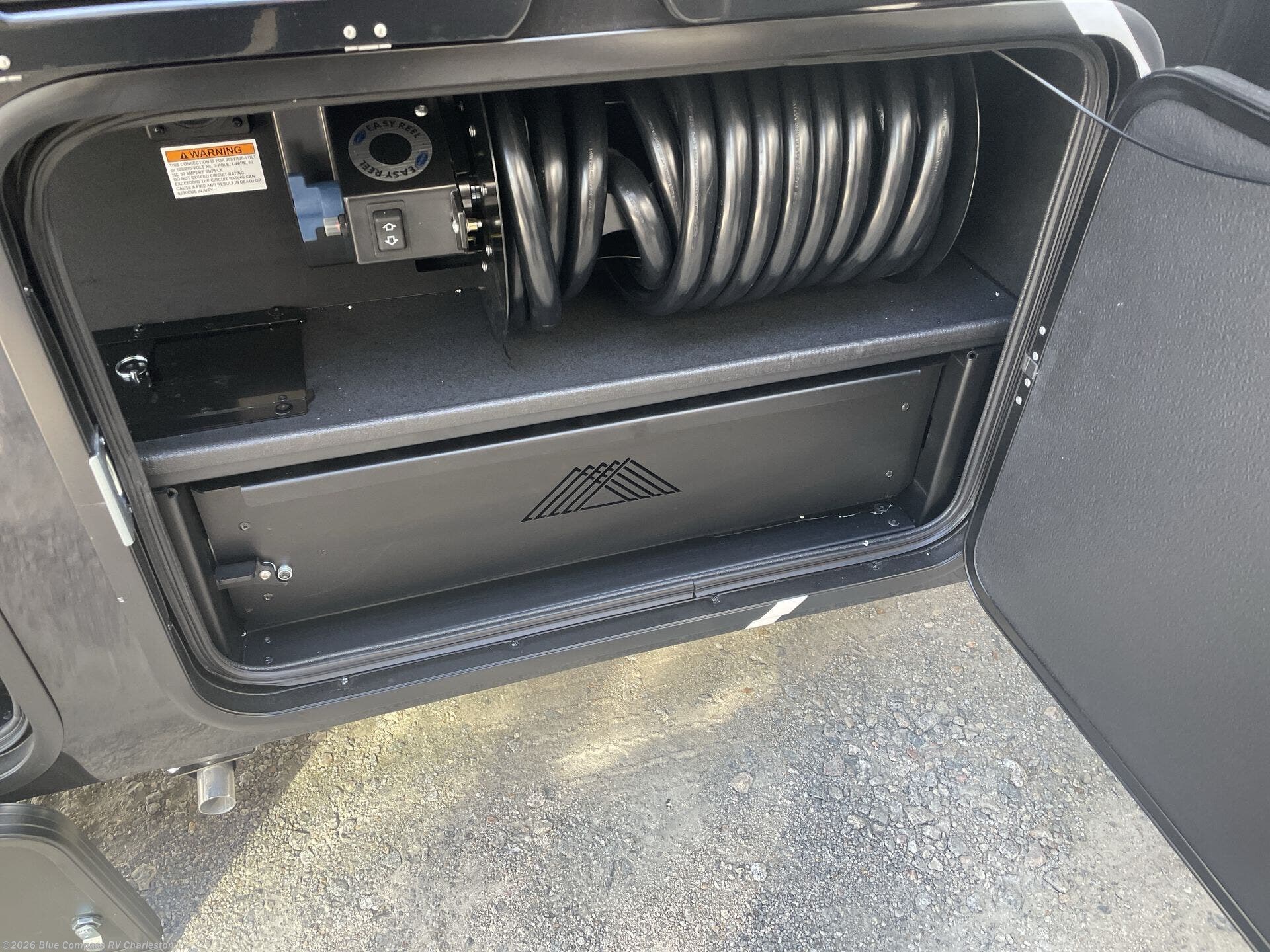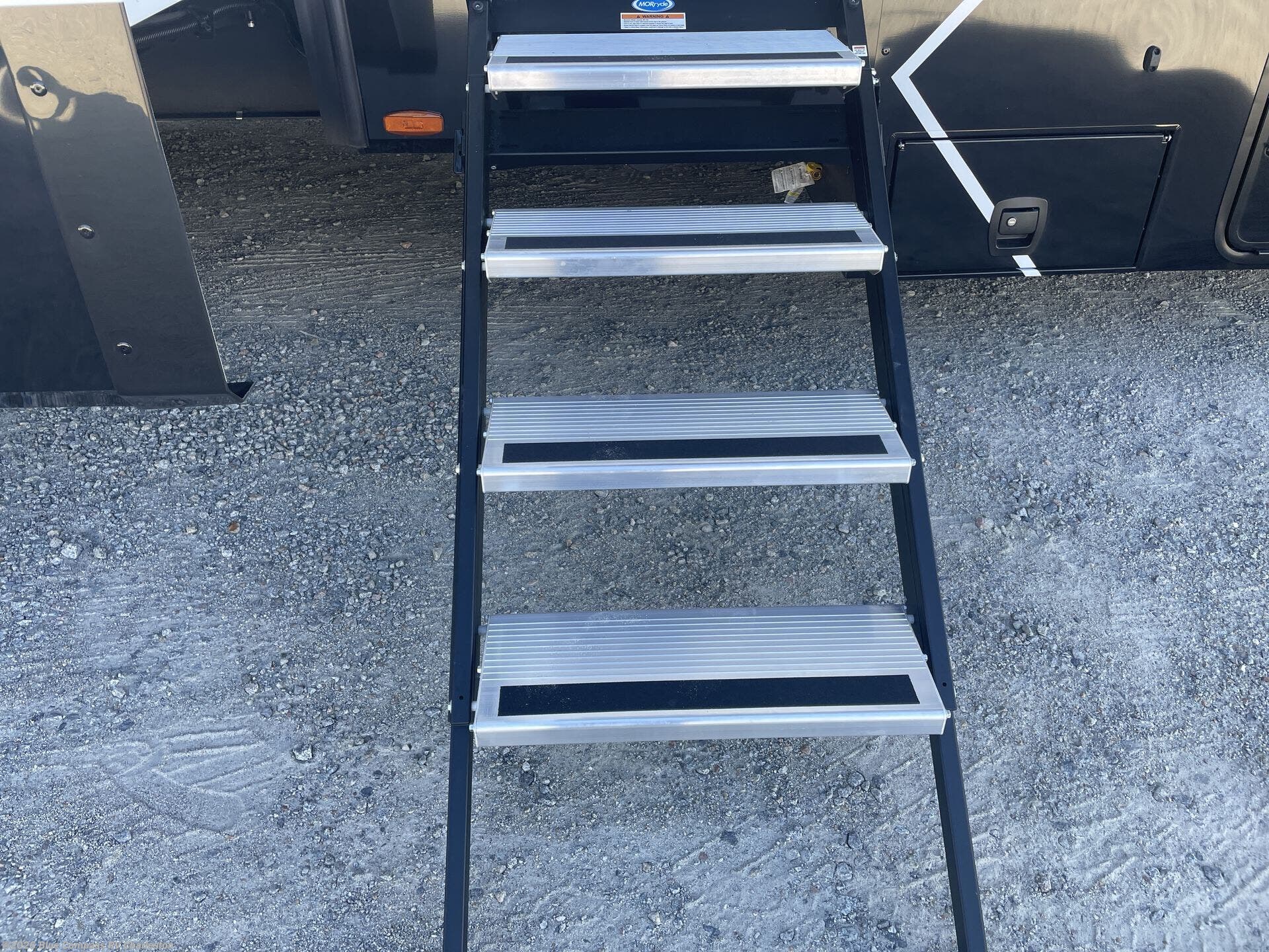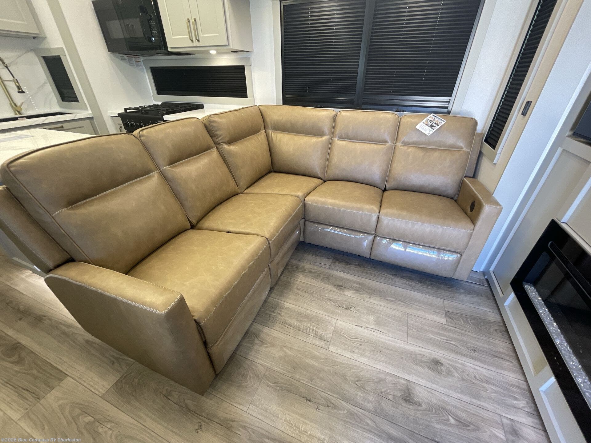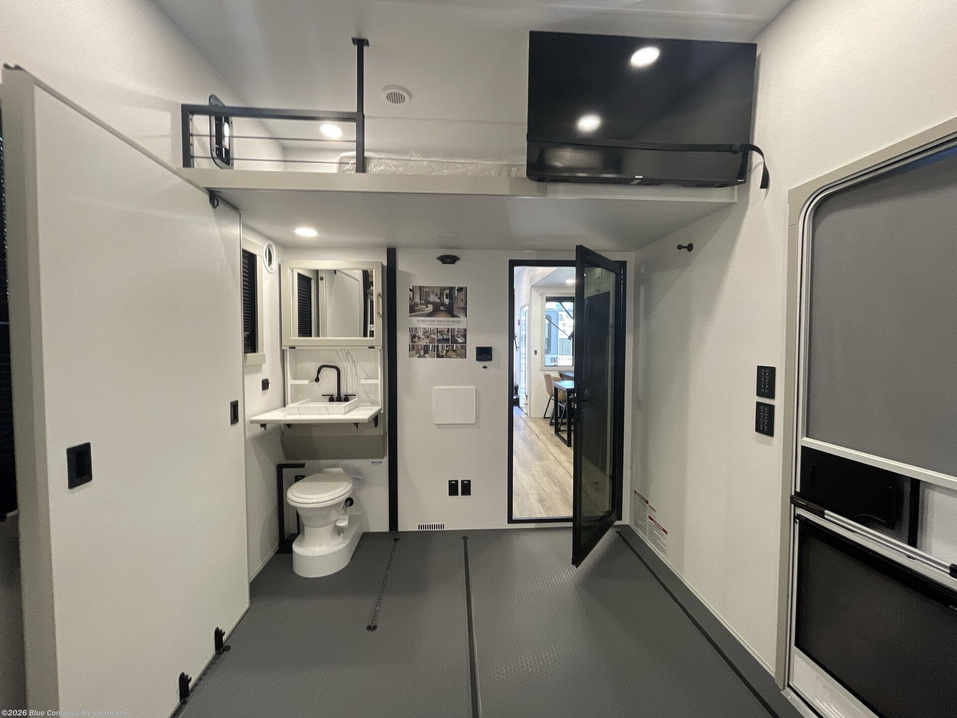 This toy hauler may just be the one you've been looking for! The garage/flex space with fold-away half bath walls will allow you to utilize the garage how you need it, plus there is an adjustable tie-down system, independent dual sofas, plus a loft for storage and a twin bed to sleep more campers! The garage patio with a 1,500 lb. capacity is another feature you are sure to love, especially with its own awning to keep you protected from the elements. Head to the kitchen to prepare meals with a 24" GE oven with a four burner range, a GE microwave with an air fryer, plus a spacious GE Energy Star 19 cu. ft. refrigerator. The island with two stools will let others visit with you while you cook, and there are even hidden dog bowls. You'll find the convertible dining table/L-desk will be accommodating since it can be use to dine at, and to get some work done. You may just find yourselves spending most of your time on the L-sofa in front of the TV and fireplace. A full bath is up front by the bedroom, and here you'll find neon shower lighting, a residential shower system, and pull-out linen storage to keep towels ready to use. After a day outdoors you'll love nothing more than coming back to your own bedroom with a king bed slide out, TV, a walk-in closet, and many more storage spaces. And we haven't even touched on the exterior features, like the 3-way pass-through storage, three power awnings, an air compressor to fill up tires, and the list goes on and on!