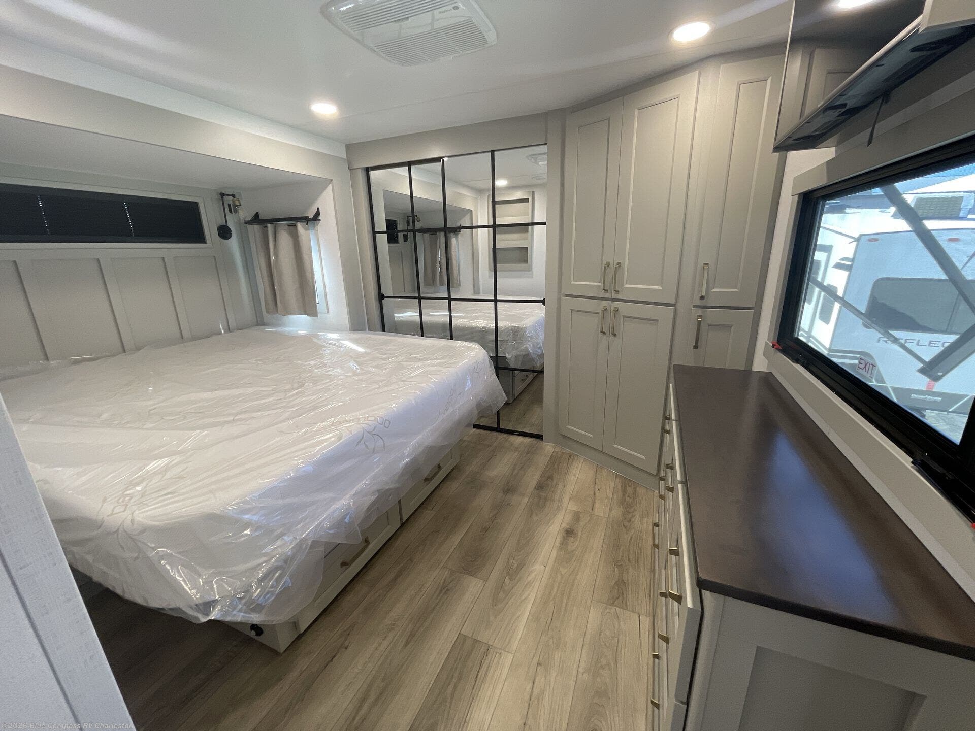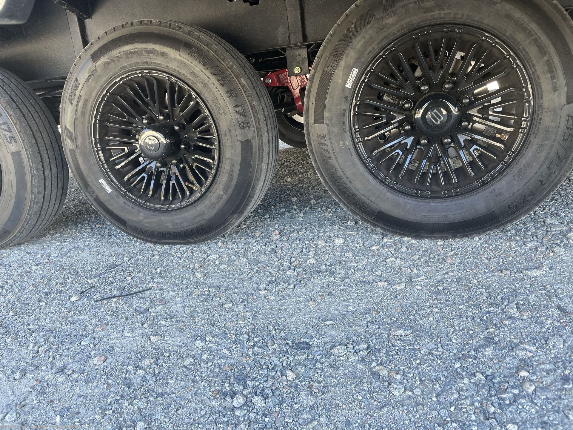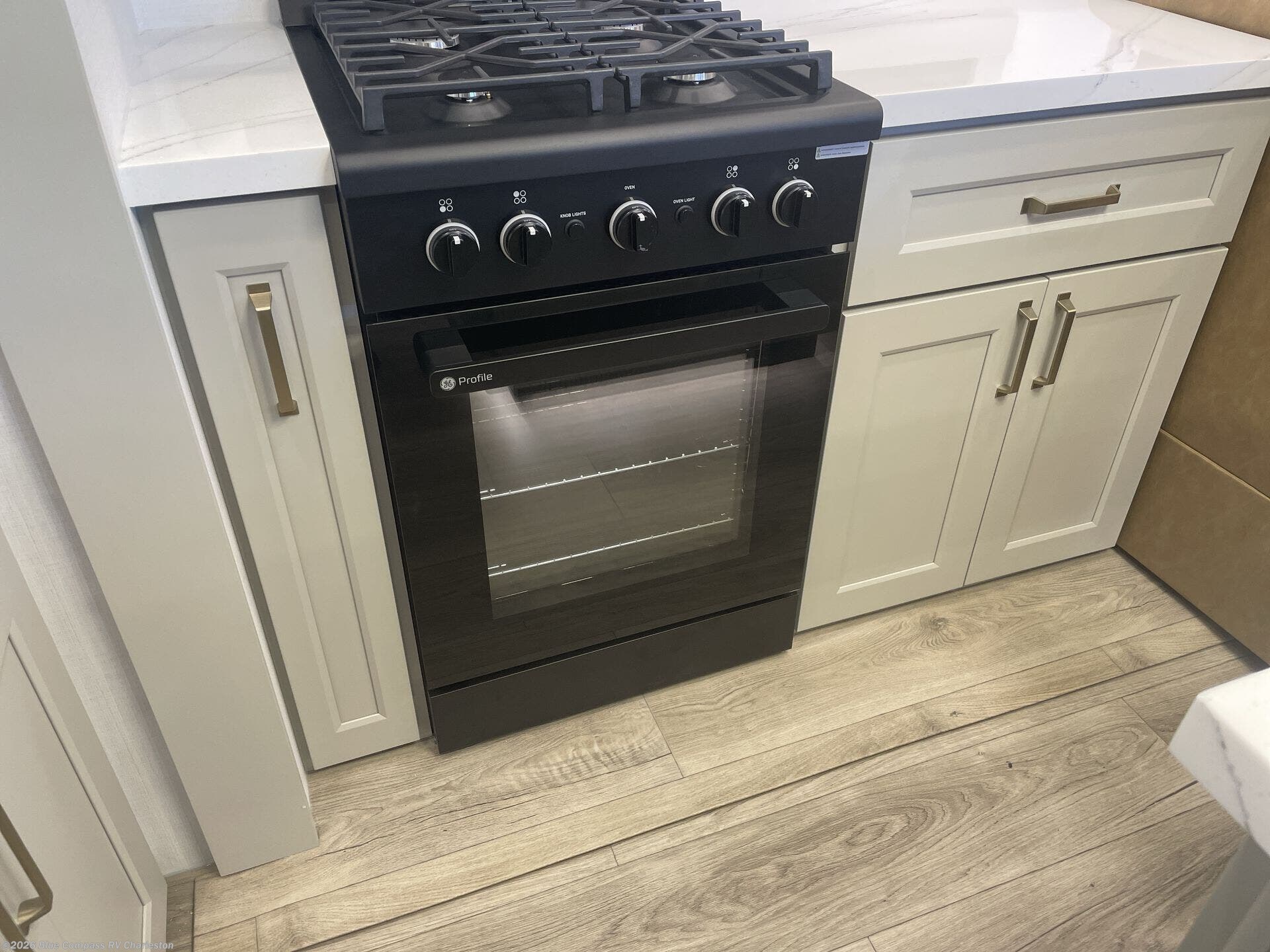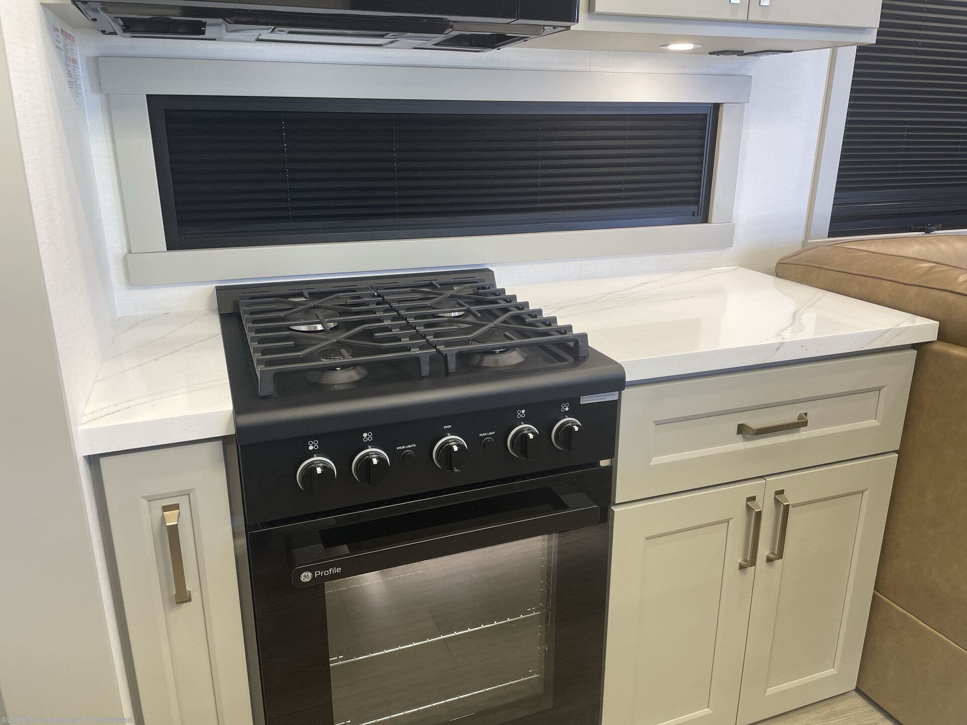 This toy hauler may just be the one you've been looking for! The garage/flex space with fold-away half bath walls will allow you to utilize the garage how you need it, plus there is an adjustable tie-down system, independent dual sofas, plus a loft for storage and a twin bed to sleep more campers! The garage patio with a 1,500 lb. capacity is another feature you are sure to love, especially with its own awning to keep you protected from the elements. Head to the kitchen to prepare meals with a 24" GE oven with a four burner range, a GE microwave with an air fryer, plus a spacious GE Energy Star 19 cu. ft. refrigerator. The island with two stools will let others visit with you while you cook, and there are even hidden dog bowls. You'll find the convertible dining table/L-desk will be accommodating since it can be use to dine at, and to get some work done. You may just find yourselves spending most of your time on the L-sofa in front of the TV and fireplace. A full bath is up front by the bedroom, and here you'll find neon shower lighting, a residential shower system, and pull-out linen storage to keep towels ready to use. After a day outdoors you'll love nothing more than coming back to your own bedroom with a king bed slide out, TV, a walk-in closet, and many more storage spaces. And we haven't even touched on the exterior features, like the 3-way pass-through storage, three power awnings, an air compressor to fill up tires, and the list goes on and on!