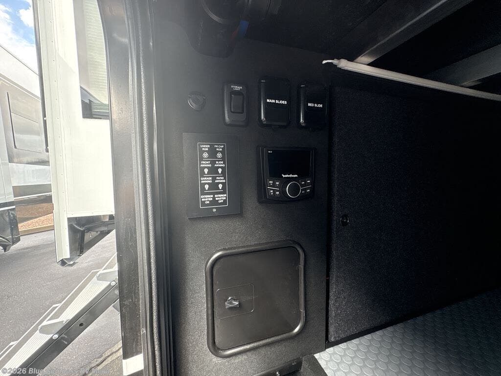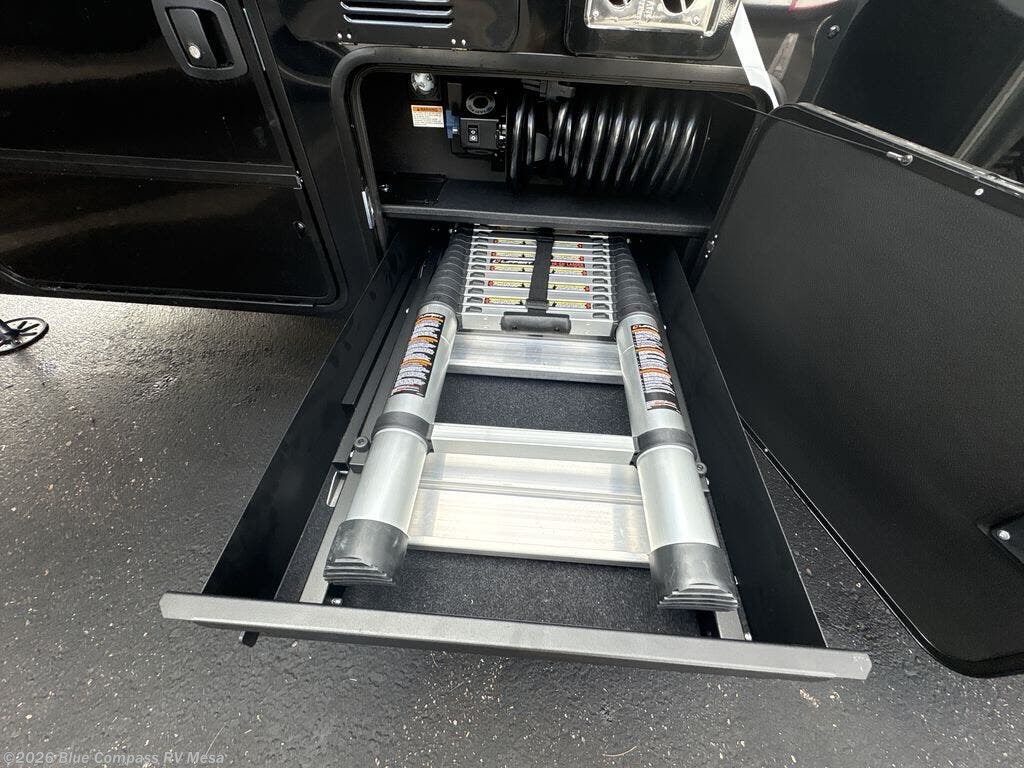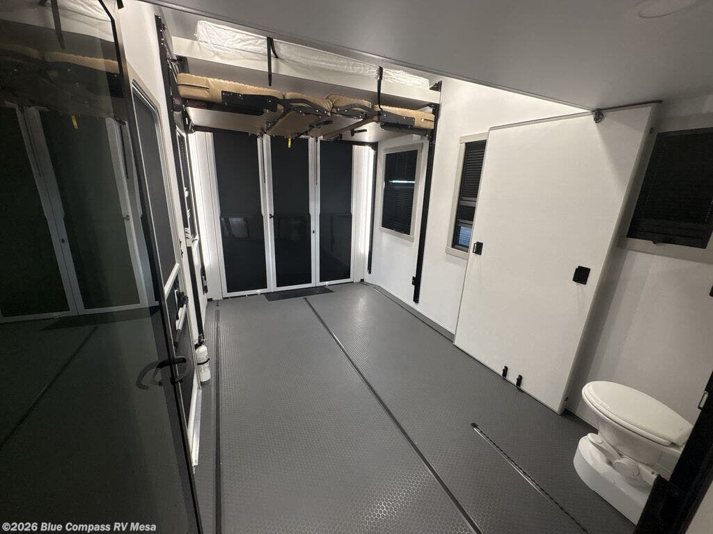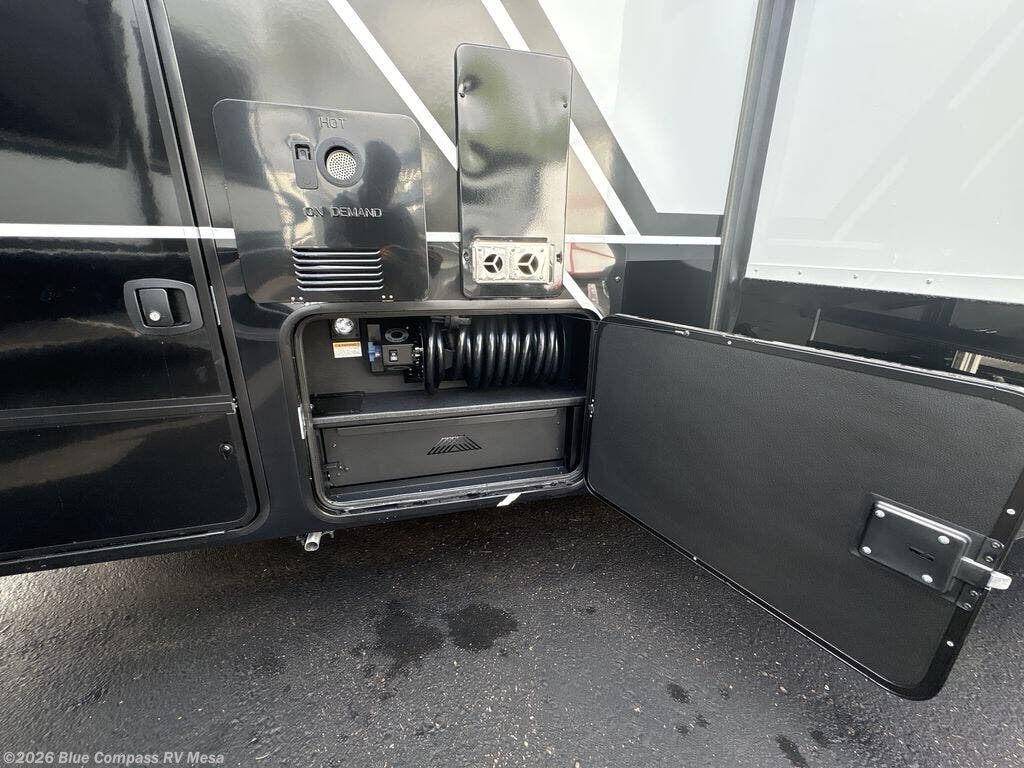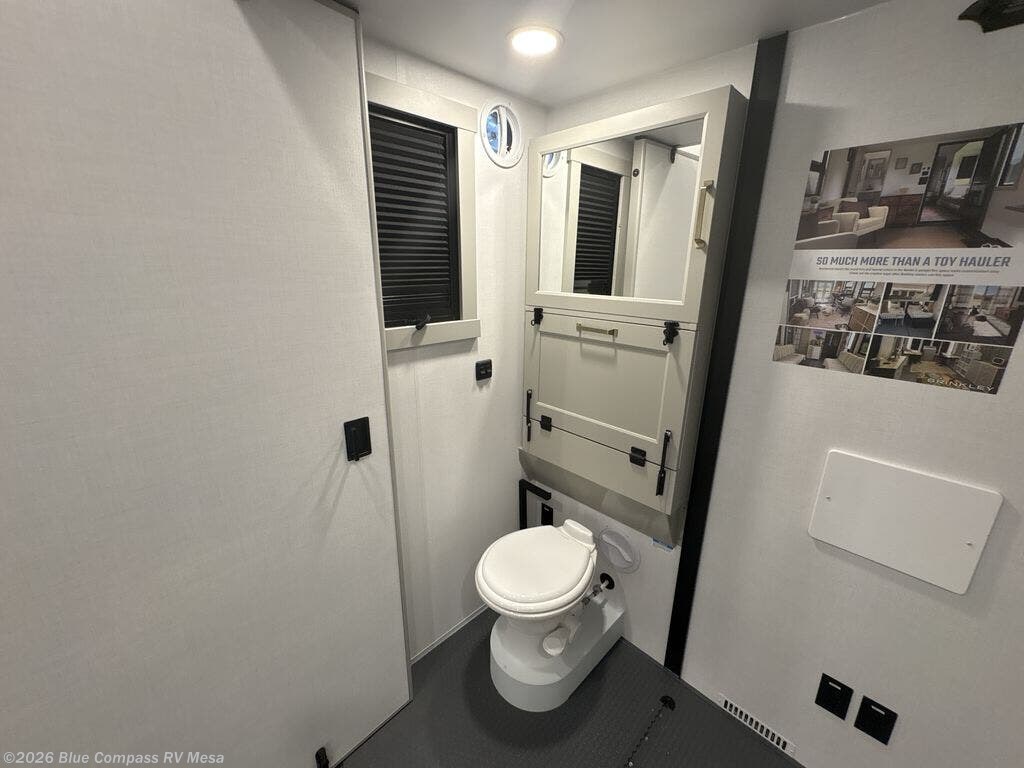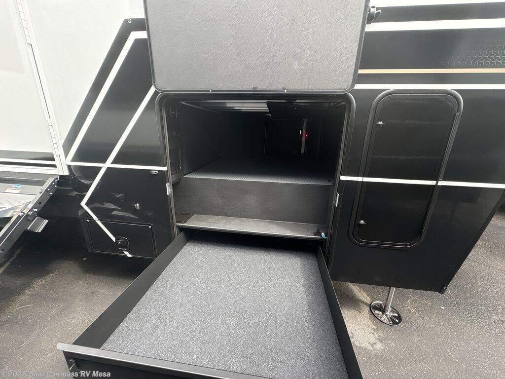 This toy hauler may just be the one you've been looking for! The garage/flex space with fold-away half bath walls will allow you to utilize the garage how you need it, plus there is an adjustable tie-down system, independent dual sofas, plus a loft for storage and a twin bed to sleep more campers! The garage patio with a 1,500 lb. capacity is another feature you are sure to love, especially with its own awning to keep you protected from the elements. Head to the kitchen to prepare meals with a 24" GE oven with a four burner range, a GE microwave with an air fryer, plus a spacious GE Energy Star 19 cu. ft. refrigerator. The island with two stools will let others visit with you while you cook, and there are even hidden dog bowls. You'll find the convertible dining table/L-desk will be accommodating since it can be use to dine at, and to get some work done. You may just find yourselves spending most of your time on the L-sofa in front of the TV and fireplace. A full bath is up front by the bedroom, and here you'll find neon shower lighting, a residential shower system, and pull-out linen storage to keep towels ready to use. After a day outdoors you'll love nothing more than coming back to your own bedroom with a king bed slide out, TV, a walk-in closet, and many more storage spaces. And we haven't even touched on the exterior features, like the 3-way pass-through storage, three power awnings, an air compressor to fill up tires, and the list goes on and on!