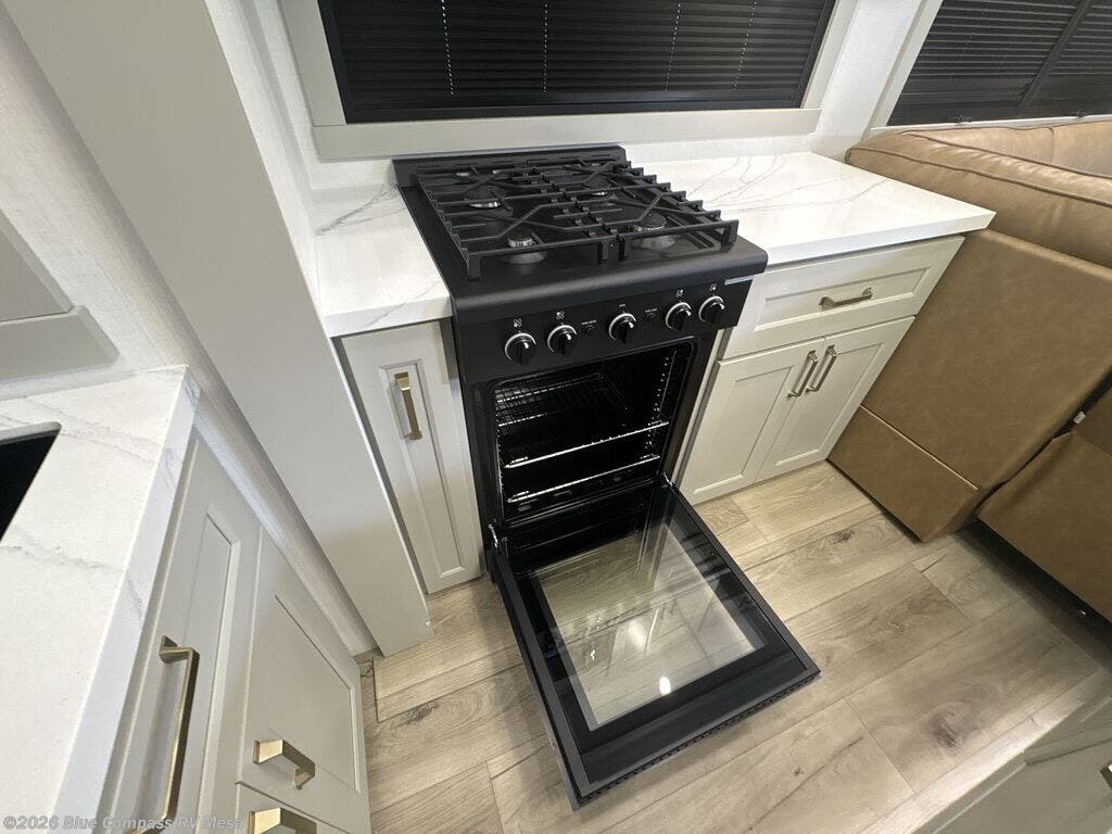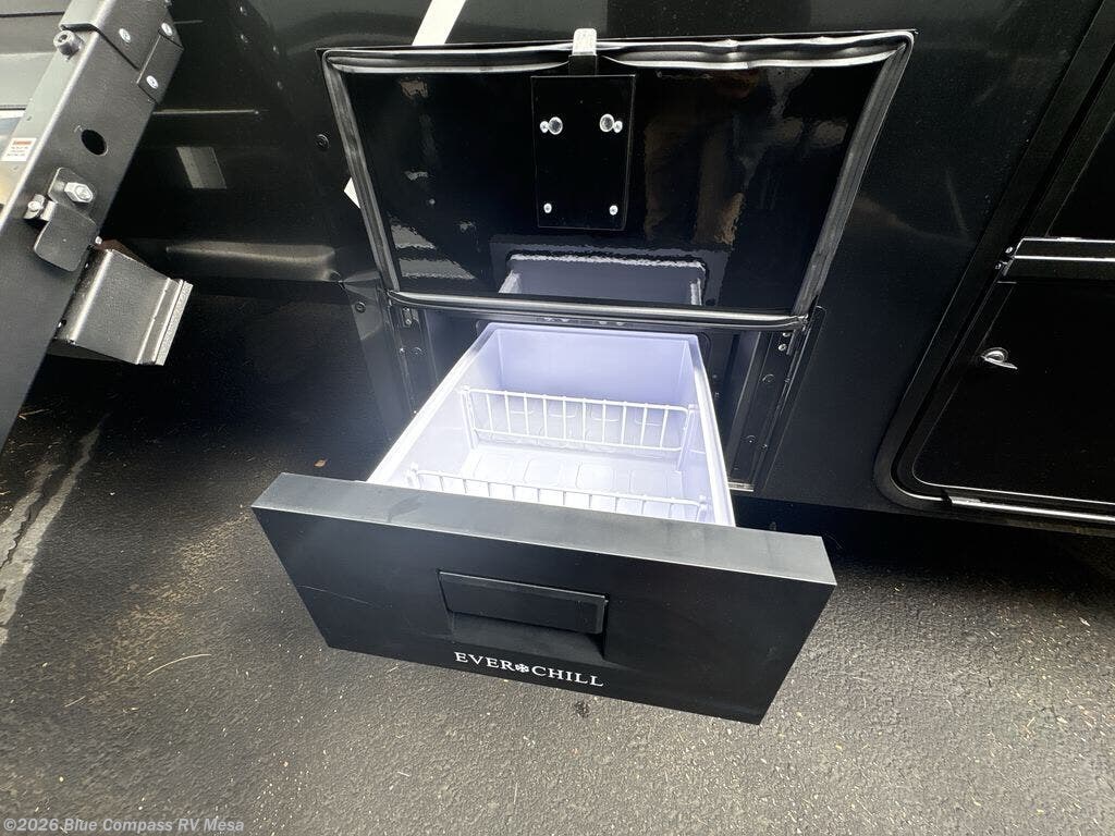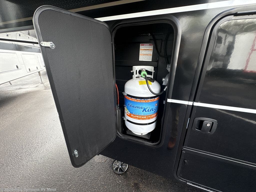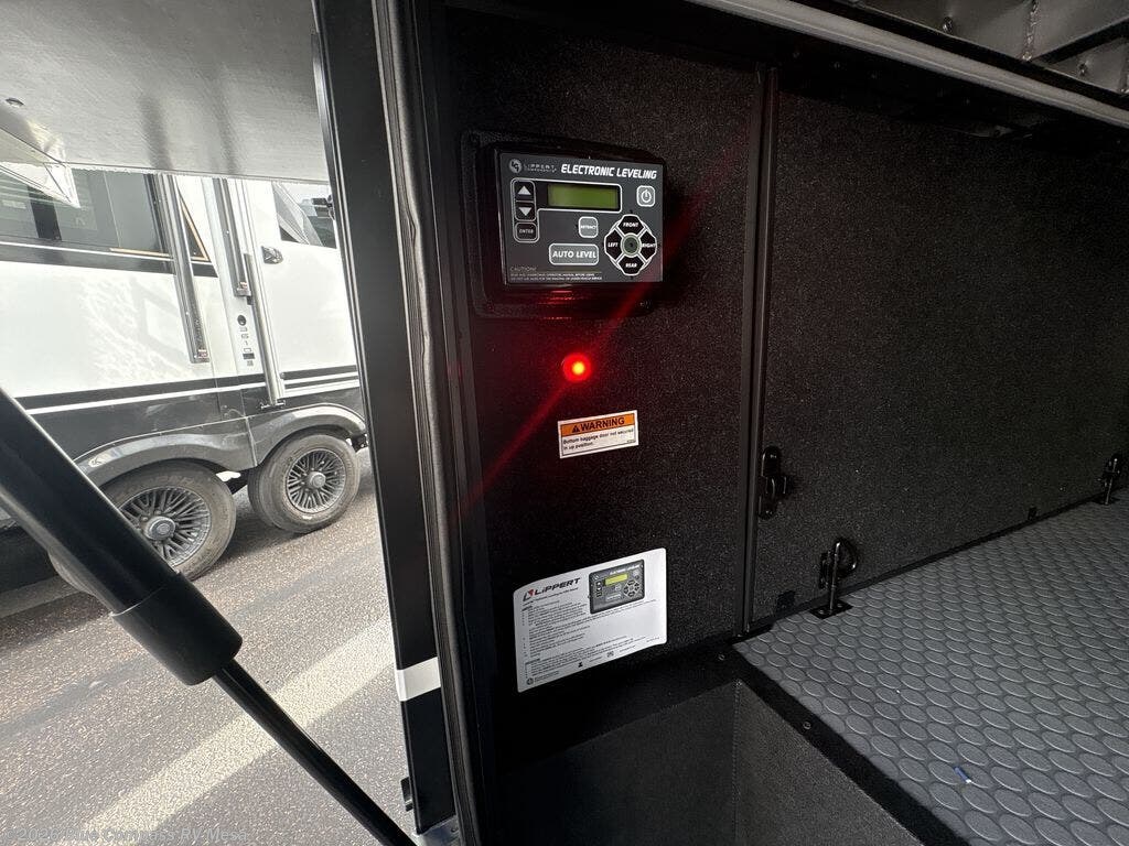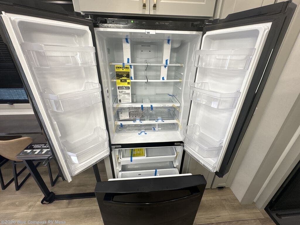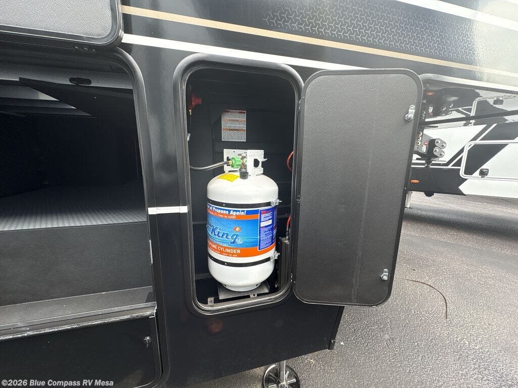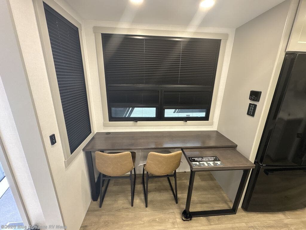 This toy hauler may just be the one you've been looking for! The garage/flex space with fold-away half bath walls will allow you to utilize the garage how you need it, plus there is an adjustable tie-down system, independent dual sofas, plus a loft for storage and a twin bed to sleep more campers! The garage patio with a 1,500 lb. capacity is another feature you are sure to love, especially with its own awning to keep you protected from the elements. Head to the kitchen to prepare meals with a 24" GE oven with a four burner range, a GE microwave with an air fryer, plus a spacious GE Energy Star 19 cu. ft. refrigerator. The island with two stools will let others visit with you while you cook, and there are even hidden dog bowls. You'll find the convertible dining table/L-desk will be accommodating since it can be use to dine at, and to get some work done. You may just find yourselves spending most of your time on the L-sofa in front of the TV and fireplace. A full bath is up front by the bedroom, and here you'll find neon shower lighting, a residential shower system, and pull-out linen storage to keep towels ready to use. After a day outdoors you'll love nothing more than coming back to your own bedroom with a king bed slide out, TV, a walk-in closet, and many more storage spaces. And we haven't even touched on the exterior features, like the 3-way pass-through storage, three power awnings, an air compressor to fill up tires, and the list goes on and on!