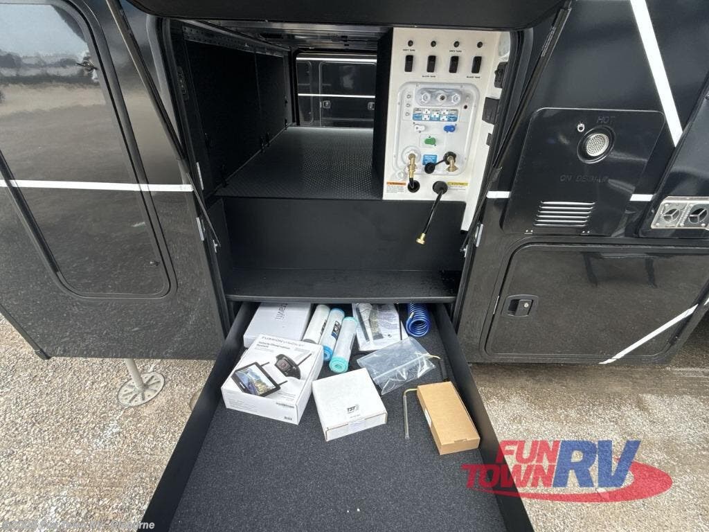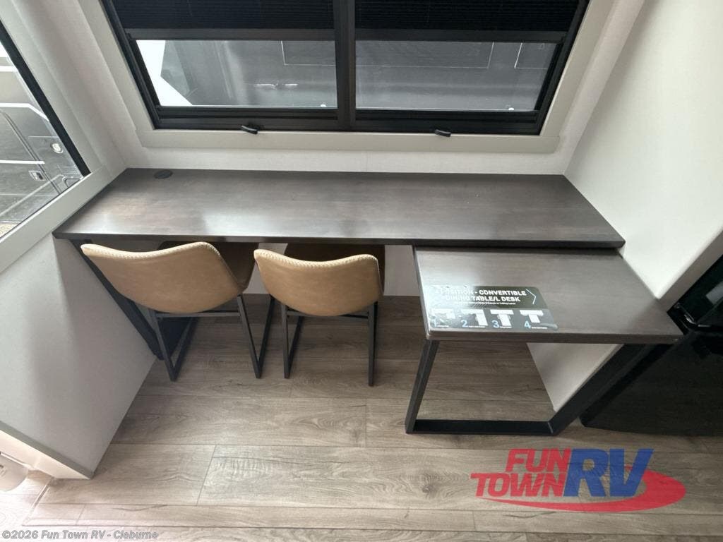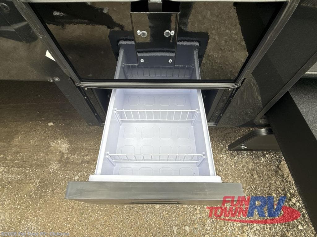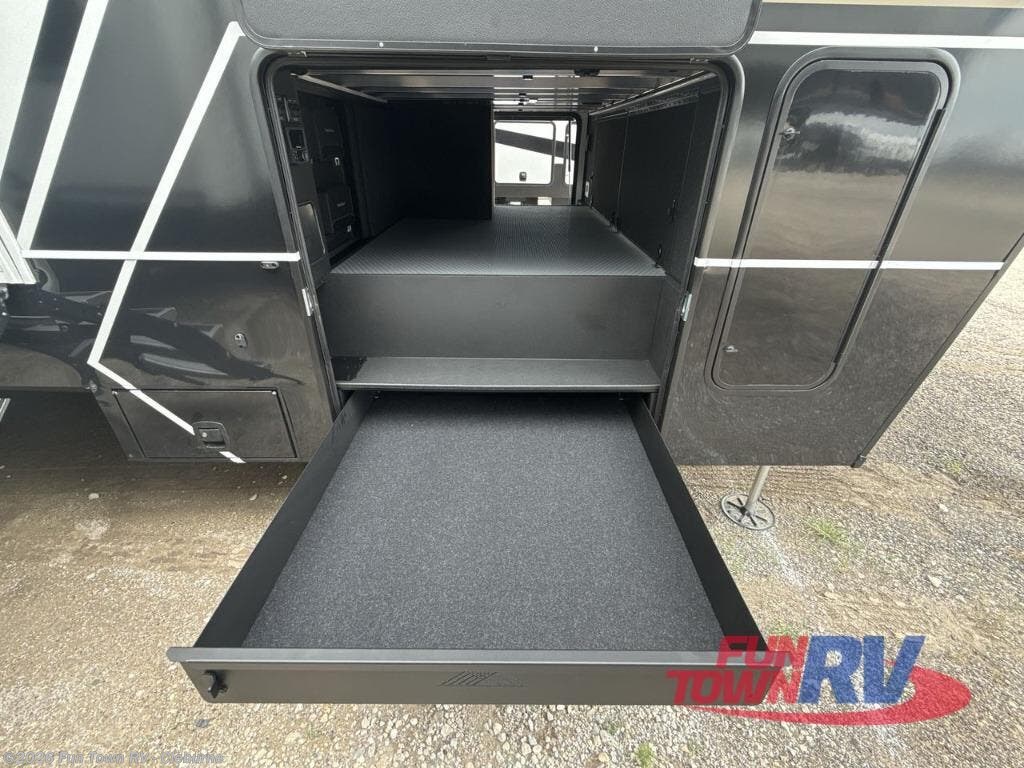 This toy hauler may just be the one you've been looking for! The garage/flex space with fold-away half bath walls will allow you to utilize the garage how you need it, plus there is an adjustable tie-down system, independent dual sofas, plus a loft for storage and a twin bed to sleep more campers! The garage patio with a 1,500 lb. capacity is another feature you are sure to love, especially with its own awning to keep you protected from the elements. Head to the kitchen to prepare meals with a 24" GE oven with a four burner range, a GE microwave with an air fryer, plus a spacious GE Energy Star 19 cu. ft. refrigerator. The island with two stools will let others visit with you while you cook, and there are even hidden dog bowls. You'll find the convertible dining table/L-desk will be accommodating since it can be use to dine at, and to get some work done. You may just find yourselves spending most of your time on the L-sofa in front of the TV and fireplace. A full bath is up front by the bedroom, and here you'll find neon shower lighting, a residential shower system, and pull-out linen storage to keep towels ready to use. After a day outdoors you'll love nothing more than coming back to your own bedroom with a king bed slide out, TV, a walk-in closet, and many more storage spaces. And we haven't even touched on the exterior features, like the 3-way pass-through storage, three power awnings, an air compressor to fill up tires, and the list goes on and on!