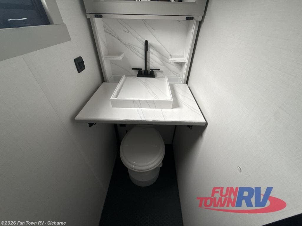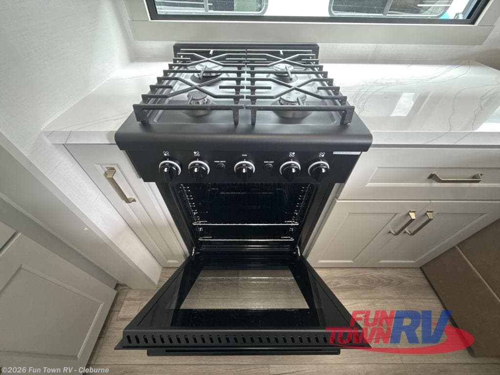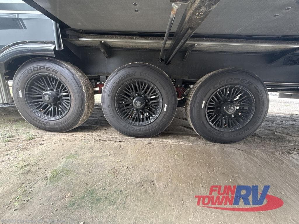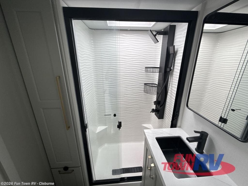 This toy hauler may just be the one you've been looking for! The garage/flex space with fold-away half bath walls will allow you to utilize the garage how you need it, plus there is an adjustable tie-down system, independent dual sofas, plus a loft for storage and a twin bed to sleep more campers! The garage patio with a 1,500 lb. capacity is another feature you are sure to love, especially with its own awning to keep you protected from the elements. Head to the kitchen to prepare meals with a 24" GE oven with a four burner range, a GE microwave with an air fryer, plus a spacious GE Energy Star 19 cu. ft. refrigerator. The island with two stools will let others visit with you while you cook, and there are even hidden dog bowls. You'll find the convertible dining table/L-desk will be accommodating since it can be use to dine at, and to get some work done. You may just find yourselves spending most of your time on the L-sofa in front of the TV and fireplace. A full bath is up front by the bedroom, and here you'll find neon shower lighting, a residential shower system, and pull-out linen storage to keep towels ready to use. After a day outdoors you'll love nothing more than coming back to your own bedroom with a king bed slide out, TV, a walk-in closet, and many more storage spaces. And we haven't even touched on the exterior features, like the 3-way pass-through storage, three power awnings, an air compressor to fill up tires, and the list goes on and on!