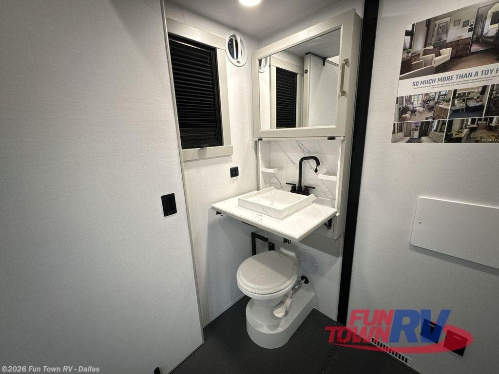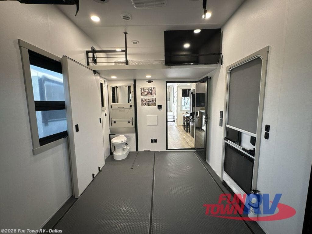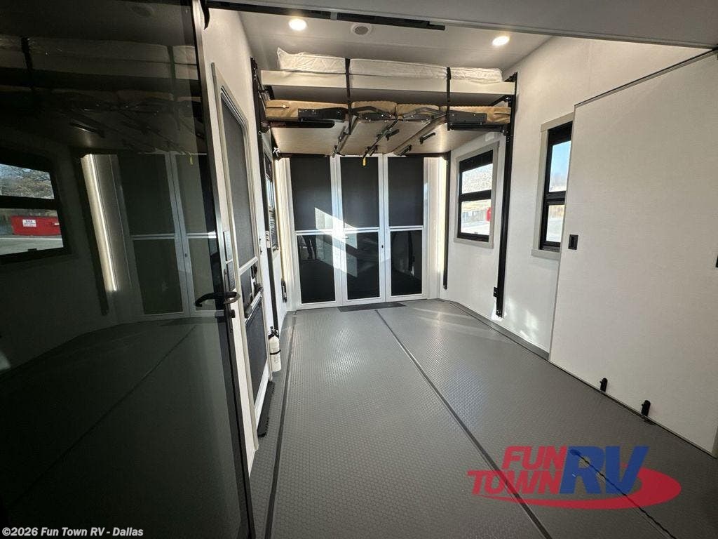 This toy hauler may just be the one you've been looking for! The garage/flex space with fold-away half bath walls will allow you to utilize the garage how you need it, plus there is an adjustable tie-down system, independent dual sofas, plus a loft for storage and a twin bed to sleep more campers! The garage patio with a 1,500 lb. capacity is another feature you are sure to love, especially with its own awning to keep you protected from the elements. Head to the kitchen to prepare meals with a 24" GE oven with a four-burner range, a GE microwave with an air fryer, plus a spacious GE Energy Star 19 cu. ft. refrigerator. The island with two stools will let others visit with you while you cook, and there are even hidden dog bowls. You'll find the convertible dining table/L-desk will be accommodating since it can be used to dine at, and to get some work done. You may just find yourselves spending most of your time on the L-sofa in front of the TV and fireplace. A full bath is up front by the bedroom, and here you'll find neon shower lighting, a residential shower system, and pull-out linen storage to keep towels ready to use. After a day outdoors you'll love nothing more than coming back to your own bedroom with a king bed slide out, TV, a walk-in closet, and many more storage spaces. And we haven't even touched on the exterior features, like the 3-way pass-through storage, four power awnings, an air compressor to fill up tires, and the list goes on and on!