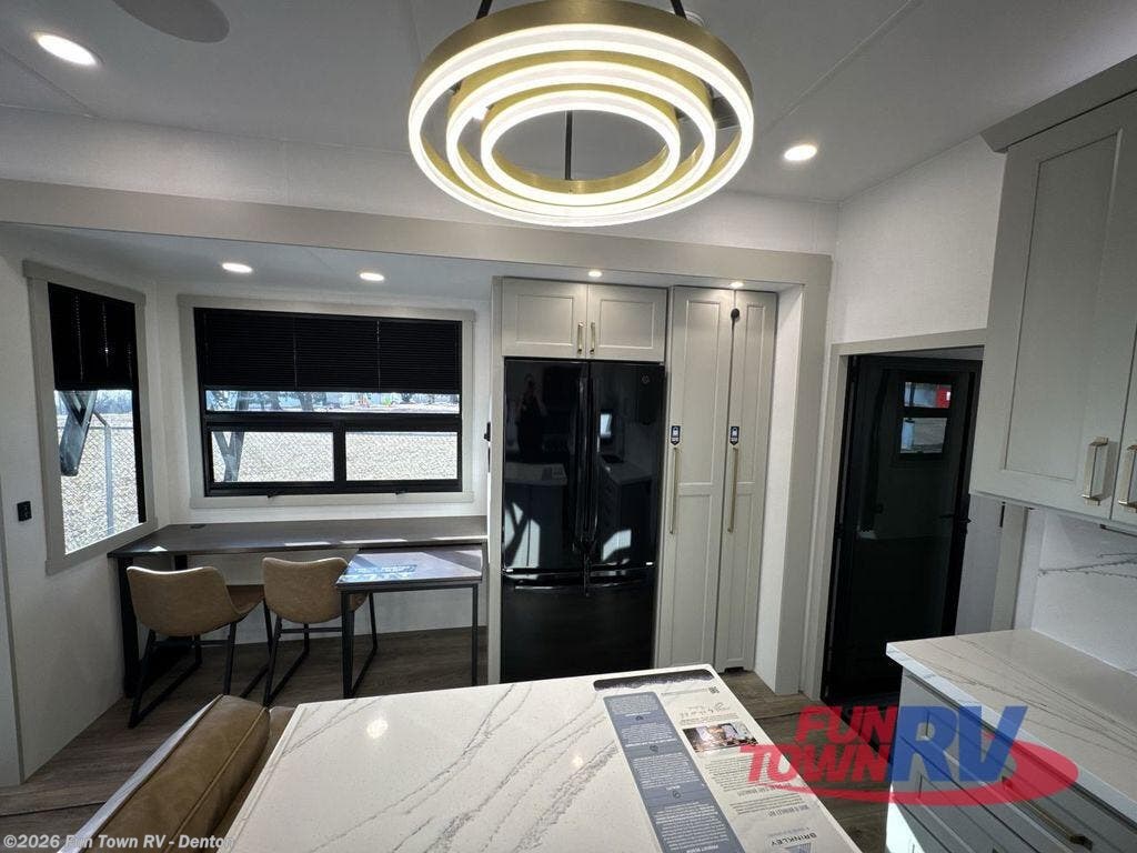 This toy hauler may just be the one you've been looking for! The garage/flex space with fold-away half bath walls will allow you to utilize the garage how you need it, plus there is an adjustable tie-down system, independent dual sofas, plus a loft for storage and a twin bed to sleep more campers! The garage patio with a 1,500 lb. capacity is another feature you are sure to love, especially with its own awning to keep you protected from the elements. Head to the kitchen to prepare meals with a 24" GE oven with a four-burner range, a GE microwave with an air fryer, plus a spacious GE Energy Star 19 cu. ft. refrigerator. The island with two stools will let others visit with you while you cook, and there are even hidden dog bowls. You'll find the convertible dining table/L-desk will be accommodating since it can be used to dine at, and to get some work done. You may just find yourselves spending most of your time on the L-sofa in front of the TV and fireplace. A full bath is up front by the bedroom, and here you'll find neon shower lighting, a residential shower system, and pull-out linen storage to keep towels ready to use. After a day outdoors you'll love nothing more than coming back to your own bedroom with a king bed slide out, TV, a walk-in closet, and many more storage spaces. And we haven't even touched on the exterior features, like the 3-way pass-through storage, four power awnings, an air compressor to fill up tires, and the list goes on and on!