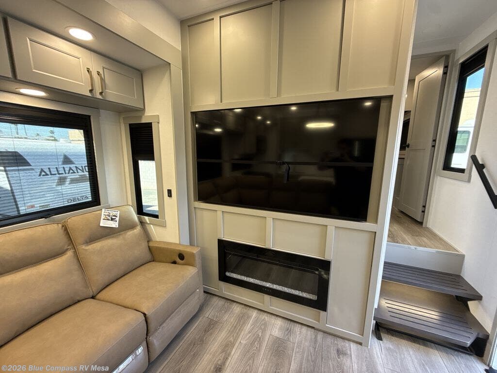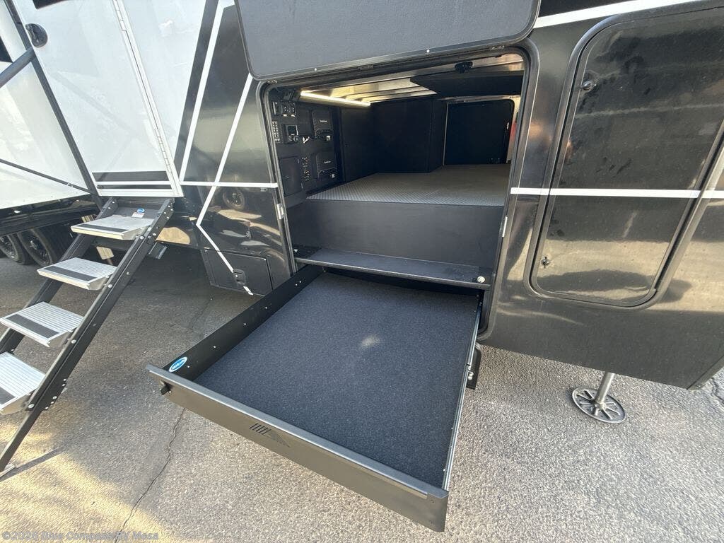This toy hauler may just be the one you've been looking for! The garage/flex space with fold-away half bath walls will allow you to utilize the garage how you need it, plus there is an adjustable tie-down system, independent dual sofas, plus a loft for storage and a twin bed to sleep more campers! The garage patio with a 1,500 lb. capacity is another feature you are sure to love, especially with its own awning to keep you protected from the elements. Head to the kitchen to prepare meals with a 24" GE oven with a four-burner range, a GE microwave with an air fryer, plus a spacious GE Energy Star 19 cu. ft. refrigerator. The island with two stools will let others visit with you while you cook, and there are even hidden dog bowls. You'll find the convertible dining table/L-desk will be accommodating since it can be used to dine at, and to get some work done. You may just find yourselves spending most of your time on the L-sofa in front of the TV and fireplace. A full bath is up front by the bedroom, and here you'll find neon shower lighting, a residential shower system, and pull-out linen storage to keep towels ready to use. After a day outdoors you'll love nothing more than coming back to your own bedroom with a king bed slide out, TV, a walk-in closet, and many more storage spaces. And we haven't even touched on the exterior features, like the 3-way pass-through storage, four power awnings, an air compressor to fill up tires, and the list goes on and on!