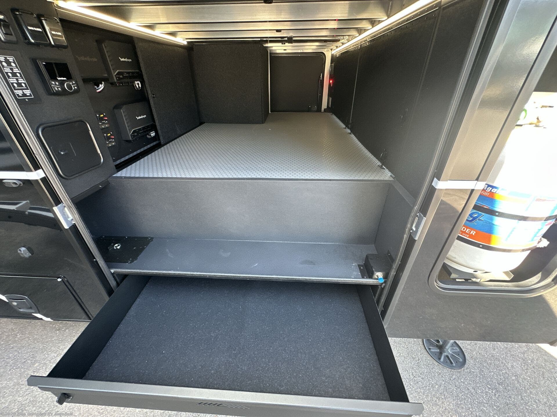 This toy hauler may just be the one you've been looking for! The garage/flex space with fold-away half bath walls will allow you to utilize the garage how you need it, plus there is an adjustable tie-down system, independent dual sofas, plus a loft for storage and a twin bed to sleep more campers! The garage patio with a 1,500 lb. capacity is another feature you are sure to love, especially with its own awning to keep you protected from the elements. Head to the kitchen to prepare meals with a 24" GE oven with a four burner range, a GE microwave with an air fryer, plus a spacious GE Energy Star 19 cu. ft. refrigerator. The island with two stools will let others visit with you while you cook, and there are even hidden dog bowls. You'll find the convertible dining table/L-desk will be accommodating since it can be use to dine at, and to get some work done. You may just find yourselves spending most of your time on the L-sofa in front of the TV and fireplace. A full bath is up front by the bedroom, and here you'll find neon shower lighting, a residential shower system, and pull-out linen storage to keep towels ready to use. After a day outdoors you'll love nothing more than coming back to your own bedroom with a king bed slide out, TV, a walk-in closet, and many more storage spaces. And we haven't even touched on the exterior features, like the 3-way pass-through storage, three power awnings, an air compressor to fill up tires, and the list goes on and on!