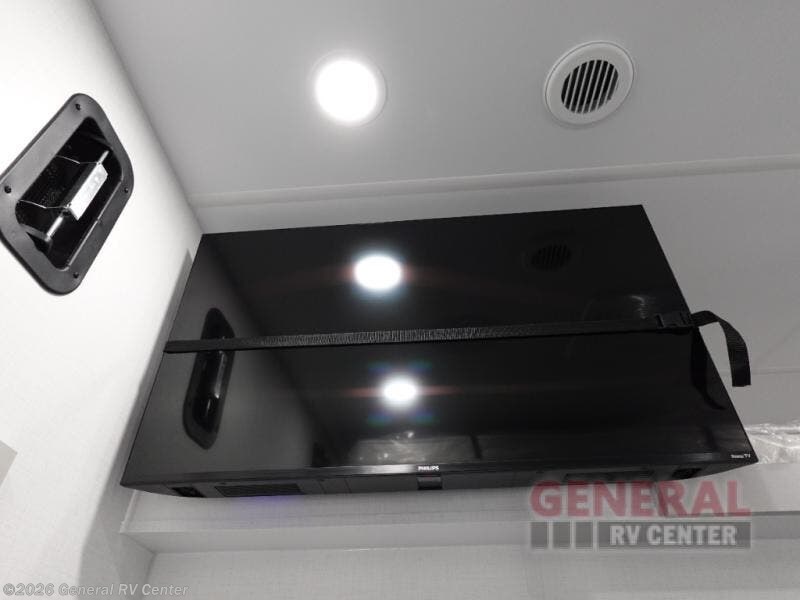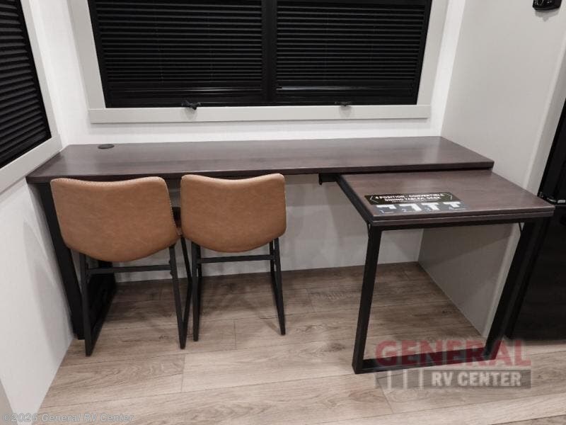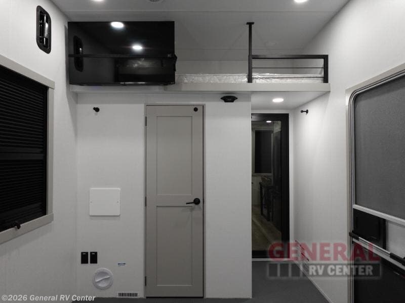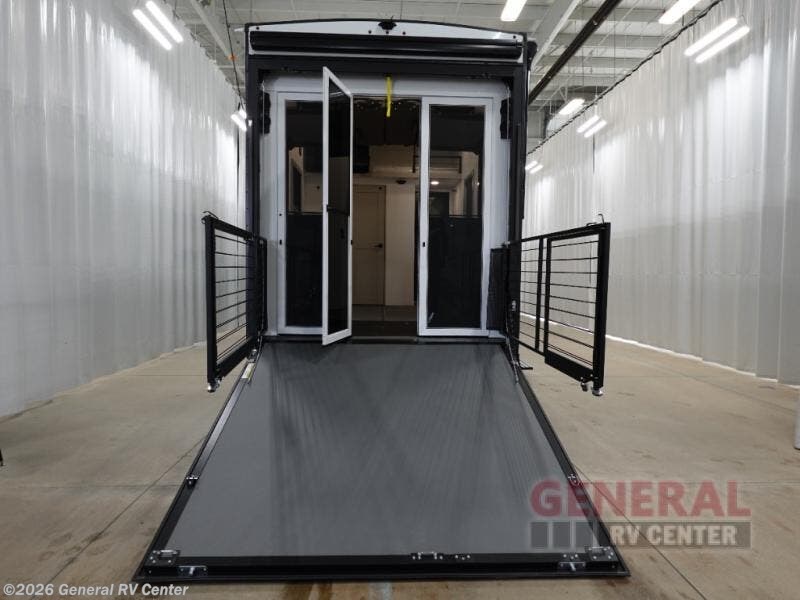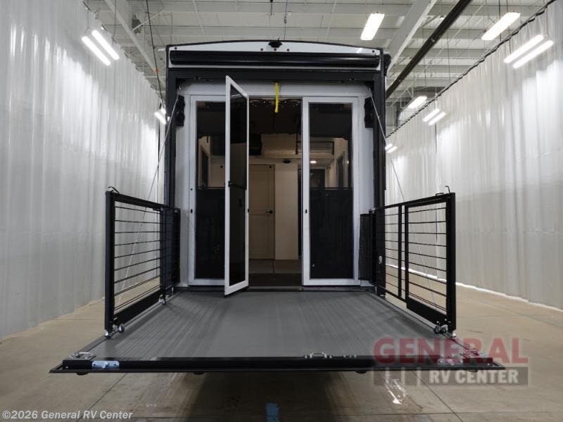 Whether you use this toy hauler to haul your favorite ride-on toys or as a mobile office, you're sure to love every inch of it! The 14' separate garage includes a Fold-N-Stow table and independent dual sofas, along with a full bath and a loft/storage with a twin bed for more sleeping space. The middle kitchen is every chef's dream with its GE appliances, kitchen island, and convenient features, such as pull-out trash bins and a cutting board, a pull-down knife rack and utensil tray, and a pull-out pantry/utility closet! Right next to the kitchen is the living room with a L-sofa with four modes, a 65" Phillips Smart TV and a fireplace, plus a convertible dining table/L-desk where you can dine or get some work done. You'll love the second full bath up front close to the private bedroom, and here, you'll find a king bed slide out, under-bed storage drawers and motion lights, a walk-in closet with cordless vacuum prep, and a sliding dresser top with hidden storage for valuables. There is also washer and dryer prep in the bedroom and garage, making this toy hauler full-time capable!