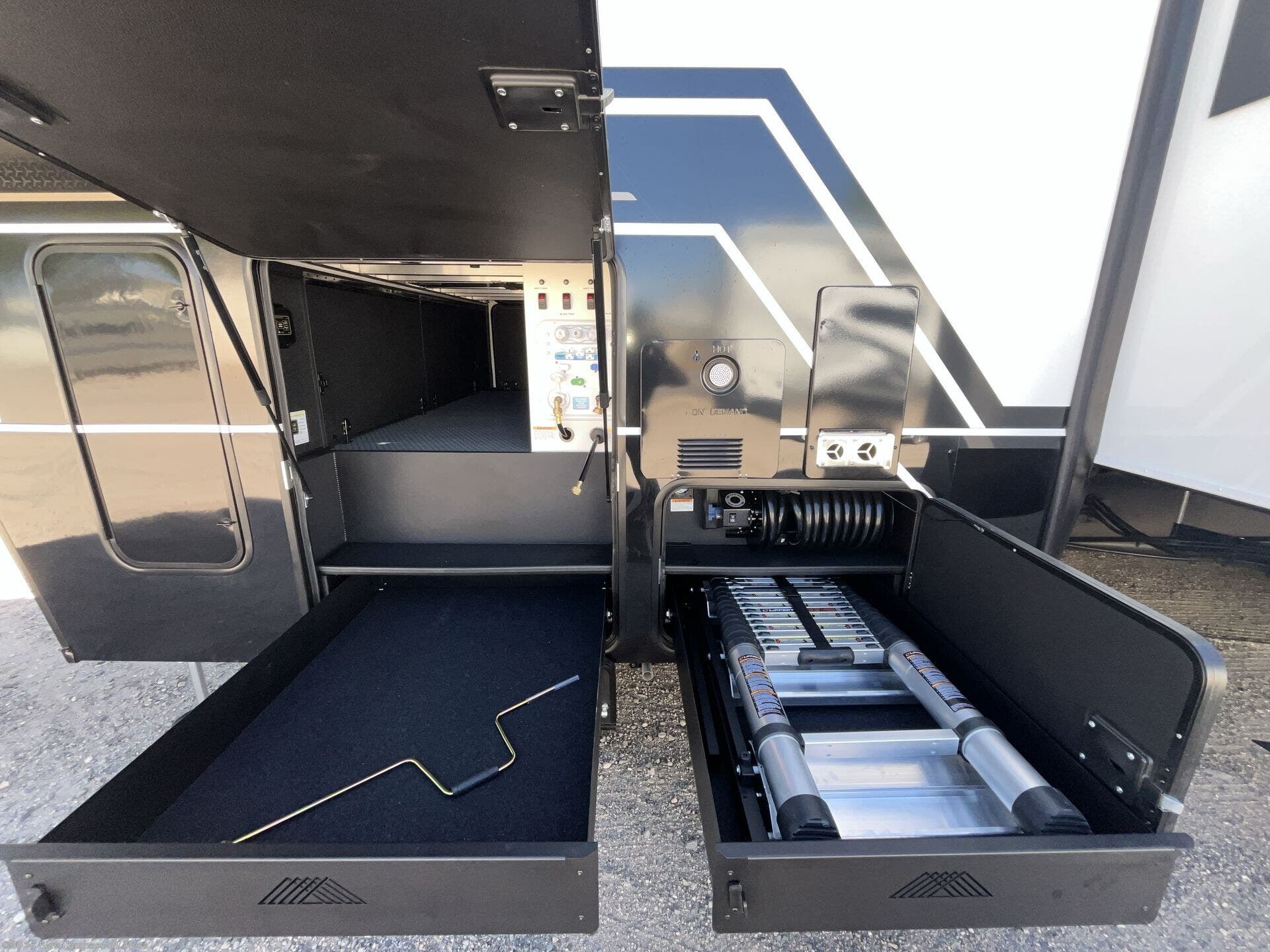 With any Model G toy hauler fifth wheel by Brinkley you will enjoy luxurious amenities, tons of storage space, and innovative features that have been developed and tested in the real world. Durable construction includes an industry leading PDI process, an industry best insulation package, and reinforced and walkable slide roofs. Some of the exterior features you'll find are a 3-way pass-through with a multi-functional flip-up bulkhead wall, under I-beam storage, a MAX-Vision reverse lighting system, and a low-maintenance roof to name a few. A Rockford Fosgate audio system comes standard, along with a OneControl app system that lets you control your fifth wheel's functions right from your mobile device. You will find the solar system with a designated storage area to be ultra convenient, plus there is a FlexPower 5500 with a dual fuel inverter generator for all your power needs. Head inside to find a residential interior with Brinkley's CraftSense wood trim construction, floating entrance steps, integrated window screens and insulated blackout blinds, and residential solid surface countertops plus backsplash. You will also enjoy the neon shower lighting and recessed medicine cabinets in the bath, plus motion activated LED bed lights and dual bedside outlets in the bedroom. Choose a Model G toy hauler fifth wheel to experience all the luxury it has to offer!