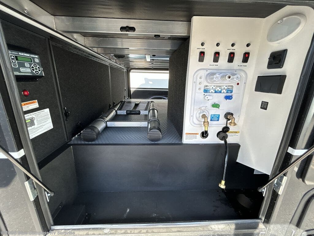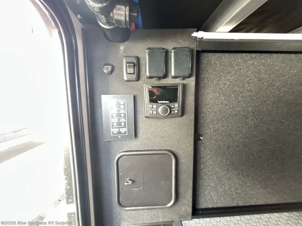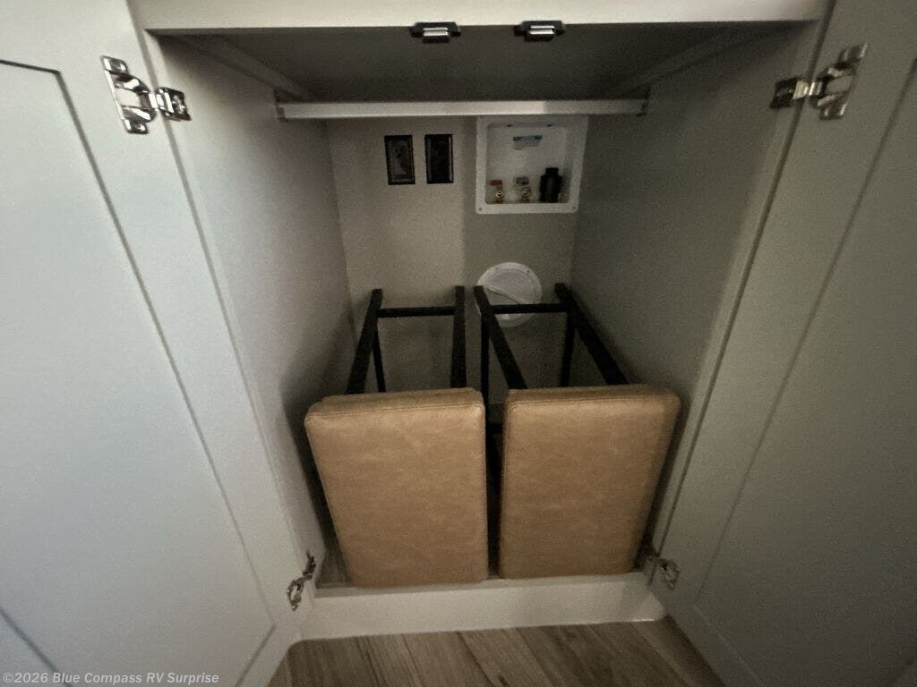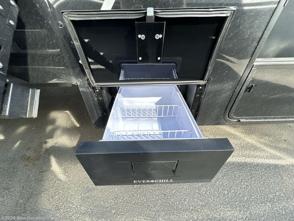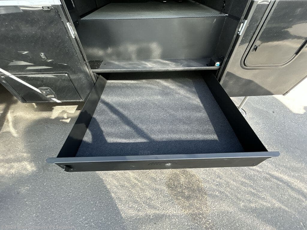 Whether you use this toy hauler to haul your favorite ride-on toys or as a mobile office, you're sure to love every inch of it! The 14' separate garage includes a Fold-N-Stow table and independent dual sofas, along with a full bath and a loft/storage with a twin bed for more sleeping space. The middle kitchen is every chef's dream with its GE appliances, kitchen island, and convenient features, such as pull-out trash bins and a cutting board, a pull-down knife rack and utensil tray, and a pull-out pantry/utility closet! Right next to the kitchen is the living room with a L-sofa with four modes, a 65" Phillips Smart TV and a fireplace, plus a convertible dining table/L-desk where you can dine or get some work done. You'll love the second full bath up front close to the private bedroom, and here, you'll find a king bed slide out, under-bed storage drawers and motion lights, a walk-in closet with cordless vacuum prep, and a sliding dresser top with hidden storage for valuables. There is also washer and dryer prep in the bedroom and garage, making this toy hauler full-time capable!