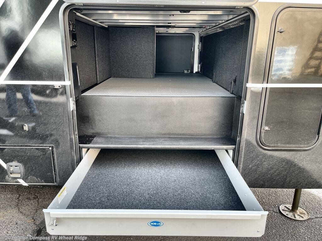 Whether you use this toy hauler to haul your favorite ride-on toys or as a mobile office, you're sure to love every inch of it! The 11' garage includes a Fold-N-Stow table and independent dual sofas, along with a full bath and a loft/storage with a twin bed for more sleeping space. The middle kitchen is every chef's dream with its GE appliances, kitchen island, and convenient features, such as pull-out trash bins and a cutting board, a pull-down knife rack and utensil tray, and a pull-out pantry/utility closet! Right next to the kitchen is the living room with a L-sofa, a 65" Phillips Smart TV and a fireplace, plus a convertible dining table/L-desk where you can dine or get some work done. You'll love the second full bath up front close to the private bedroom, and here, you'll find a king bed slide out, under-bed storage drawers and motion lights, a walk-in closet with cordless vacuum prep, and a sliding dresser top with hidden storage for valuables. There is also washer and dryer prep in the bedroom and garage, making this toy hauler full-time capable!