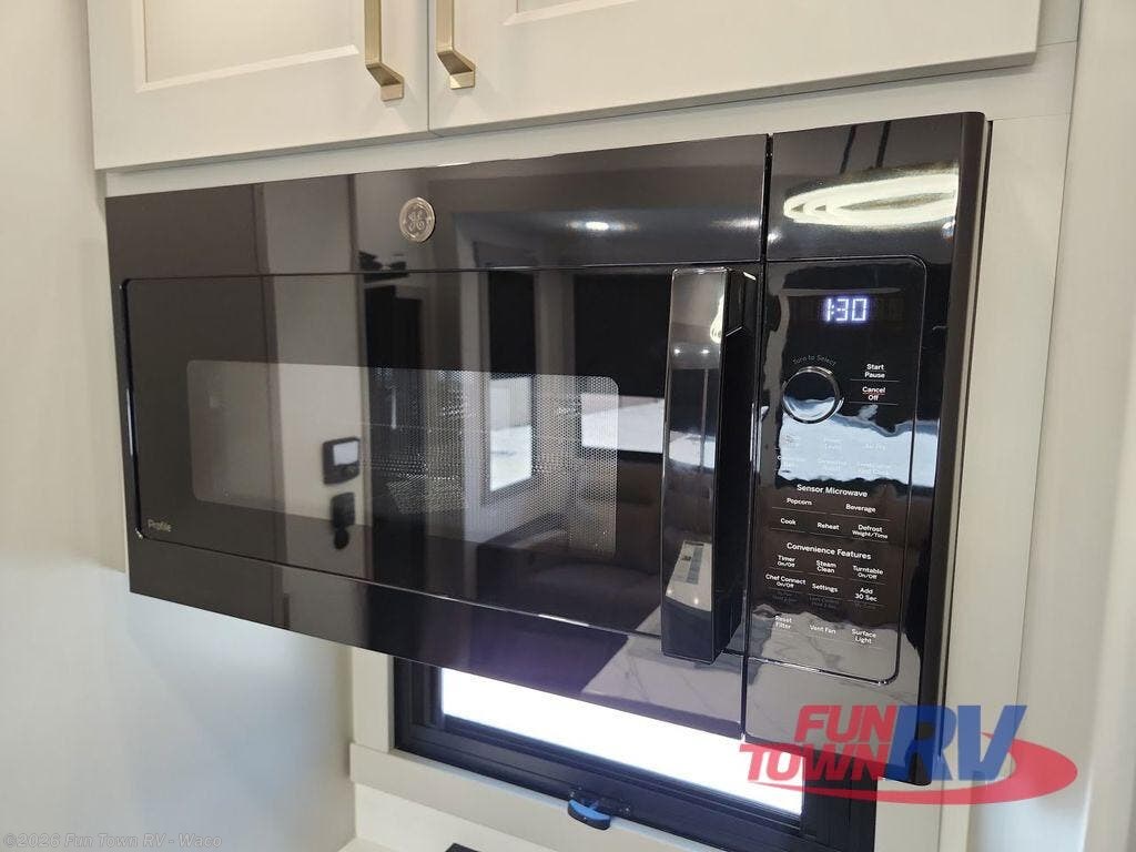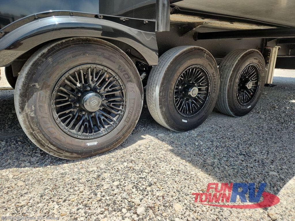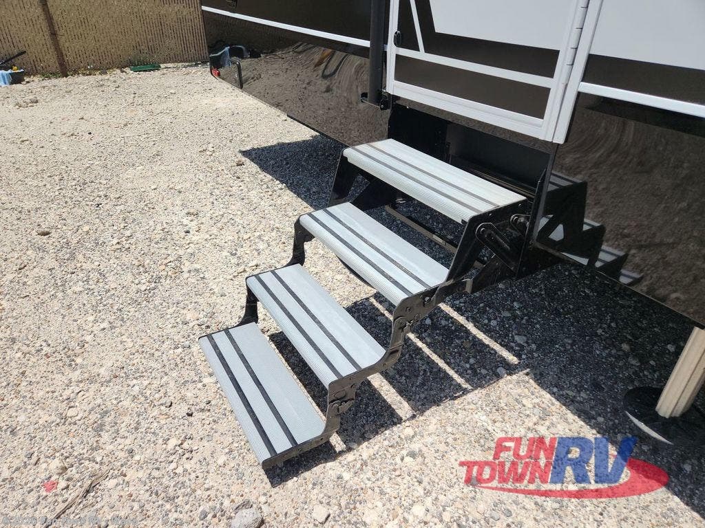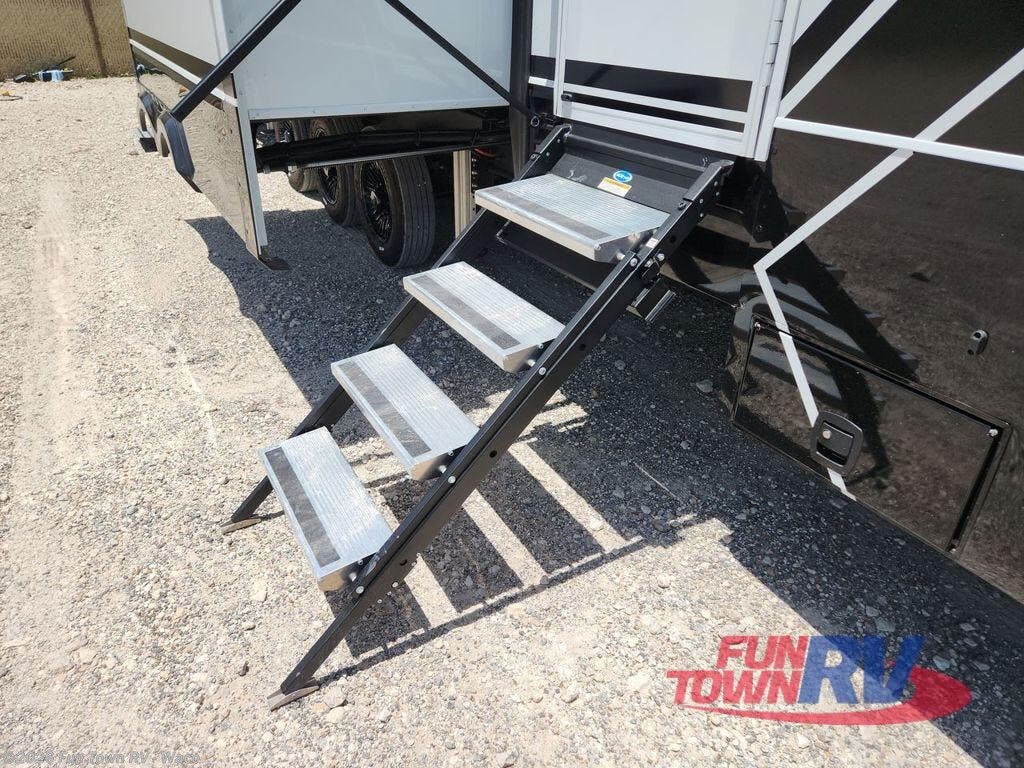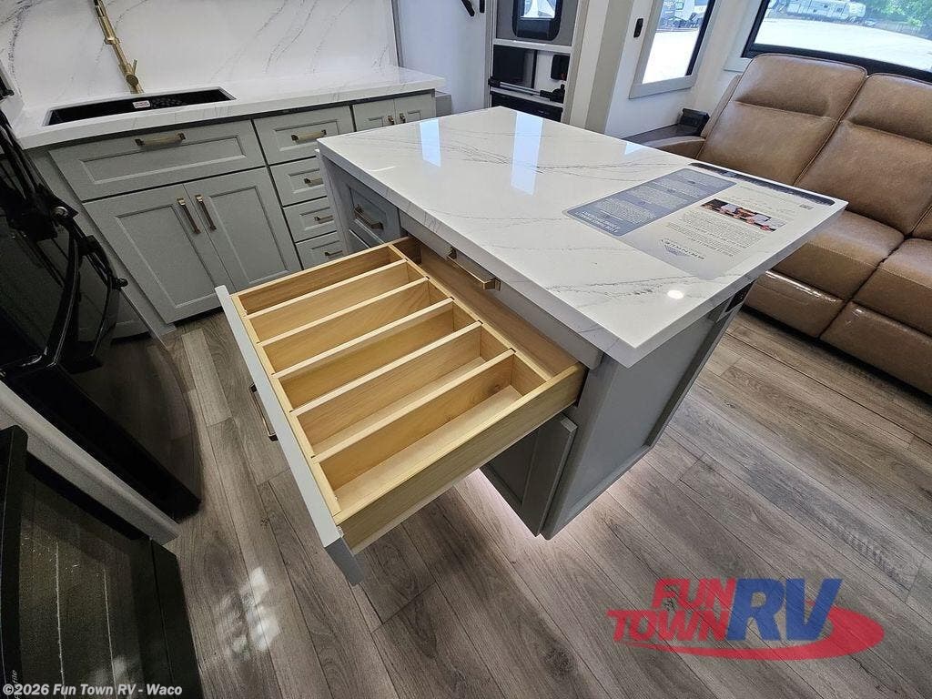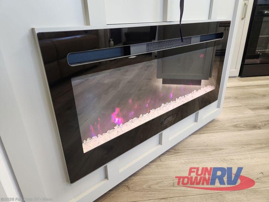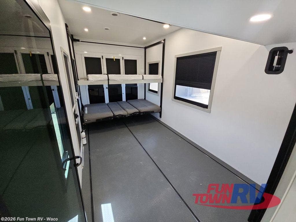 Prepare to be amazed by all the features packed into this toy hauler! There are triple slides that will provide your crew with more space, a 16' separate garage flex area that can sleep five with the loft included, plus a bath and a half for added convenience. The chef in your group will love the middle kitchen with a waterfall island that converts to a counter peninsula, a pull-out pantry, a GE Energy Star 19 cu. ft. refrigerator with ice and filtered water, and much more. In the combined kitchen and living area you'll find a spacious sofa with heat and massage, a fireplace, a TV, plus convenient dog bowls and shoe storage. After your toys are unloaded from the garage, you can relax on the independent dual couches with a Fold-N-Stow table in between. You will find the front private bedroom with a king bed slide out will provide a great night's rest, and you'll also find a walk-in closet, under-bed storage, and a sliding dresser top with hidden storage for special belongings.