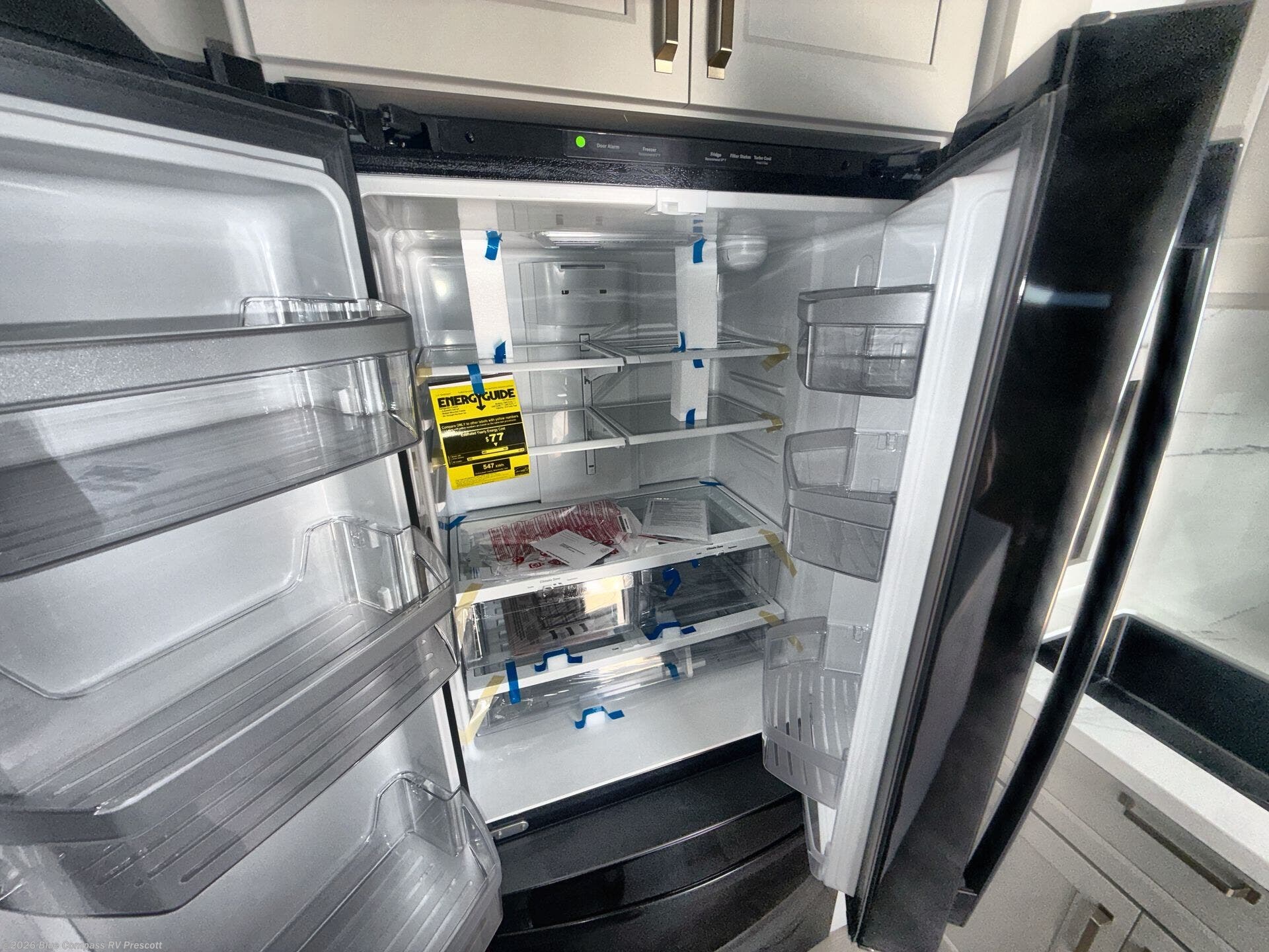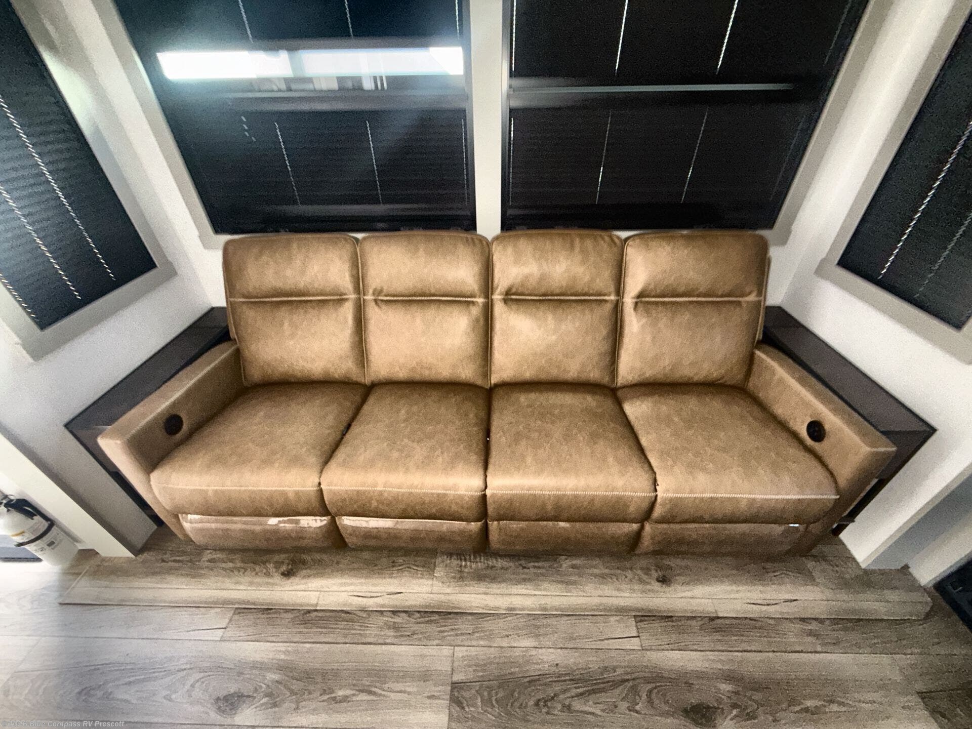 Prepare to be amazed by all the features packed into this toy hauler! There are triple slides that will provide your crew with more space, a 16' separate garage flex area that can sleep five with the loft included, plus a bath and a half for added convenience. The chef in your group will love the middle kitchen with a waterfall island that converts to a counter peninsula, a pull-out pantry, a GE Energy Star 19 cu. ft. refrigerator with ice and filtered water, and much more. In the combined kitchen and living area you'll find a spacious sofa with heat and massage, a fireplace, a TV, plus convenient dog bowls and shoe storage. After your toys are unloaded from the garage, you can relax on the independent dual couches with a Fold-N-Stow table in between. You will find the front private bedroom with a king bed slide out will provide a great night's rest, and you'll also find a walk-in closet, under-bed storage, and a sliding dresser top with hidden storage for special belongings.