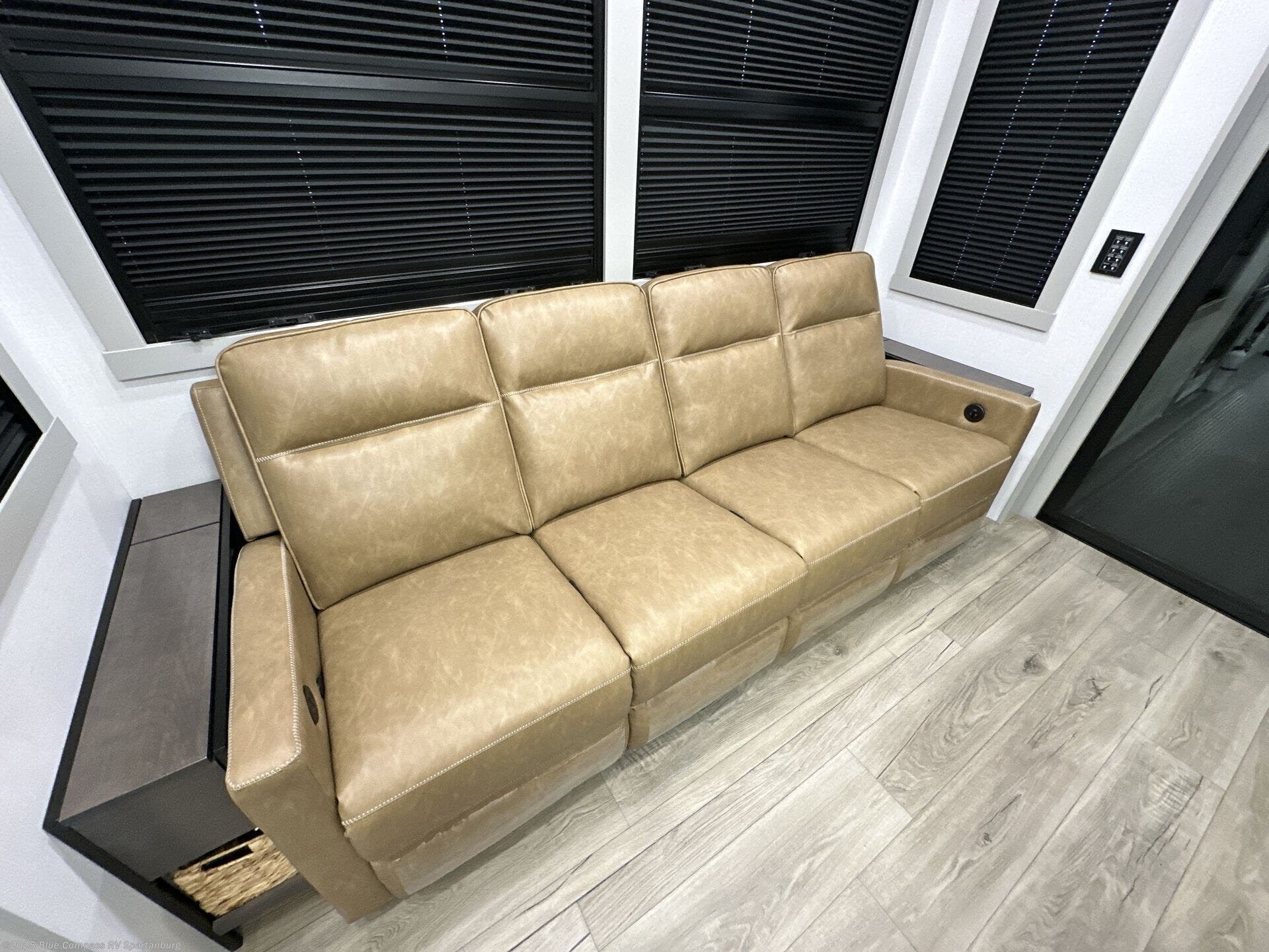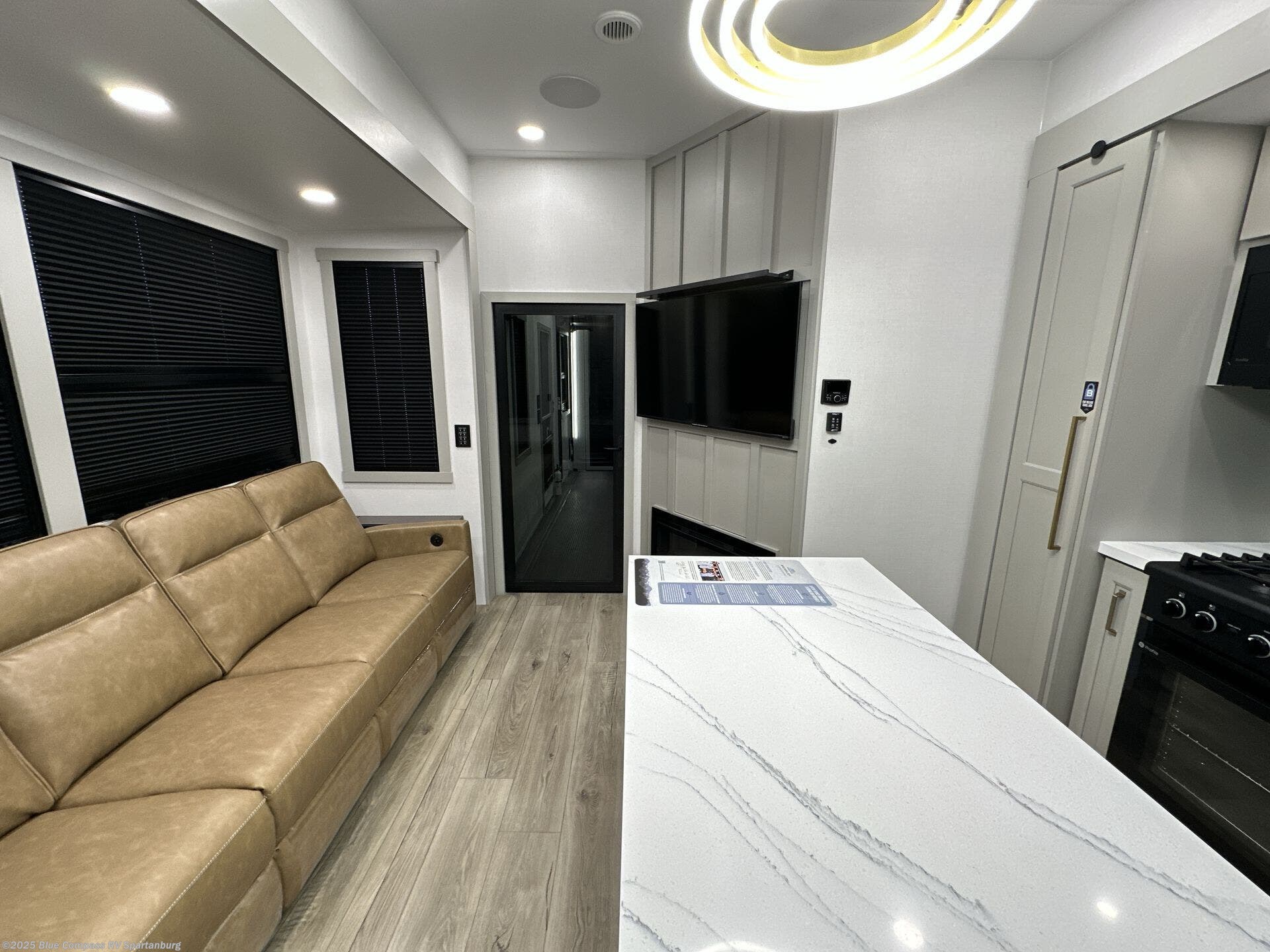 With any Model G toy hauler fifth wheel by Brinkley you will enjoy luxurious amenities, tons of storage space, and innovative features that have been developed and tested in the real world. Durable construction includes an industry leading PDI process, an industry best insulation package, and reinforced and walkable slide roofs. Some of the exterior features you'll find are a 3-way pass-through with a multi-functional flip-up bulkhead wall, under I-beam storage, a MAX-Vision reverse lighting system, and a low-maintenance roof to name a few. A Rockford Fosgate audio system comes standard, along with a OneControl app system that lets you control your fifth wheel's functions right from your mobile device. You will find the solar system with a designated storage area to be ultra convenient, plus there is a FlexPower 5500 with a dual fuel inverter generator for all your power needs. Head inside to find a residential interior with Brinkley's CraftSense wood trim construction, floating entrance steps, integrated window screens and insulated blackout blinds, and residential solid surface countertops plus backsplash. You will also enjoy the neon shower lighting and recessed medicine cabinets in the bath, plus motion activated LED bed lights and dual bedside outlets in the bedroom. Choose a Model G toy hauler fifth wheel to experience all the luxury it has to offer!