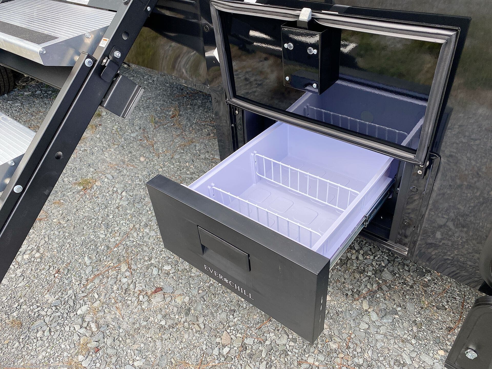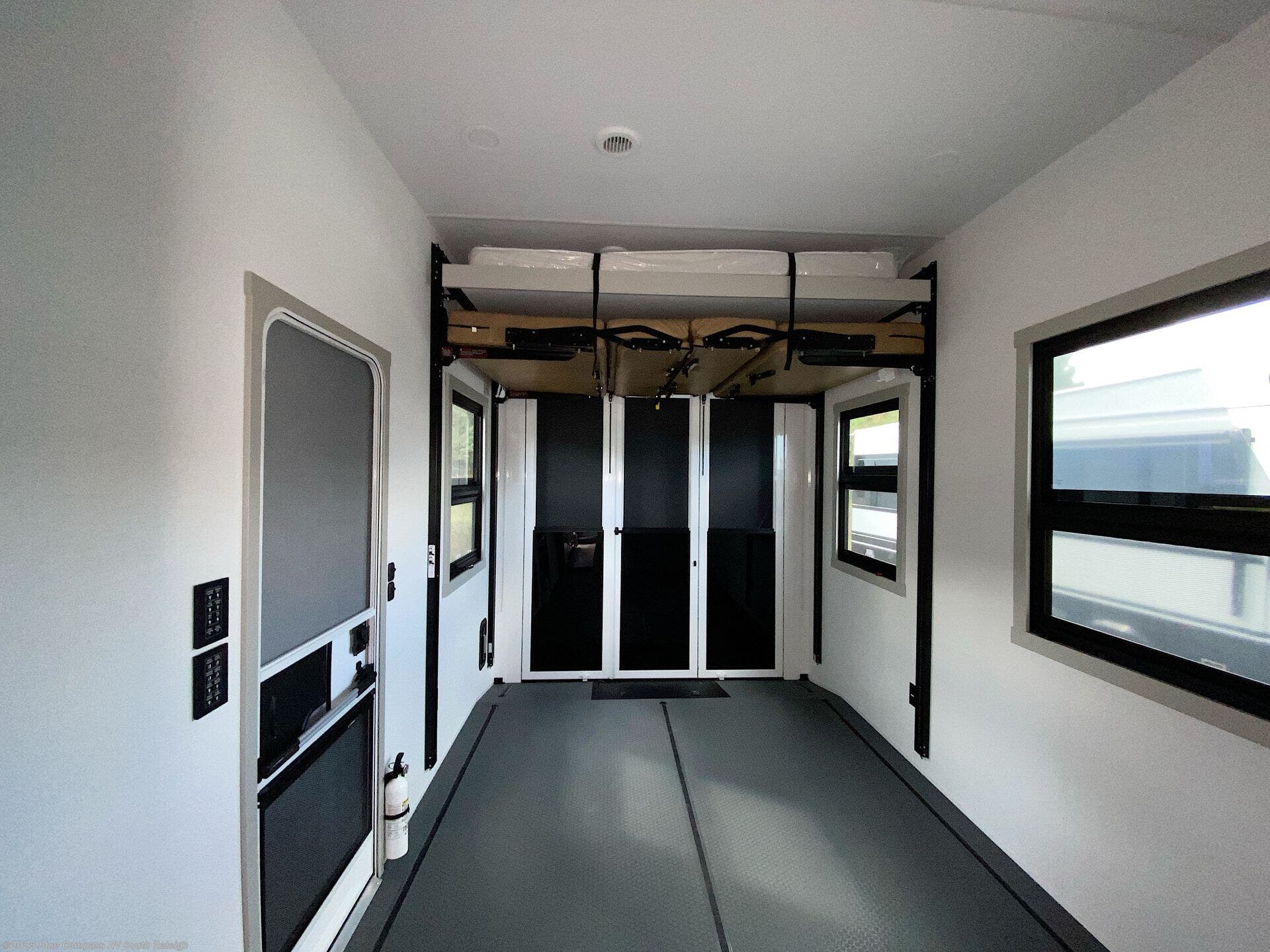 Prepare to be amazed by all the features packed into this toy hauler! There are triple slides that will provide your crew with more space, a 16' separate garage flex area that can sleep five with the loft included, plus a bath and a half for added convenience. The chef in your group will love the middle kitchen with a waterfall island that converts to a counter peninsula, a pull-out pantry, a GE Energy Star 19 cu. ft. refrigerator with ice and filtered water, and much more. In the combined kitchen and living area you'll find a spacious sofa with heat and massage, a fireplace, a TV, plus convenient dog bowls and shoe storage. After your toys are unloaded from the garage, you can relax on the independent dual couches with a Fold-N-Stow table in between. You will find the front private bedroom with a king bed slide out will provide a great night's rest, and you'll also find a walk-in closet, under-bed storage, and a sliding dresser top with hidden storage for special belongings.