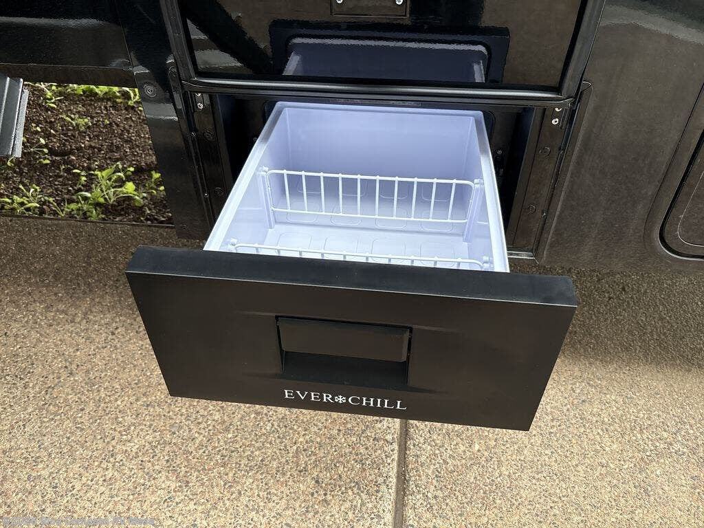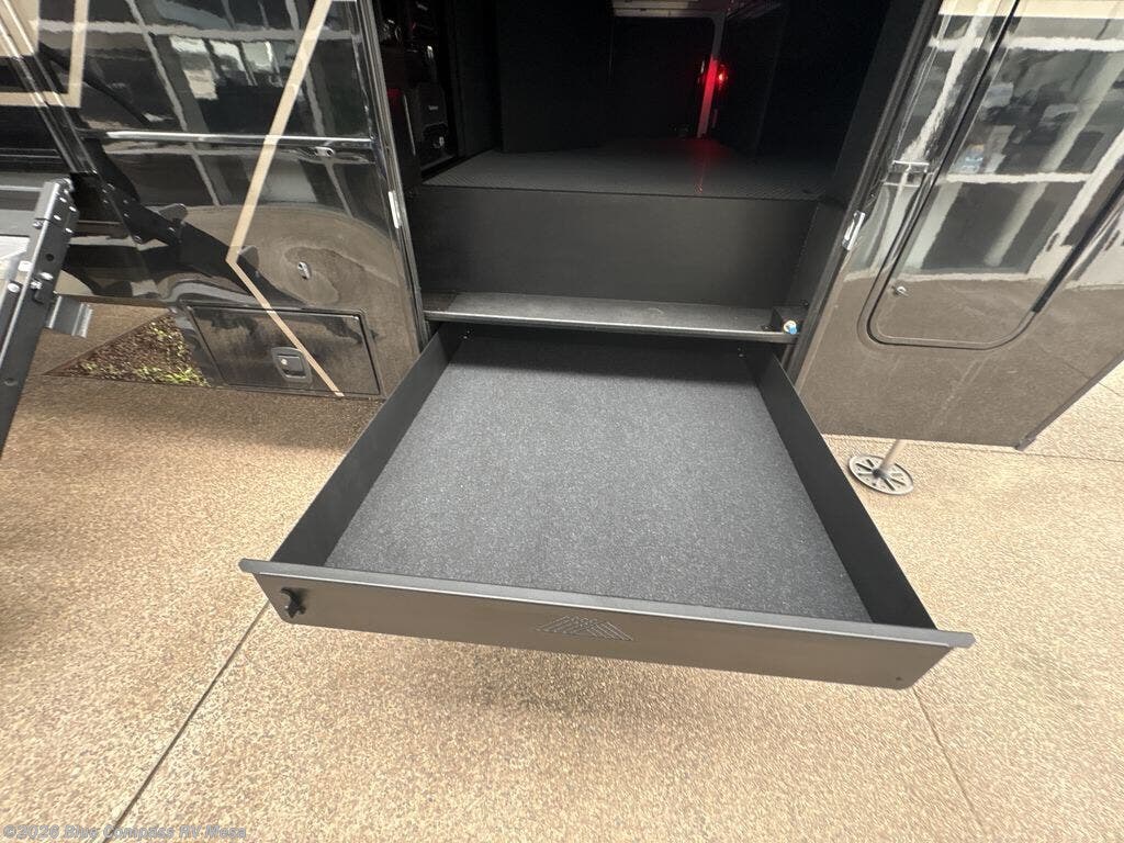 Prepare to be amazed by all the features packed into this toy hauler! There are triple slides that will provide your crew with more space, a 16' separate garage flex area that can sleep five with the loft included, plus a bath and a half for added convenience. The chef in your group will love the middle kitchen with a waterfall island that converts to a counter peninsula, a pull-out pantry, a GE Energy Star 19 cu. ft. refrigerator with ice and filtered water, and much more. In the combined kitchen and living area you'll find a spacious sofa with heat and massage, a fireplace, a TV, plus convenient dog bowls and shoe storage. After your toys are unloaded from the garage, you can relax on the independent dual couches with a Fold-N-Stow table in between. You will find the front private bedroom with a king bed slide out will provide a great night's rest, and you'll also find a walk-in closet, under-bed storage, and a sliding dresser top with hidden storage for special belongings.