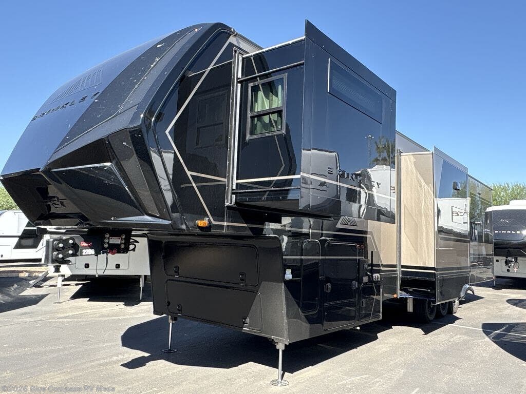 With any Model G toy hauler fifth wheel by Brinkley you will enjoy luxurious amenities, tons of storage space, and innovative features that have been developed and tested in the real world. Durable construction includes an industry leading PDI process, an industry best insulation package, and reinforced and walkable slide roofs. Some of the exterior features you'll find are a 3-way pass-through with a multi-functional flip-up bulkhead wall, under I-beam storage, a MAX-Vision reverse lighting system, and a low-maintenance roof to name a few. A Rockford Fosgate audio system comes standard, along with a OneControl app system that lets you control your fifth wheel's functions right from your mobile device. You will find the solar system with a designated storage area to be ultra convenient, plus there is a FlexPower 5500 with a dual fuel inverter generator for all your power needs. Head inside to find a residential interior with Brinkley's CraftSense wood trim construction, floating entrance steps, integrated window screens and insulated blackout blinds, and residential solid surface countertops plus backsplash. You will also enjoy the neon shower lighting and recessed medicine cabinets in the bath, plus motion activated LED bed lights and dual bedside outlets in the bedroom. Choose a Model G toy hauler fifth wheel to experience all the luxury it has to offer!