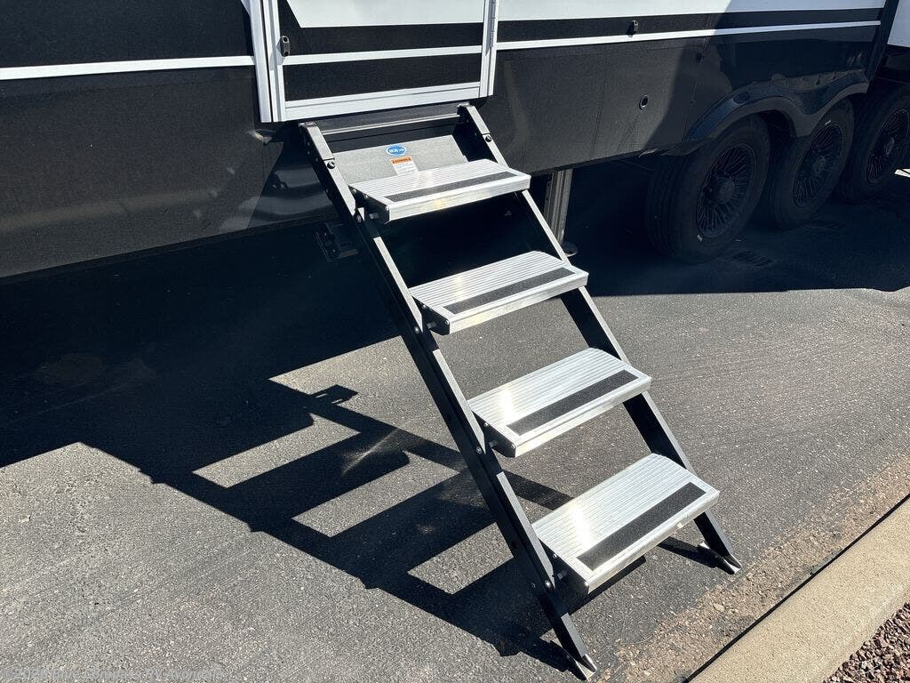 Prepare to be amazed by all the features packed into this toy hauler! There are triple slides that will provide your crew with more space, a 16' separate garage flex area that can sleep five with the loft included, plus a bath and a half for added convenience. The chef in your group will love the middle kitchen with a waterfall island that converts to a counter peninsula, a pull-out pantry, a GE Energy Star 19 cu. ft. refrigerator with ice and filtered water, and much more. In the combined kitchen and living area you'll find a spacious sofa with heat and massage, a fireplace, a TV, plus convenient dog bowls and shoe storage. After your toys are unloaded from the garage, you can relax on the independent dual couches with a Fold-N-Stow table in between. You will find the front private bedroom with a king bed slide out will provide a great night's rest, and you'll also find a walk-in closet, under-bed storage, and a sliding dresser top with hidden storage for special belongings.
