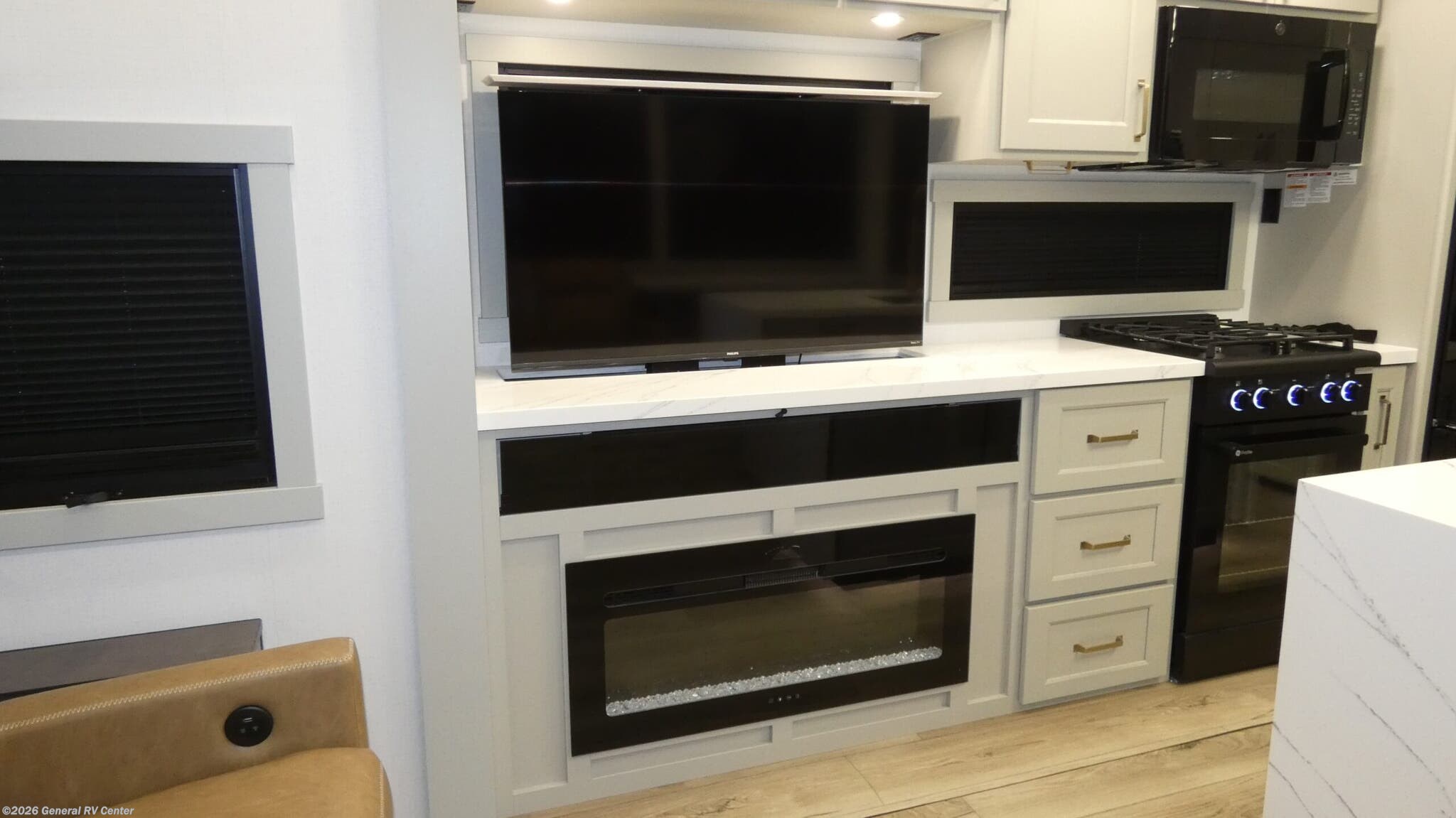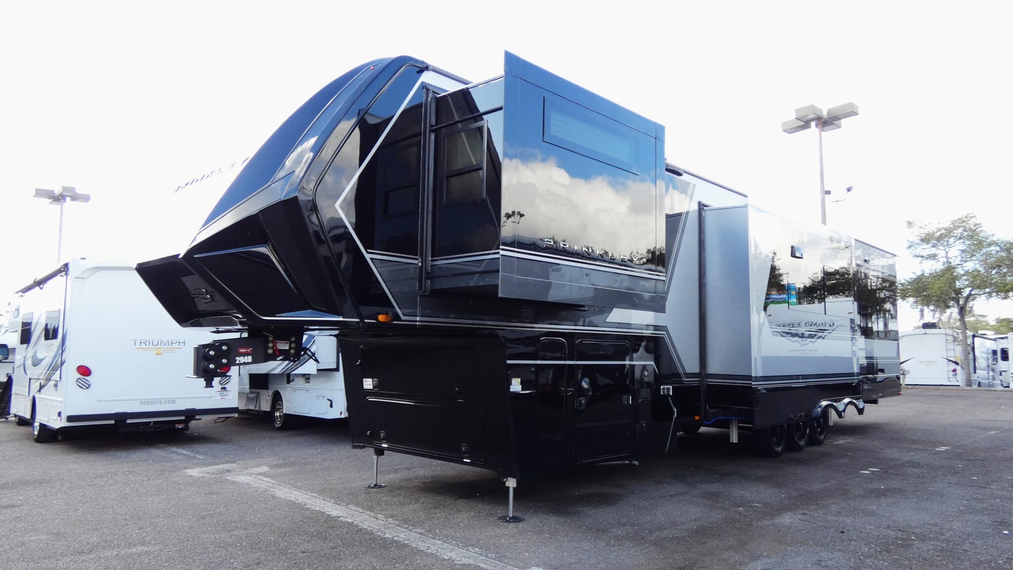 Step into the future of luxury travel with the 2026 Brinkley Model G 4100. This RV is designed to be your home away from home, offering an exquisite blend of comfort and functionality. With its expansive 45.92-foot length, this model provides ample space for the whole family, comfortably sleeping up to seven people. The sleeping arrangements include a cozy queen bed, a luxurious king bed, and a versatile convertible bed, ensuring everyone has their own space to unwind after a day of adventure. The heart of this RV is its center kitchen, equipped with a full-size electric refrigerator and a four-burner cooktop, perfect for preparing gourmet meals on the road. The spacious center living area is ideal for relaxing or entertaining, while the center bath features a sleek plastic and glass shower, offering a refreshing retreat. With three slides and three powered retractable awnings, the Model G 4100 maximizes both indoor and outdoor living spaces. Plus, the inclusion of a washer and dryer means you can enjoy extended trips without sacrificing convenience. Whether you're planning a weekend getaway or an extended road trip, the Brinkley Model G 4100 is engineered to meet your every need. Its robust water capacities, automatic heater, and thoughtful floorplan features ensure you're always ready for the next adventure. Experience the pinnacle of RV living with Brinkley, and discover why this model is the perfect choice for those who crave both luxury and practicality. For more information, visit your nearest General RV dealership.