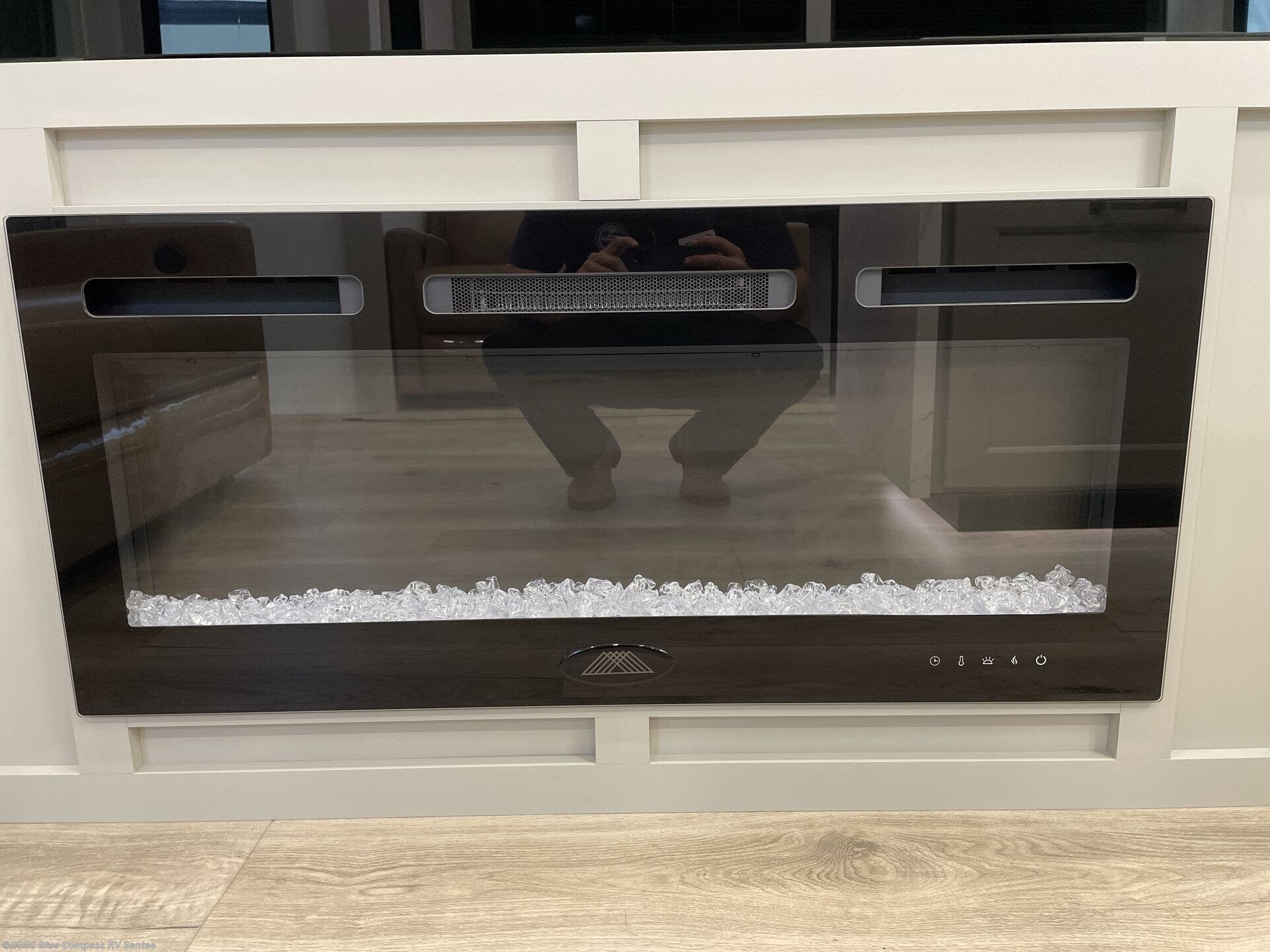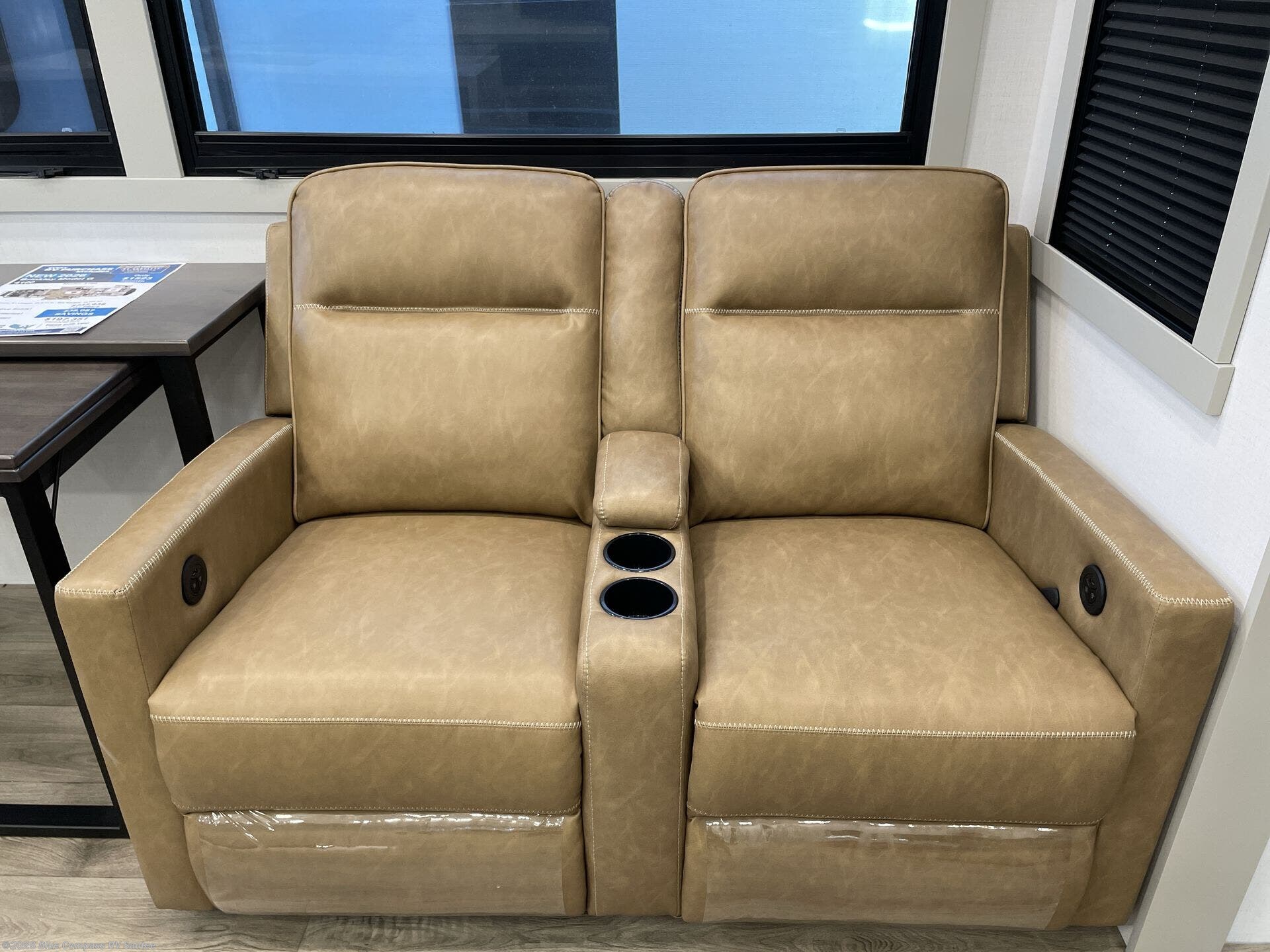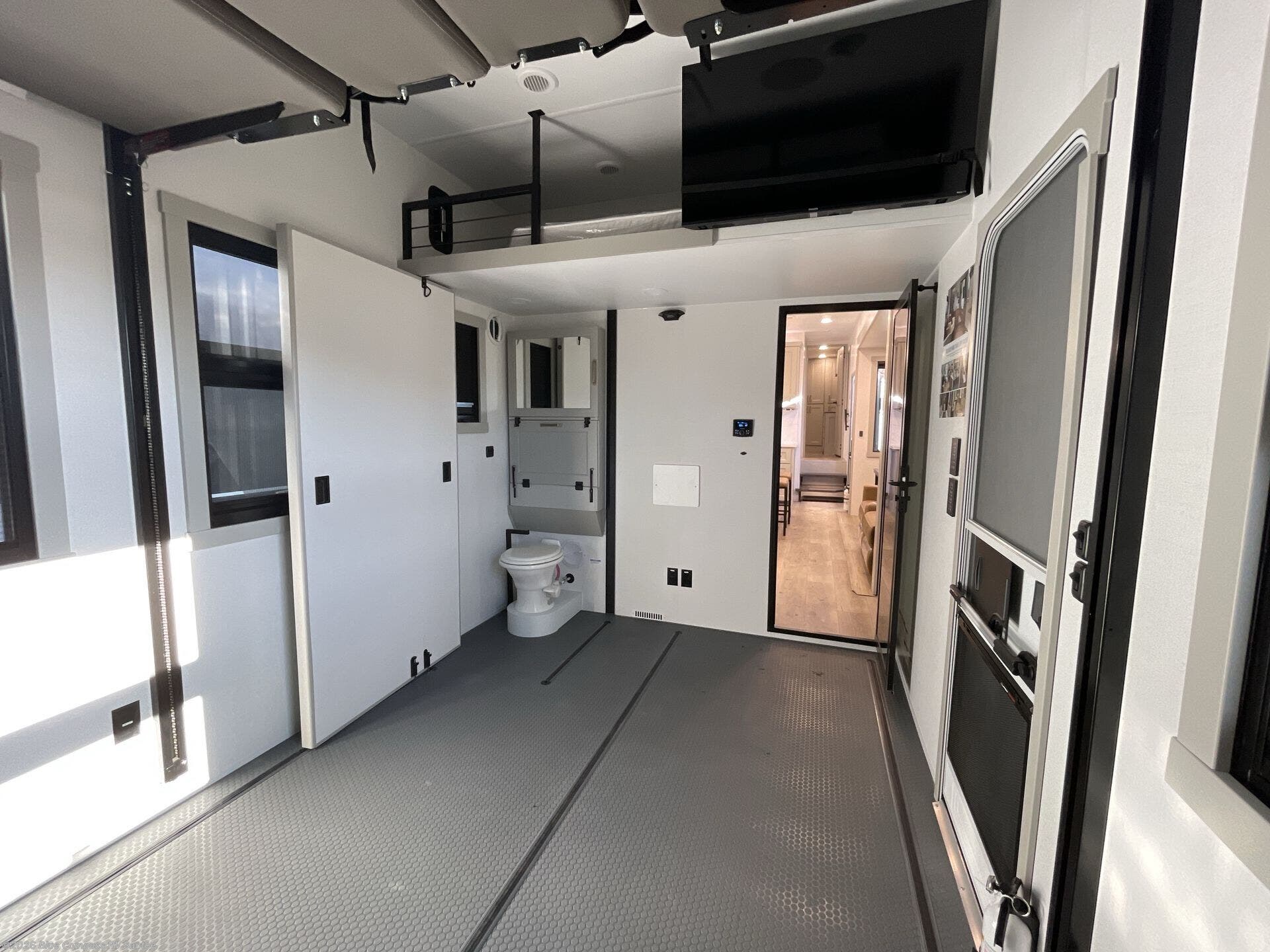 The front bedroom is a serene retreat, featuring a plush king bed, spacious walk-in closet, 32” smart TV, sliding dresser top, and hidden storage for better organization. The bathroom is a haven of convenience, boasting a full bathroom with pull-out linen and trash bin, and a spacious 30" x 42" shower. The kitchen has a pantry featuring adjustable shelving, a hutch, 19 cu. refrigerator, microwave, four-burner cooktop, kitchen island, and convertible dining table/L-desk. Gather with family and friends in the living room, which features a dual sofa with two recliners, each with heat and massage functions, a televator, and a cozy fireplace. The garage has a half bathroom, two sofas, and a 43” smart TV, ideal for game days, movie nights, or just relaxing with friends. Outside, enjoy the convenience of a fuel station, three-way pass-thru storage, and LP quick connect. Whether you're an adventure-seeker, or just love to travel in style, this toy hauler has everything you need and more!