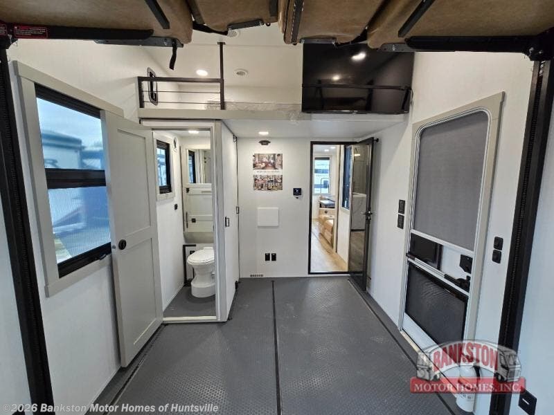 The front bedroom is a serene retreat, featuring a plush king bed, spacious walk-in closet, 32” smart TV, sliding dresser top, and hidden storage for better organization.The bathroom is a haven of convenience, boasting a full bathroom with pull-out linen and trash bin, and a spacious 30 x 42 shower. Perfect for freshening up after a long day of adventure! The kitchen has a pantry featuring adjustable shelving, a hutch, 19 cu. refrigerator, microwave, four-burner cooktop, kitchen island, and convertible dining table/L-desk. Plus, pet bowls for your furry friends! Gather with family and friends in the living room, which features a dual sofa with two recliners, each with heat and massage functions, a televator, and a cozy fireplace. It's the perfect spot to relax and unwind! The garage has a half bathroom, two sofas, and a 43” smart TV, ideal for game days, movie nights, or just relaxing with friends. Outside, enjoy the convenience of a fuel station, three-way pass-thru storage, and LP quick connect. Whether you're an adventure-seeker, or just love to travel in style, this toy hauler has everything you need and more!