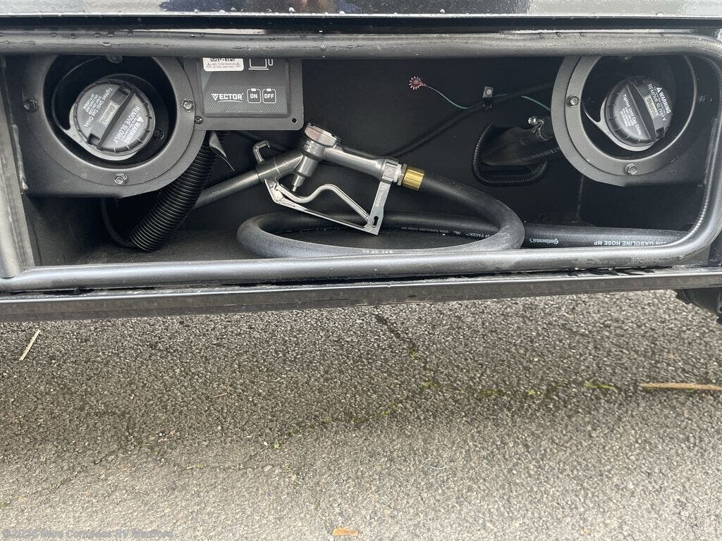 The front bedroom is a serene retreat, featuring a plush king bed, spacious walk-in closet, 32” smart TV, sliding dresser top, and hidden storage for better organization.The bathroom is a haven of convenience, boasting a full bathroom with pull-out linen and trash bin, and a spacious 30 x 42 shower. Perfect for freshening up after a long day of adventure! The kitchen has a pantry featuring adjustable shelving, a hutch, 19 cu. refrigerator, microwave, four-burner cooktop, kitchen island, and convertible dining table/L-desk. Plus, pet bowls for your furry friends! Gather with family and friends in the living room, which features a dual sofa with two recliners, each with heat and massage functions, a televator, and a cozy fireplace. It's the perfect spot to relax and unwind! The garage has a half bathroom, two sofas, and a 43” smart TV, ideal for game days, movie nights, or just relaxing with friends. Outside, enjoy the convenience of a fuel station, three-way pass-thru storage, and LP quick connect. Whether you're an adventure-seeker, or just love to travel in style, this toy hauler has everything you need and more!