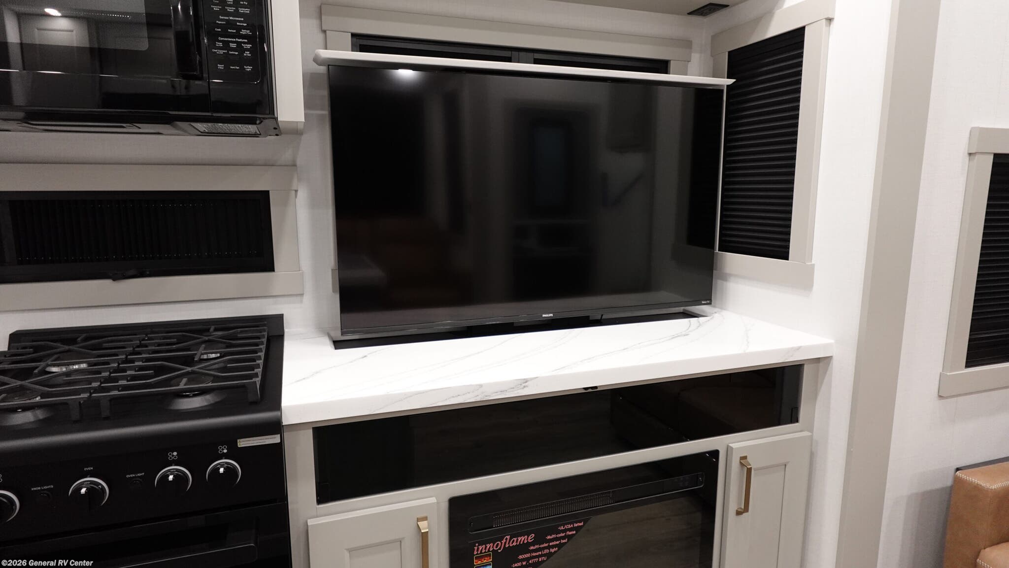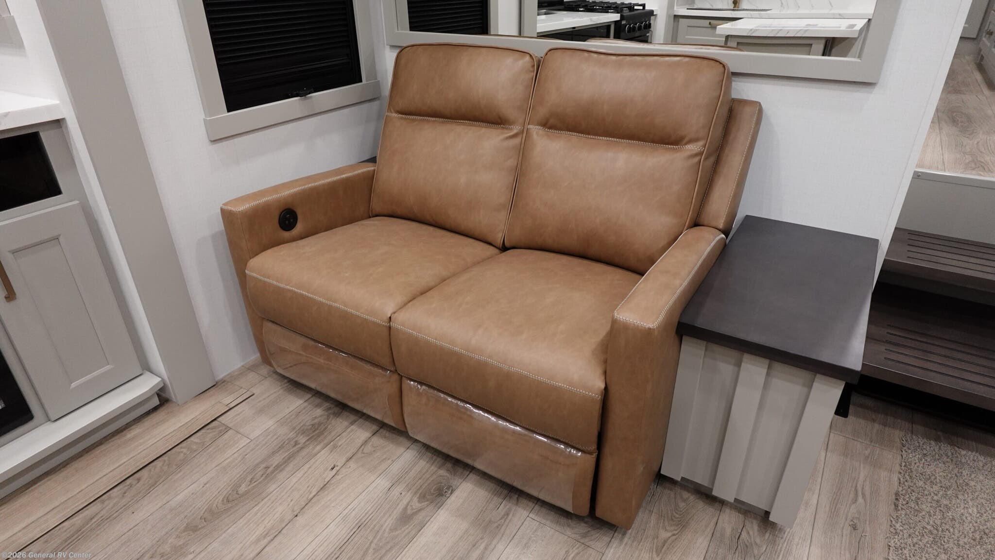 **Brinkley Model G toy hauler 4120 highlights:** * Waterfall Island Converts to Peninsula * King Bed Slide Out * Dual 2x Recliners * Loft/Storage * Large 17' 0" Garage Load up your favorite riding toys and head for the trails in this spacious toy hauler with tons of cargo space! Once the bikes are out, you can relax on the independent dual sofas with a Fold-N Stow Table between or utilize the drop-down bed for a rest. The garage also includes a max-space half bath with fold-away walls and a sink plus a loft/storage for extra sleeping or storage space! Head to the combined kitchen and living area that features dual 2x recliners with heat and massage, dual opposing slides, plus a televator TV and fireplace. The chef of your group will appreciate the waterfall island that converts to a peninsula for more prep space, along with a spice rack and a pull-down utensil tray and knife rack! The spacious full bath includes a residential shower, a space saver door, a solid surface countertop and many more comforts. Last but not least, the front private bedroom will be your own oasis each night that features a king bed slide out, underbed storage drawers and motion lights, a dresser with hidden storage, plus a walk-in closet with cordless vacuum prep and washer/dryer prep! With any Model G toy hauler fifth wheel by Brinkley you will enjoy luxurious amenities, tons of storage space, and innovative features that have been developed and tested in the real world. Durable construction includes an industry leading PDI process, an industry best insulation package, and reinforced and walkable slide roofs. Some of the exterior features you'll find are a 3-way pass-through with a multi-functional flip-up bulkhead wall, under I-beam storage, a MAX-Vision reverse lighting system, and a low-maintenance roof to name a few. A Rockford Fosgate audio system comes standard, along with a Full app-based coach control system (iOS Android) that lets you control your fifth wheel's functions right from your mobile device. You will find the solar system with a designated storage area to be ultra convenient, plus there is a FlexPower 5500 with a dual fuel inverter generator for all your power needs. Head inside to find a residential interior with Brinkley's CraftSense wood trim construction, floating entrance steps, integrated window screens and insulated blackout blinds, and residential solid surface countertops plus backsplash. You will also enjoy the neon shower lighting and recessed medicine cabinets in the bath, plus motion activated LED bed lights and dual bedside outlets in the bedroom. Choose a Model G toy hauler fifth wheel to experience all the luxury it has to offer!