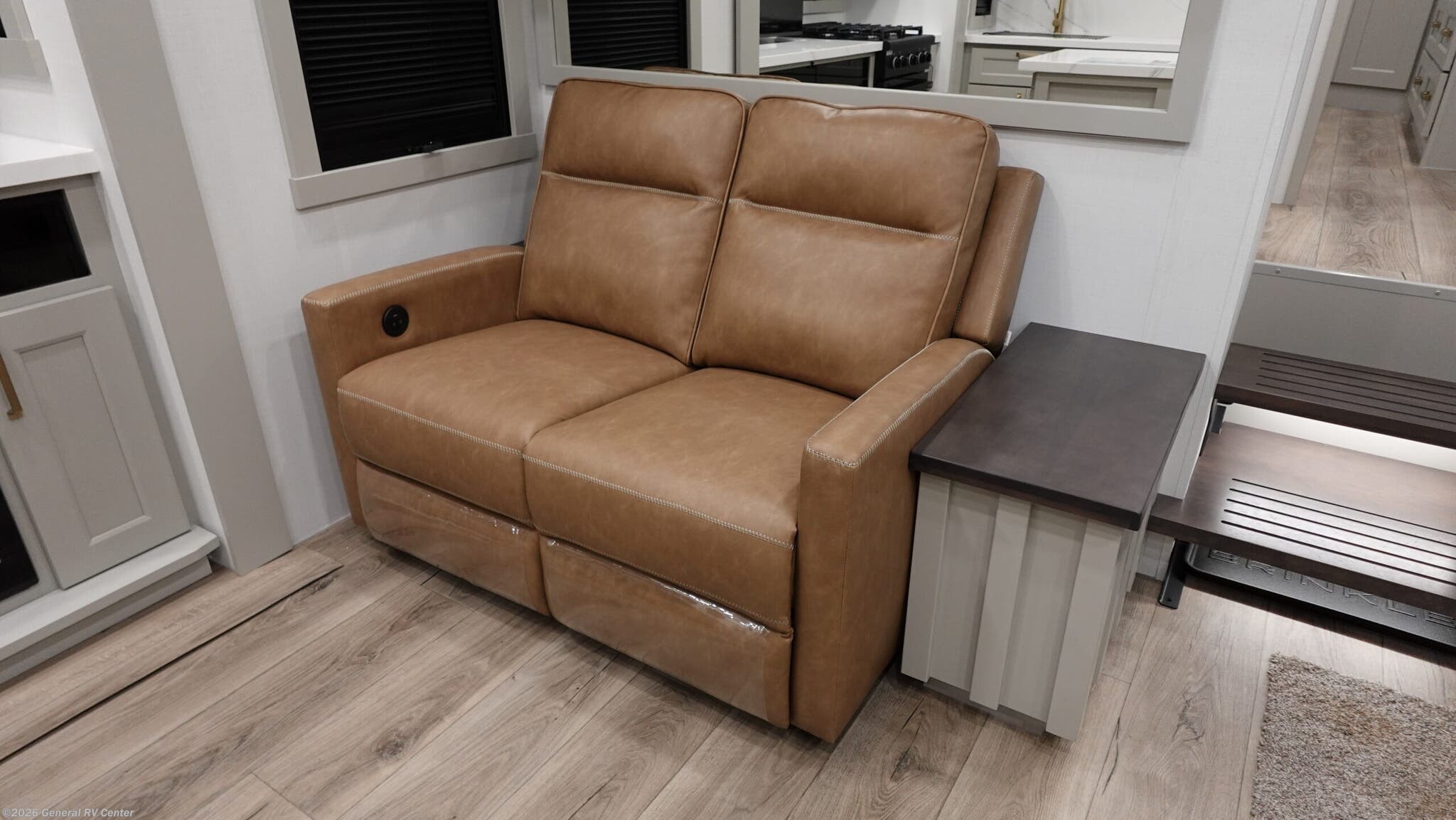 Brinkley Model G toy hauler 4120 highlights: Waterfall Island Converts to Peninsula King Bed Slide Out Dual 2x Recliners Loft/Storage Large 17' 0" Garage Load up your favorite riding toys and head for the trails in this spacious toy hauler with tons of cargo space! Once the bikes are out, you can relax on the independent dual sofas with a Fold-N Stow Table between or utilize the drop-down bed for a rest. The garage also includes a max-space half bath with fold-away walls and a sink plus a loft/storage for extra sleeping or storage space! Head to the combined kitchen and living area that features dual 2x recliners with heat and massage, dual opposing slides, plus a televator TV and fireplace. The chef of your group will appreciate the waterfall island that converts to a peninsula for more prep space, along with a spice rack and a pull-down utensil tray and knife rack! The spacious full bath includes a residential shower, a space saver door, a solid surface countertop and many more comforts. Last but not least, the front private bedroom will be your own oasis each night that features a king bed slide out, underbed storage drawers and motion lights, a dresser with hidden storage, plus a walk-in closet with cordless vacuum prep and washer/dryer prep! With any Model G toy hauler fifth wheel by Brinkley you will enjoy luxurious amenities, tons of storage space, and innovative features that have been developed and tested in the real world. Durable construction includes an industry leading PDI process, an industry best insulation package, and reinforced and walkable slide roofs. Some of the exterior features you'll find are a 3-way pass-through with a multi-functional flip-up bulkhead wall, under I-beam storage, a MAX-Vision reverse lighting system, and a low-maintenance roof to name a few. A Rockford Fosgate audio system comes standard, along with a Full app-based coach control system (iOS Android) that lets you control your fifth wheel's functions right from your mobile device. You will find the solar system with a designated storage area to be ultra convenient, plus there is a FlexPower 5500 with a dual fuel inverter generator for all your power needs. Head inside to find a residential interior with Brinkley's CraftSense wood trim construction, floating entrance steps, integrated window screens and insulated blackout blinds, and residential solid surface countertops plus backsplash. You will also enjoy the neon shower lighting and recessed medicine cabinets in the bath, plus motion activated LED bed lights and dual bedside outlets in the bedroom. Choose a Model G toy hauler fifth wheel to experience all the luxury it has to offer!