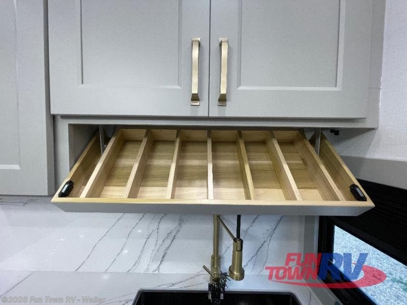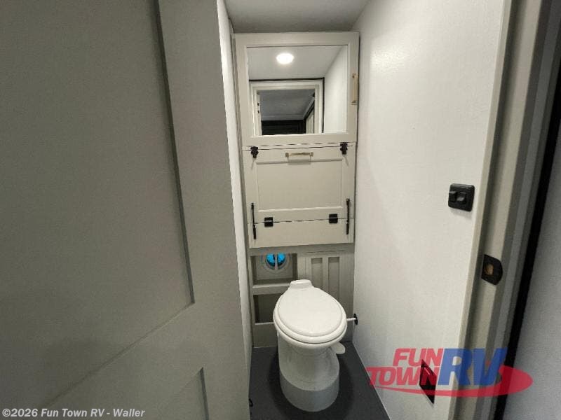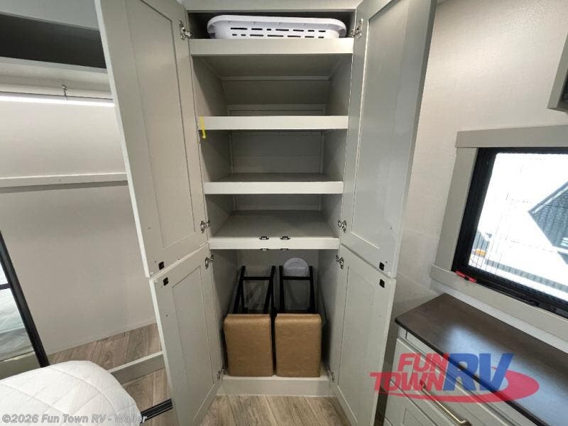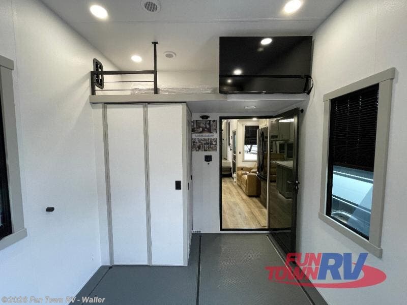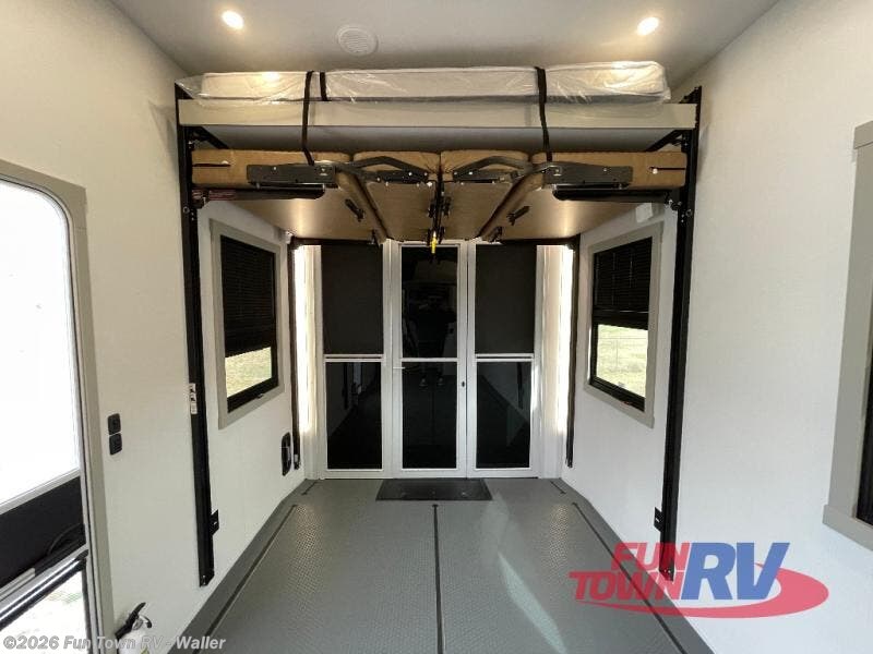 Load up your favorite riding toys and head for the trails in this spacious toy hauler with tons of cargo space! Once the bikes are out, you can relax on the independent dual sofas with a Fold-N Stow Table between or utilize the drop-down bed for a rest. The garage also includes a max-space half bath with fold-away walls and a sink plus a loft/storage for extra sleeping or storage space! Head to the combined kitchen and living area that features dual 2x recliners with heat and massage, dual opposing slides, plus a televator TV and fireplace. The chef of your group will appreciate the waterfall island that converts to a peninsula for more prep space, along with a spice rack and a pull-down utensil tray and knife rack! The spacious full bath includes a residential shower, a space saver door, a solid surface countertop and many more comforts. Last but not least, the front private bedroom will be your own oasis each night that features a king bed slide out, underbed storage drawers and motion lights, a dresser with hidden storage, plus a walk-in closet with cordless vacuum prep and washer/dryer prep!