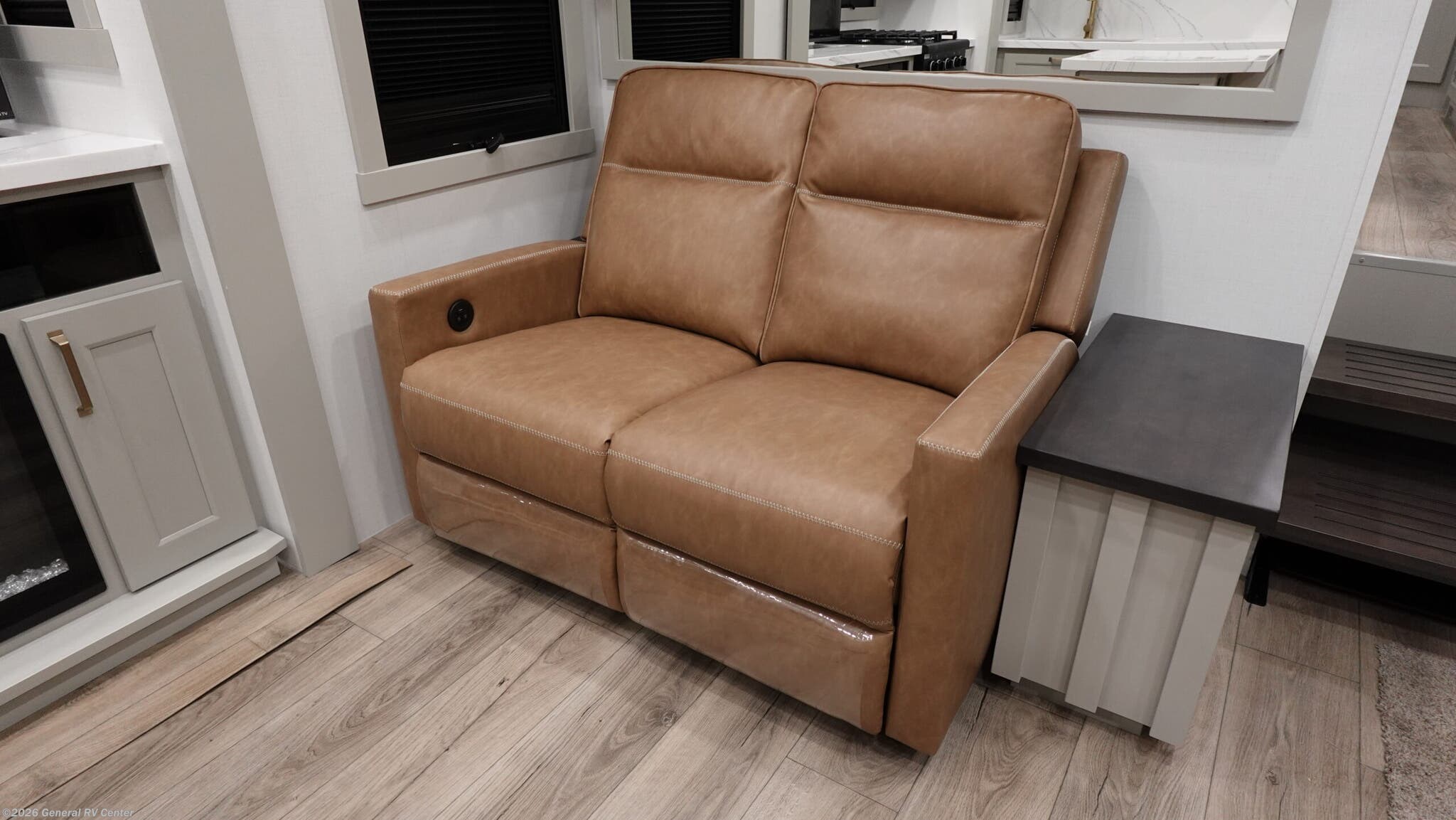 Brinkley Model G toy hauler 4120 highlights: Waterfall Island Converts to Peninsula King Bed Slide Out Dual 2x Recliners Loft/Storage Large 17' 0" Garage Load up your favorite riding toys and head for the trails in this spacious toy hauler with tons of cargo space! Once the bikes are out, you can relax on the independent dual sofas with a Fold-N Stow Table between or utilize the drop-down bed for a rest. The garage also includes a max-space half bath with fold-away walls and a sink plus a loft/storage for extra sleeping or storage space! Head to the combined kitchen and living area that features dual 2x recliners with heat and massage, dual opposing slides, plus a televator TV and fireplace. The chef of your group will appreciate the waterfall island that converts to a peninsula for more prep space, along with a spice rack and a pull-down utensil tray and knife rack! The spacious full bath includes a residential shower, a space saver door, a solid surface countertop and many more comforts. Last but not least, the front private bedroom will be your own oasis each night that features a king bed slide out, underbed storage drawers and motion lights, a dresser with hidden storage, plus a walk-in closet with cordless vacuum prep and washer/dryer prep! With any Model G toy hauler fifth wheel by Brinkley you will enjoy luxurious amenities, tons of storage space, and innovative features that have been developed and tested in the real world. Durable construction includes an industry leading PDI process, an industry best insulation package, and reinforced and walkable slide roofs. Some of the exterior features you'll find are a 3-way pass-through with a multi-functional flip-up bulkhead wall, under I-beam storage, a MAX-Vision reverse lighting system, and a low-maintenance roof to name a few. A Rockford Fosgate audio system comes standard, along with a Full app-based coach control system (iOS & Android) that lets you control your fifth wheel's functions right from your mobile device. You will find the solar system with a designated storage area to be ultra convenient, plus there is a FlexPower 5500 with a dual fuel inverter generator for all your power needs. Head inside to find a residential interior with Brinkley's CraftSense wood trim construction, floating entrance steps, integrated window screens and insulated blackout blinds, and residential solid surface countertops plus backsplash. You will also enjoy the neon shower lighting and recessed medicine cabinets in the bath, plus motion activated LED bed lights and dual bedside outlets in the bedroom. Choose a Model G toy hauler fifth wheel to experience all the luxury it has to offer!