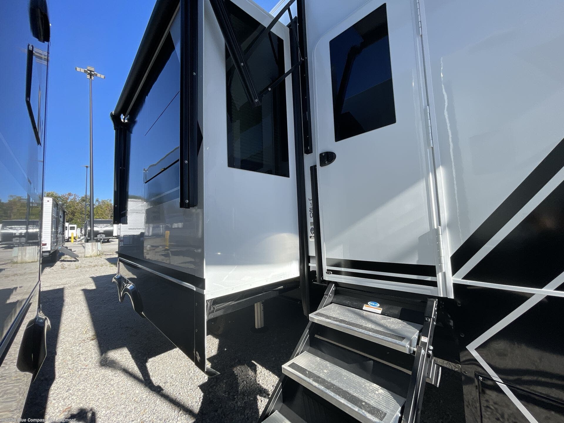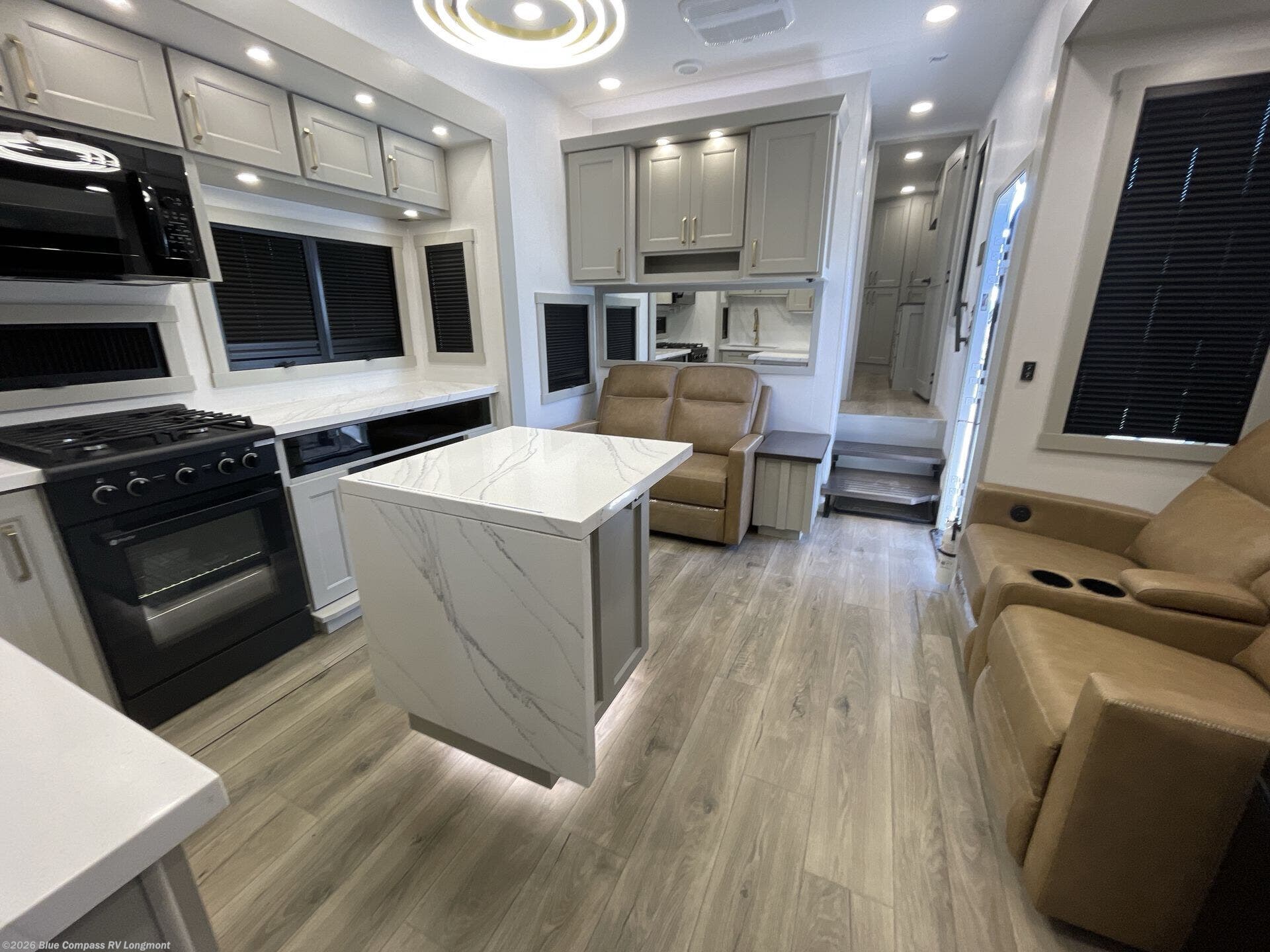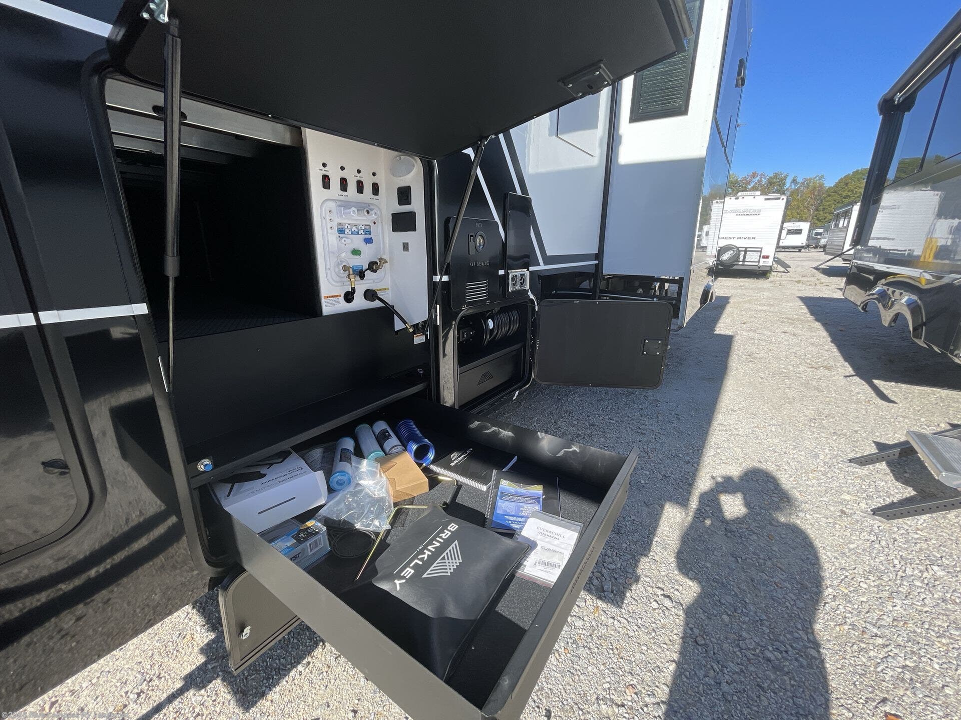 With any Model G toy hauler fifth wheel by Brinkley you will enjoy luxurious amenities, tons of storage space, and innovative features that have been developed and tested in the real world. Durable construction includes an industry leading PDI process, an industry best insulation package, and reinforced and walkable slide roofs. Some of the exterior features you'll find are a 3-way pass-through with a multi-functional flip-up bulkhead wall, under I-beam storage, a MAX-Vision reverse lighting system, and a low-maintenance roof to name a few. A Rockford Fosgate audio system comes standard, along with a Full app-based coach control system (iOS & Android) that lets you control your fifth wheel's functions right from your mobile device. You will find the solar system with a designated storage area to be ultra convenient, plus there is a FlexPower 5500 with a dual fuel inverter generator for all your power needs. Head inside to find a residential interior with Brinkley's CraftSense wood trim construction, floating entrance steps, integrated window screens and insulated blackout blinds, and residential solid surface countertops plus backsplash. You will also enjoy the neon shower lighting and recessed medicine cabinets in the bath, plus motion activated LED bed lights and dual bedside outlets in the bedroom. Choose a Model G toy hauler fifth wheel to experience all the luxury it has to offer!