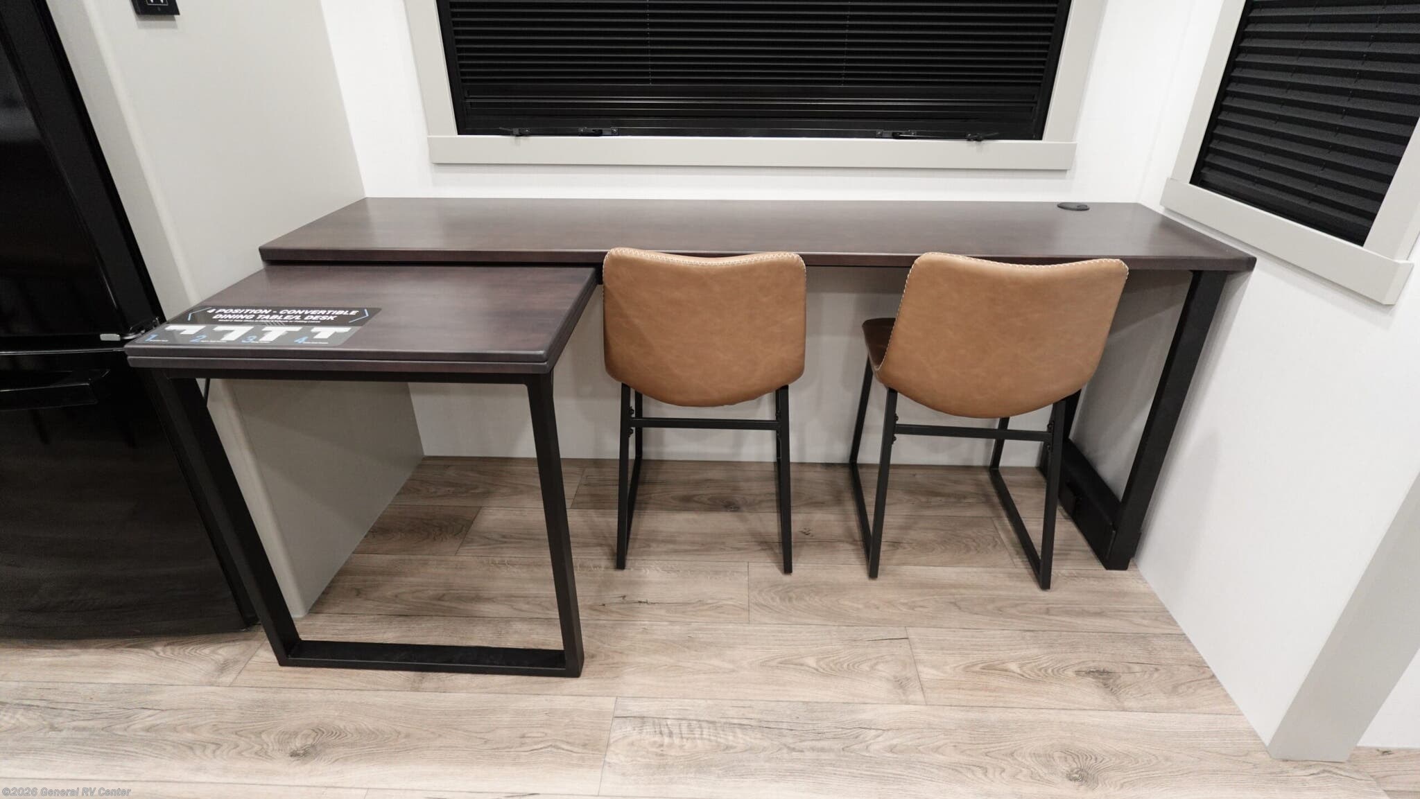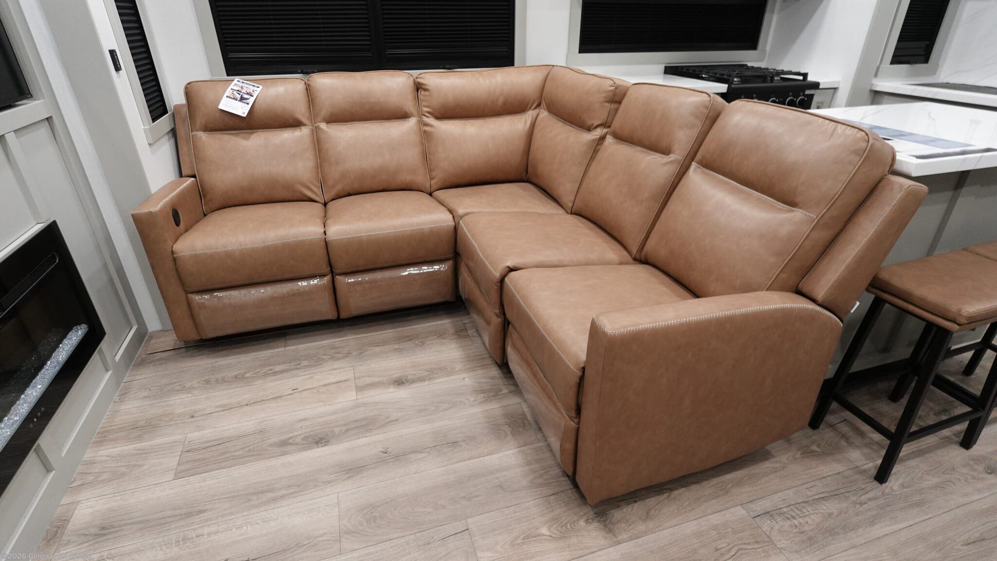 **Brinkley Model G toy hauler 4150 highlights:** - Private Front Office - L-Sofa with 4x Recliners - Pull-Out Pantry/Utility Closet - Loft/Storage - Air Compressor with Retractable Hose - Four Awnings This toy hauler is perfect for those who like to have fun, while still needing an office space to telecommute! The front office includes an adjustable executive L-desk with a hutch and shelves, plus this room is right off of the private bedroom so you can easily get to work in the morning. Once you've made the king-size bed, you can grab your clothes from the dresser with a sliding top, then clean up in the full bathroom. Breakfast can be made on the 24" GE Profile oven with a four-burner range or in the GE Profile convection microwave. The kitchen island includes two stools where you can dine at, or you can sit at the convertible table/L-desk. An L-sofa in the living area sits across an entertainment center with a fireplace, and there is more seating space in the 11' garage. Here, you'll find a loft/storage with a twin bed, a max space half bath with fold-away walls and a sink, plus independent dual sofas with a Fold-N Stow Table and drop-down bed above. With any Model G toy hauler fifth wheel by Brinkley you will enjoy luxurious amenities, tons of storage space, and innovative features that have been developed and tested in the real world. Durable construction includes an industry leading PDI process, an industry best insulation package, and reinforced and walkable slide roofs. Some of the exterior features you'll find are a 3-way pass-through with a multi-functional flip-up bulkhead wall, under I-beam storage, a MAX-Vision reverse lighting system, and a low-maintenance roof to name a few. A Rockford Fosgate audio system comes standard, along with a Full app-based coach control system (iOS & Android) that lets you control your fifth wheel's functions right from your mobile device. You will find the solar system with a designated storage area to be ultra convenient, plus there is a FlexPower 5500 with a dual fuel inverter generator for all your power needs. Head inside to find a residential interior with Brinkley's CraftSense wood trim construction, floating entrance steps, integrated window screens and insulated blackout blinds, and residential solid surface countertops plus backsplash. You will also enjoy the neon shower lighting and recessed medicine cabinets in the bath, plus motion activated LED bed lights and dual bedside outlets in the bedroom. Choose a Model G toy hauler fifth wheel to experience all the luxury it has to offer!