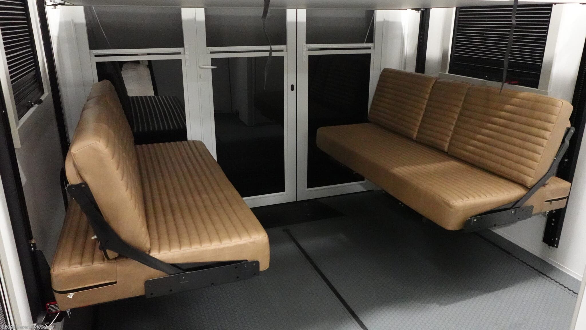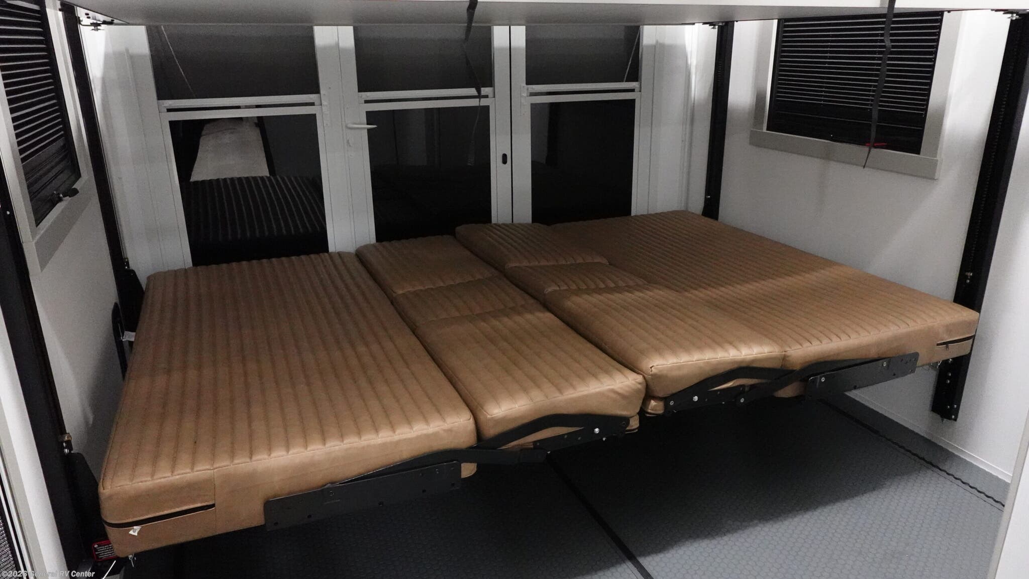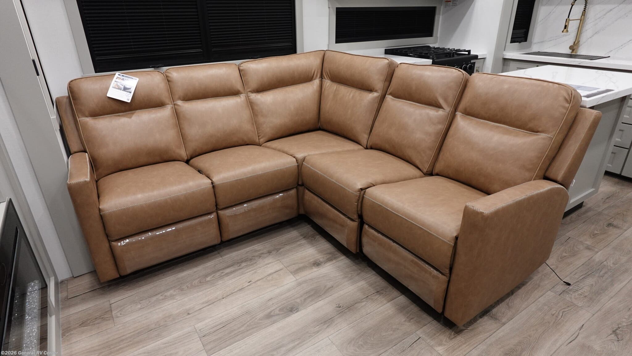 Brinkley Model G toy hauler 4150 highlights: - Private Front Office - L-Sofa with 4x Recliners - Pull-Out Pantry/Utility Closet - Loft/Storage - Air Compressor with Retractable Hose - Four Awnings This toy hauler is perfect for those who like to have fun, while still needing an office space to telecommute! The front office includes an adjustable executive L-desk with a hutch and shelves, plus this room is right off of the private bedroom so you can easily get to work in the morning. Once you've made the king-size bed, you can grab your clothes from the dresser with a sliding top, then clean up in the full bathroom. Breakfast can be made on the 24" GE Profile oven with a four-burner range or in the GE Profile convection microwave. The kitchen island includes two stools where you can dine at, or you can sit at the convertible table/L-desk. An L-sofa in the living area sits across an entertainment center with a fireplace, and there is more seating space in the 11' garage. Here, you'll find a loft/storage with a twin bed, a max space half bath with fold-away walls and a sink, plus independent dual sofas with a Fold-N Stow Table and drop-down bed above. With any Model G toy hauler fifth wheel by Brinkley you will enjoy luxurious amenities, tons of storage space, and innovative features that have been developed and tested in the real world. Durable construction includes an industry leading PDI process, an industry best insulation package, and reinforced and walkable slide roofs. Some of the exterior features you'll find are a 3-way pass-through with a multi-functional flip-up bulkhead wall, under I-beam storage, a MAX-Vision reverse lighting system, and a low-maintenance roof to name a few. A Rockford Fosgate audio system comes standard, along with a Full app-based coach control system (iOS & Android) that lets you control your fifth wheel's functions right from your mobile device. You will find the solar system with a designated storage area to be ultra convenient, plus there is a FlexPower 5500 with a dual fuel inverter generator for all your power needs. Head inside to find a residential interior with Brinkley's CraftSense wood trim construction, floating entrance steps, integrated window screens and insulated blackout blinds, and residential solid surface countertops plus backsplash. You will also enjoy the neon shower lighting and recessed medicine cabinets in the bath, plus motion activated LED bed lights and dual bedside outlets in the bedroom. Choose a Model G toy hauler fifth wheel to experience all the luxury it has to offer!