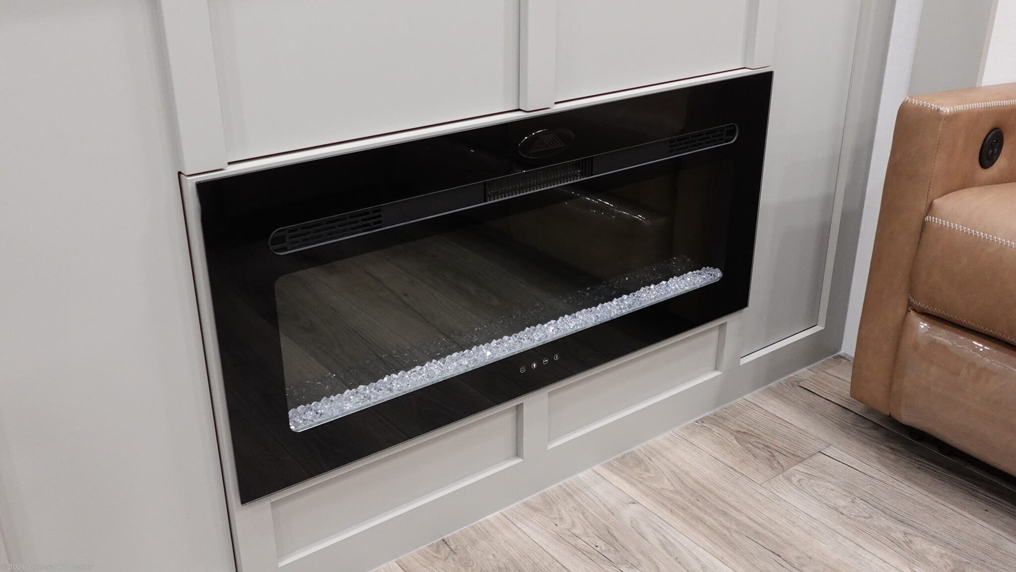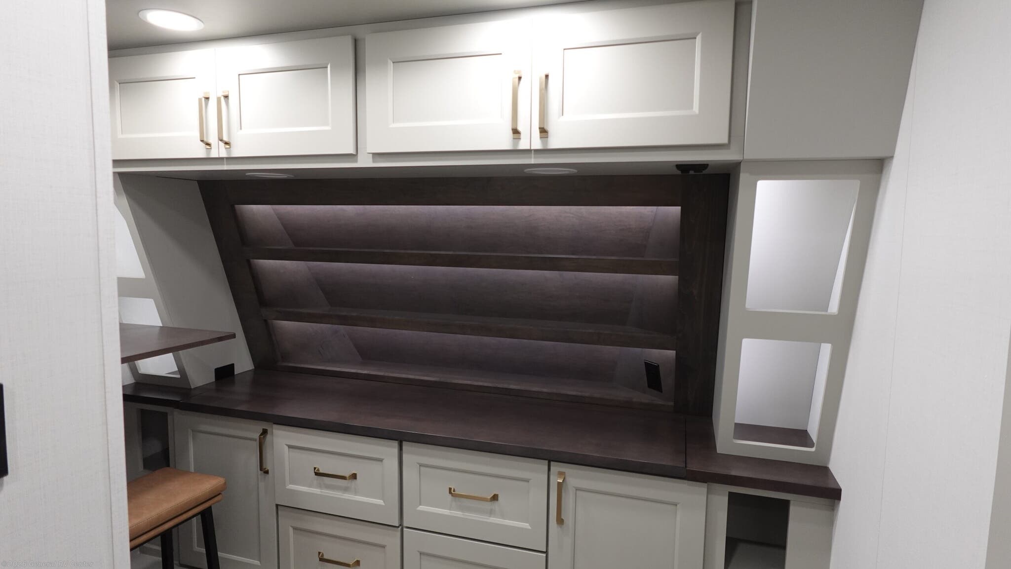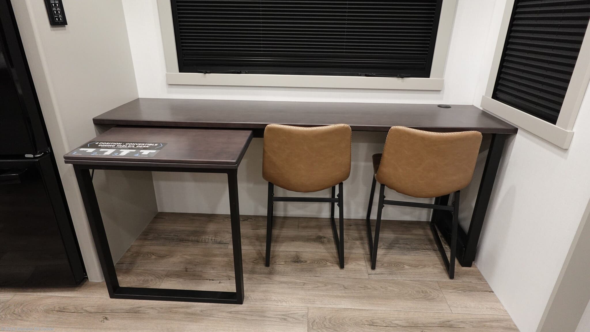 Brinkley Model G toy hauler 4150 highlights: - Private Front Office - L-Sofa with 4x Recliners - Pull-Out Pantry/Utility Closet - Loft/Storage - Air Compressor with Retractable Hose - Four Awnings This toy hauler is perfect for those who like to have fun, while still needing an office space to telecommute! The front office includes an adjustable executive L-desk with a hutch and shelves, plus this room is right off of the private bedroom so you can easily get to work in the morning. Once you've made the king-size bed, you can grab your clothes from the dresser with a sliding top, then clean up in the full bathroom. Breakfast can be made on the 24" GE Profile oven with a four-burner range or in the GE Profile convection microwave. The kitchen island includes two stools where you can dine at, or you can sit at the convertible table/L-desk. An L-sofa in the living area sits across an entertainment center with a fireplace, and there is more seating space in the 11' garage. Here, you'll find a loft/storage with a twin bed, a max space half bath with fold-away walls and a sink, plus independent dual sofas with a Fold-N Stow Table and drop-down bed above. With any Model G toy hauler fifth wheel by Brinkley you will enjoy luxurious amenities, tons of storage space, and innovative features that have been developed and tested in the real world. Durable construction includes an industry leading PDI process, an industry best insulation package, and reinforced and walkable slide roofs. Some of the exterior features you'll find are a 3-way pass-through with a multi-functional flip-up bulkhead wall, under I-beam storage, a MAX-Vision reverse lighting system, and a low-maintenance roof to name a few. A Rockford Fosgate audio system comes standard, along with a Full app-based coach control system (iOS & Android) that lets you control your fifth wheel's functions right from your mobile device. You will find the solar system with a designated storage area to be ultra convenient, plus there is a FlexPower 5500 with a dual fuel inverter generator for all your power needs. Head inside to find a residential interior with Brinkley's CraftSense wood trim construction, floating entrance steps, integrated window screens and insulated blackout blinds, and residential solid surface countertops plus backsplash. You will also enjoy the neon shower lighting and recessed medicine cabinets in the bath, plus motion activated LED bed lights and dual bedside outlets in the bedroom. Choose a Model G toy hauler fifth wheel to experience all the luxury it has to offer!