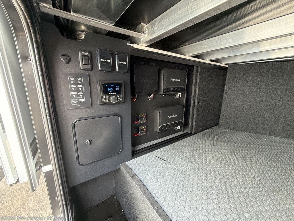 With any Model G toy hauler fifth wheel by Brinkley you will enjoy luxurious amenities, tons of storage space, and innovative features that have been developed and tested in the real world. Durable construction includes an industry leading PDI process, an industry best insulation package, and reinforced and walkable slide roofs. Some of the exterior features you'll find are a 3-way pass-through with a multi-functional flip-up bulkhead wall, under I-beam storage, a MAX-Vision reverse lighting system, and a low-maintenance roof to name a few. A Rockford Fosgate audio system comes standard, along with a Full app-based coach control system (iOS & Android) that lets you control your fifth wheel's functions right from your mobile device. You will find the solar system with a designated storage area to be ultra convenient, plus there is a FlexPower 5500 with a dual fuel inverter generator for all your power needs. Head inside to find a residential interior with Brinkley's CraftSense wood trim construction, floating entrance steps, integrated window screens and insulated blackout blinds, and residential solid surface countertops plus backsplash. You will also enjoy the neon shower lighting and recessed medicine cabinets in the bath, plus motion activated LED bed lights and dual bedside outlets in the bedroom. Choose a Model G toy hauler fifth wheel to experience all the luxury it has to offer!