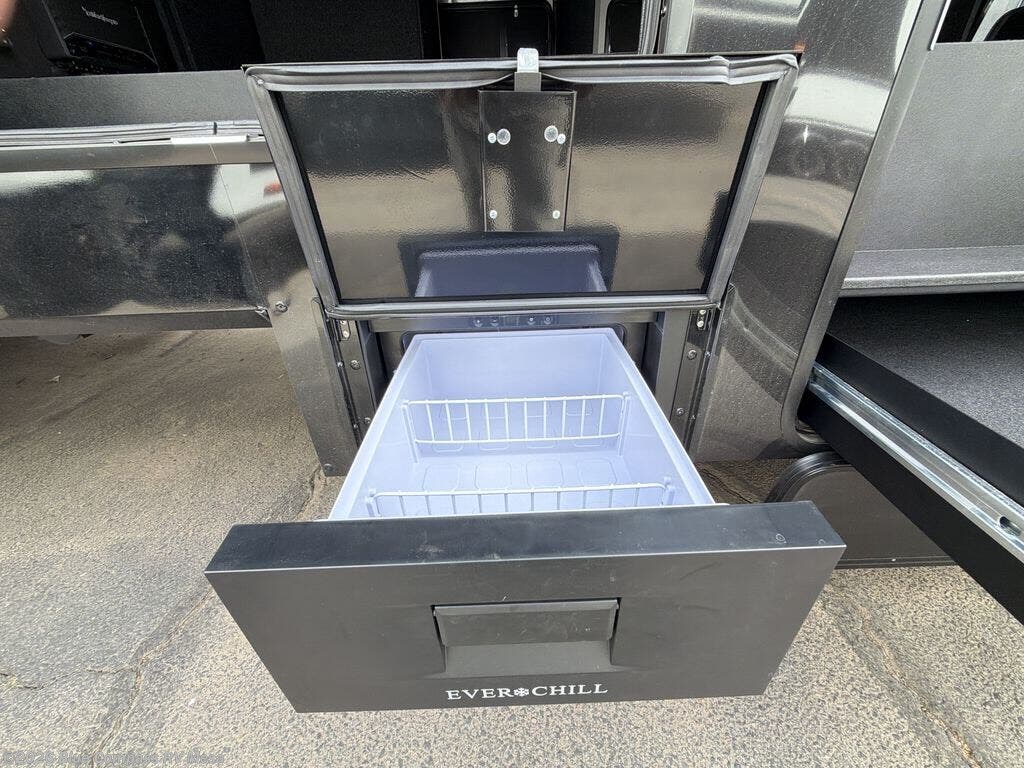 This toy hauler is perfect for those who like to have fun, while still needing an office space to telecommute! The front office includes an adjustable executive L-desk with a hutch and shelves, plus this room is right off of the private bedroom so you can easily get to work in the morning. Once you've made the king-size bed, you can grab your clothes from the dresser with a sliding top, then clean up in the full bathroom. Breakfast can be made on the 24" GE Profile oven with a four-burner range or in the GE Profile convection microwave. The kitchen island includes two stools where you can dine at, or you can sit at the convertible table/L-desk. An L-sofa in the living area sits across an entertainment center with a fireplace, and there is more seating space in the 11' garage. Here, you'll find a loft/storage with a twin bed, a max space half bath with fold-away walls and a sink, plus independent dual sofas with a Fold-N Stow Table and drop-down bed above.